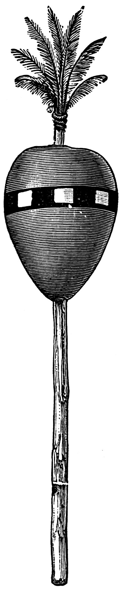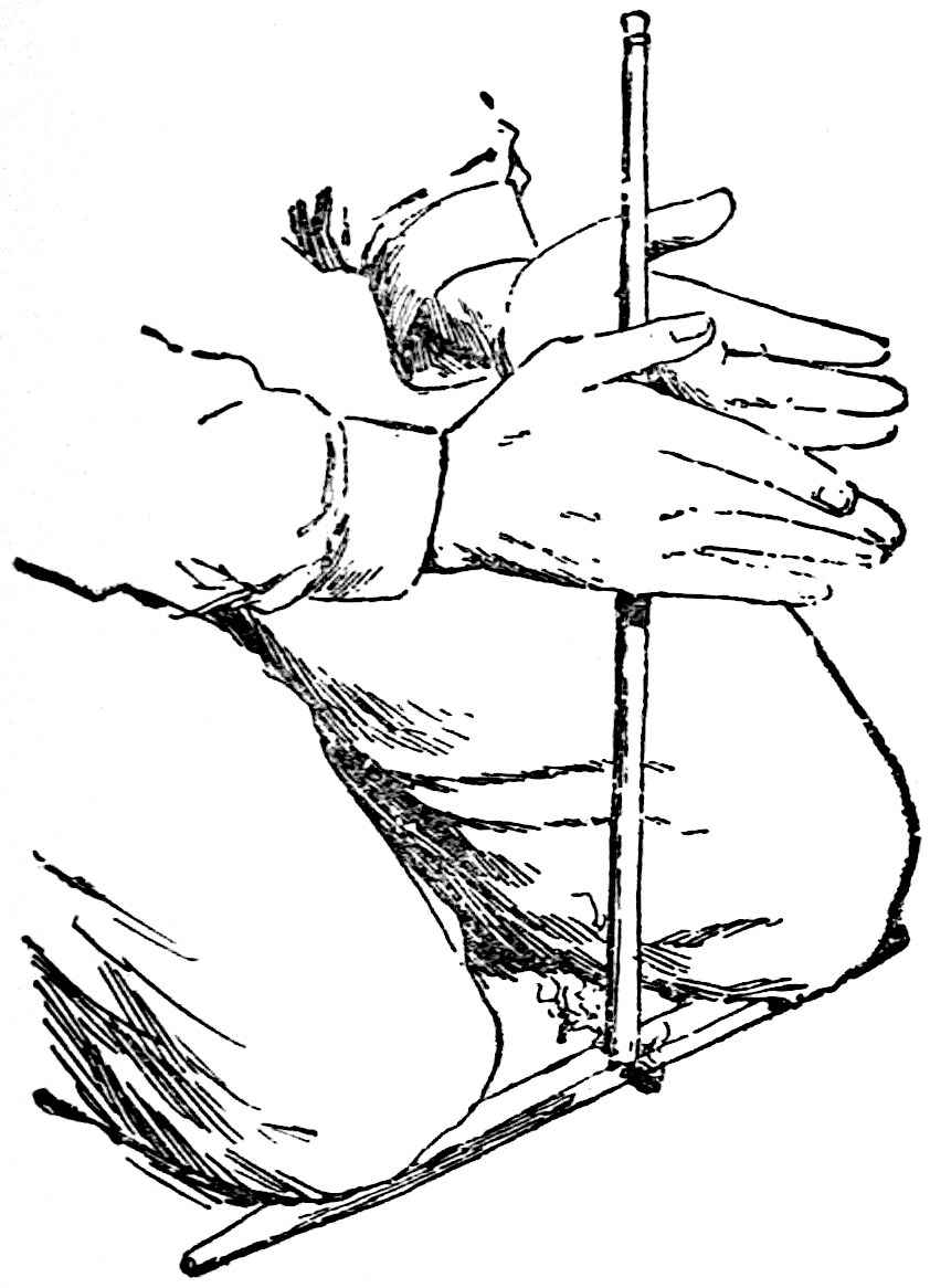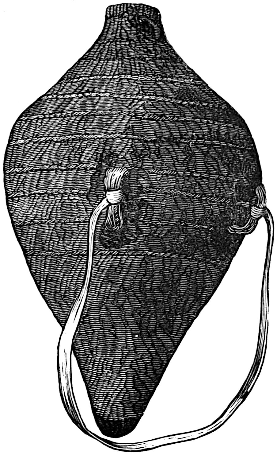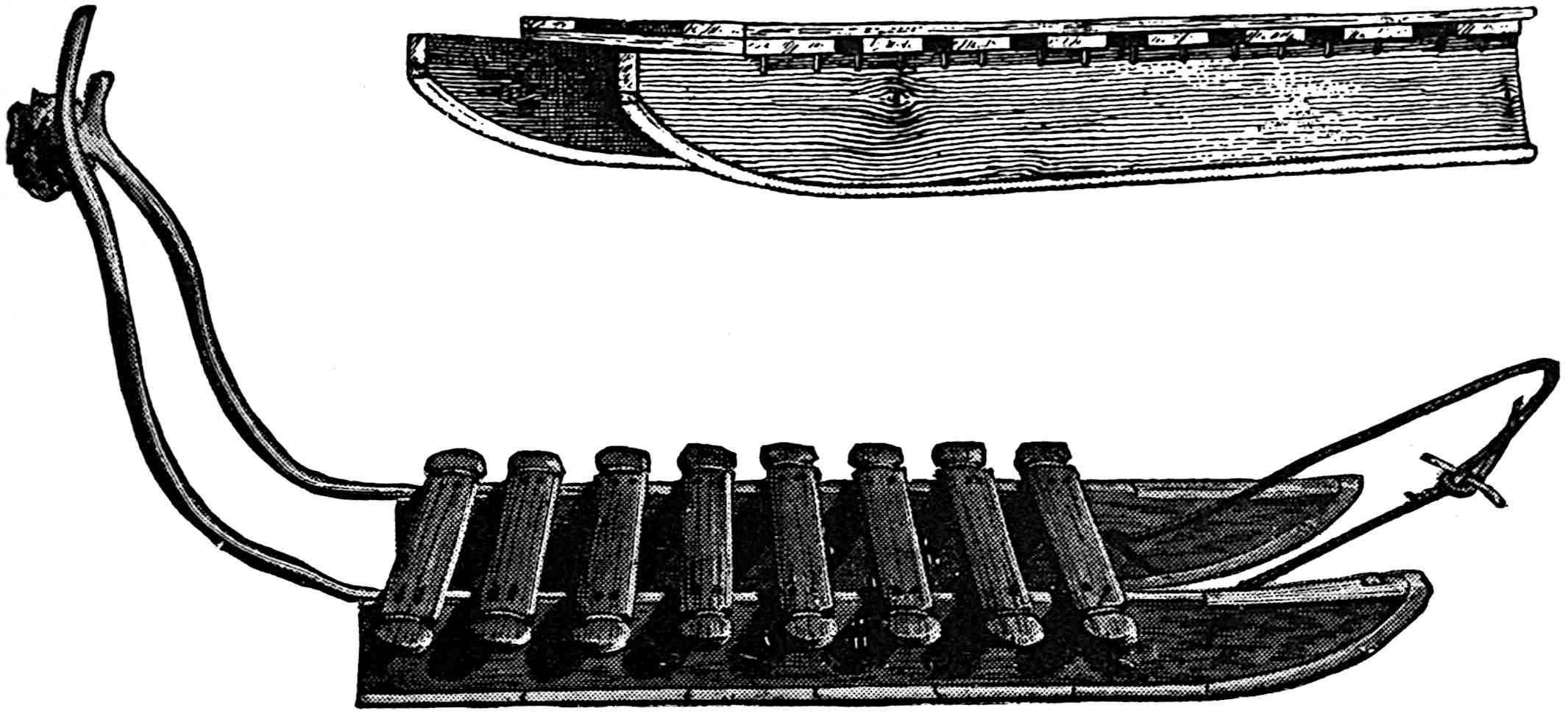 The sounding-board is a gourd with a hole in it. The other end of the brace attached to the bow rests on a stone. The cord of the bow was struck by a stick to produce the desired noise. Found by Lumholtz in use. Length of bow, 1 metre 36.5 centimetres. See page 308; and also article on “Geographical Distribution of the Musical Bow” by O. T. Mason, American Anthropologist, November, 1897; Natural History of the Musical Bow, by Henry Balfour; and “Symbolism of the Huichol Indians,” by Carl Lumholtz, Memoirs of the American Museum, vol. iii, pages 206, 207