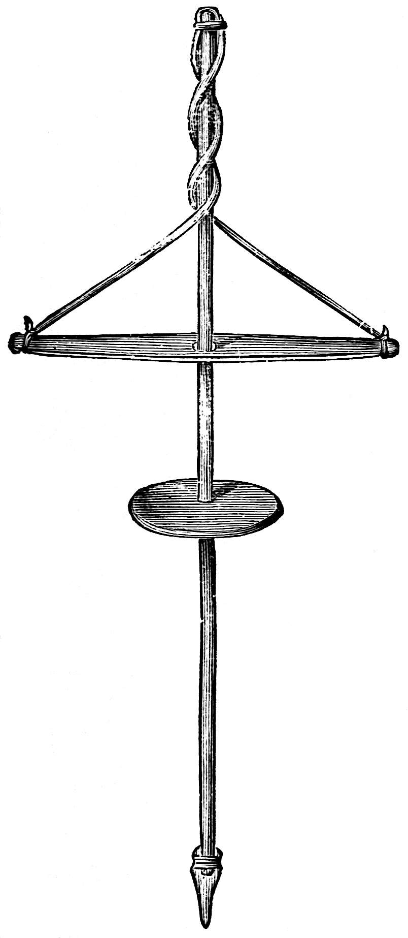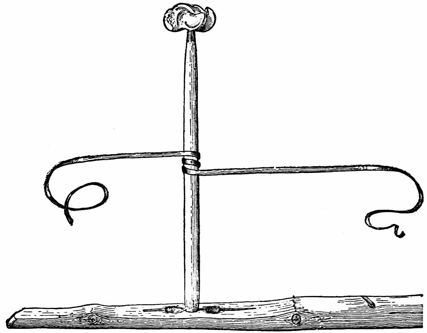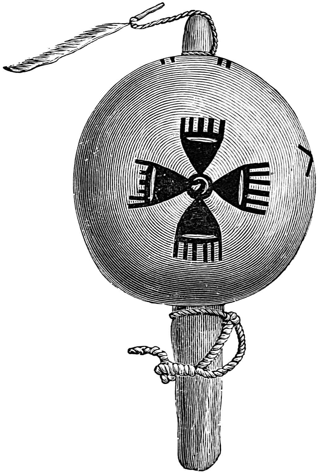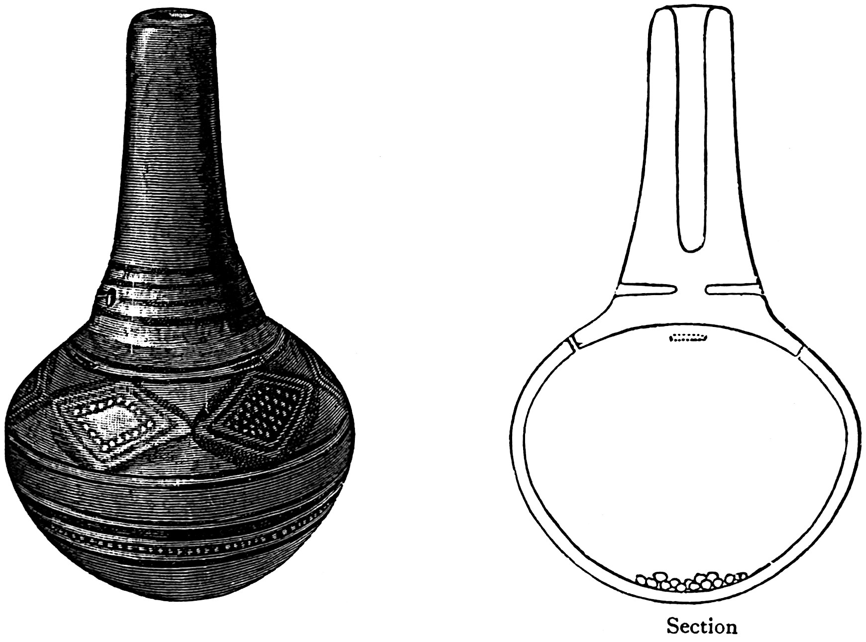 The sounding-board is a gourd with a hole in it. The other end of the brace attached to the bow rests on a stone. The cord of the bow was struck by a stick to produce the desired noise. Found by Lumholtz in use. Length of bow, 1 metre 36.5 centimetres. See page 308; and also article on “Geographical Distribution of the Musical Bow” by O. T. Mason, American Anthropologist, November, 1897; Natural History of the Musical Bow, by Henry Balfour; and “Symbolism of the Huichol Indians,” by Carl Lumholtz, Memoirs of the American Museum, vol. iii, pages 206, 207