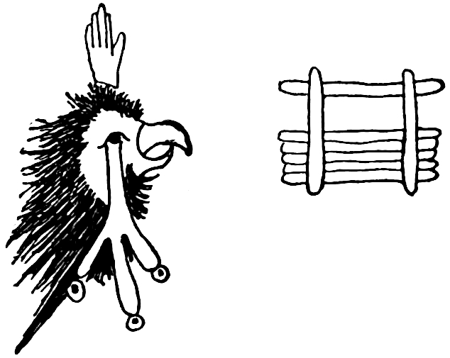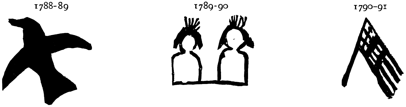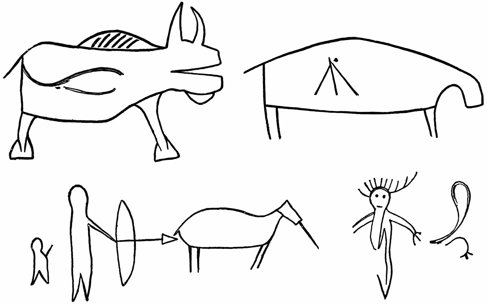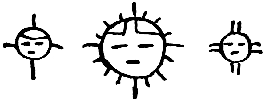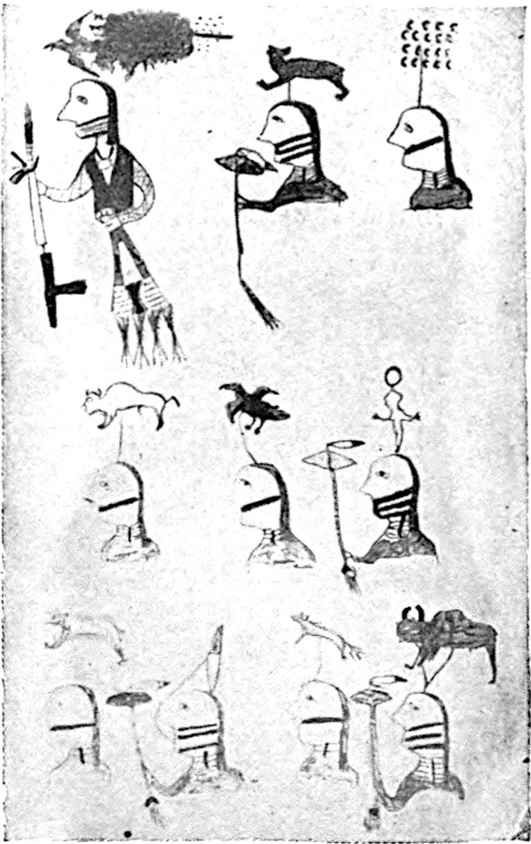 There are sixty of these figures painted on the sticks. Each one recalls to the memory of those who have become acquainted with the associated idea, that special idea, and as an example nine of the signs are given here in connection with the associated idea, and also with the translation into English.