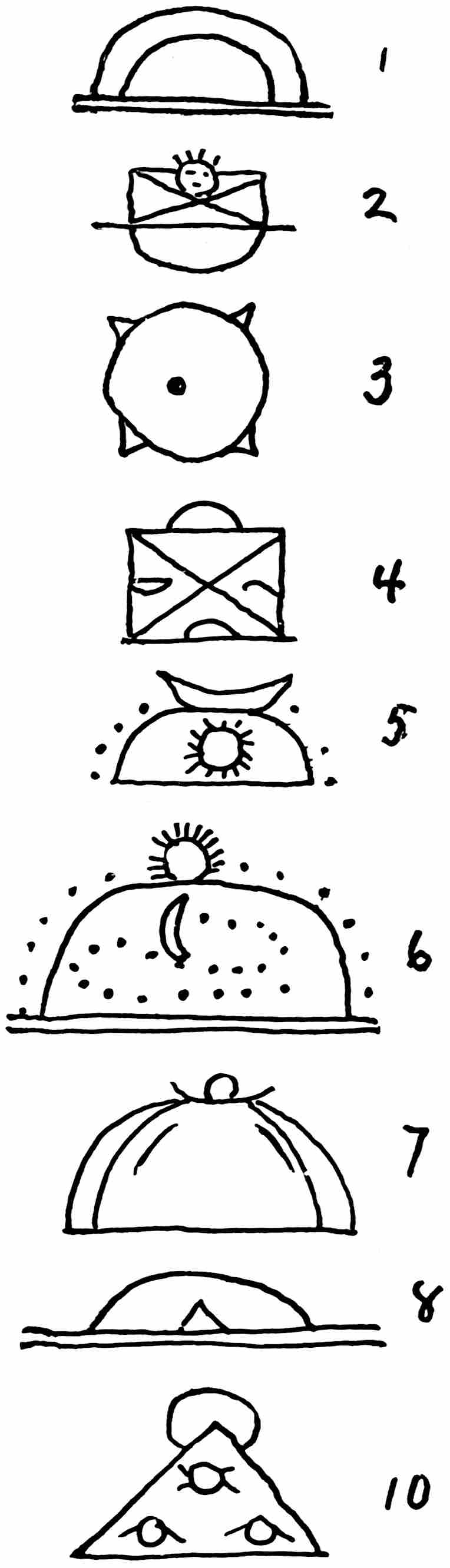 To explain the methods employed in the ruder attempts at recording, the map made by Lean Wolf, a Hidatsa, who once made a trip from Fort Berthold to Fort Buford, Dakota, with the ambition of stealing a horse, is a good example. In the illustration the returning horse-tracks indicate that he was successful and rode54 home. 1 is Lean Wolf himself; 2, the Hidatsa lodges; 3, Lean Wolfs tracks on his outward course; 4, government buildings at Fort Buford; 5, several Hidatsa lodges whose occupants intermarried with Dakotas; 6, Dakota tipis; 7, small square, a white man’s home, with a cross indicating that he had married a Dakota woman; 8, horse-tracks; 9, the Missouri River and tributaries.