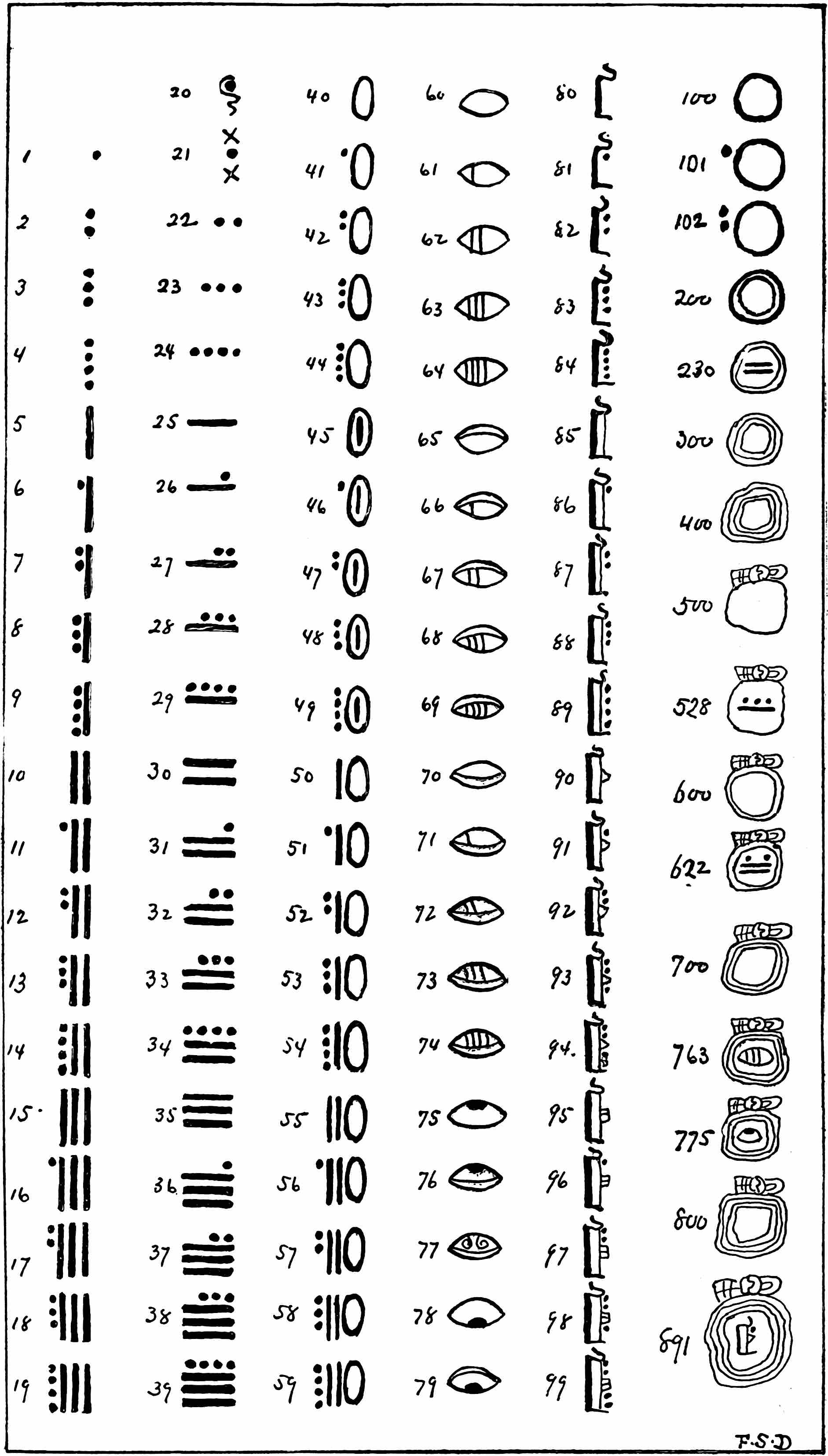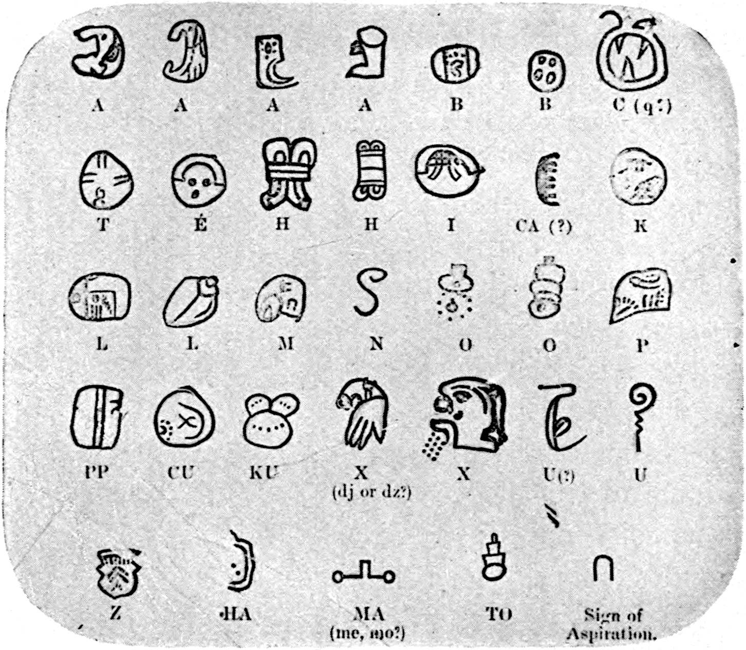 On this continent no true alphabet, so far as now known, was produced, unless we accept that recorded by Bishop Landa, and ascribed to the Mayas. Landa was the second bishop of Yucatan, and he did his best to destroy the Maya records and everything else that in his estimation linked them with the devil. But he did construct an alphabet after theirs, for the purpose, no doubt, of putting before them the Holy Gospel, and it is this alphabet that has been preserved. It has been the basis of many vain attempts to decipher the few ancient Maya documents that are known, and the failure of these attempts has caused some investigators to consider the alphabet a pure fabrication, but the identity 51of the characters with many of those in the ancient writing completely disproves this charge. Besides the alphabet, Landa left some other information concerning the Mayas, and Goodman thus presents his respects to his memory[50]: “It is a signal instance of the irony of fate that this bigoted destroyer of the fruits of Maya science and art—the pietist whose zeal rendered him avid of the obliteration of every vestige of their impious learning—should have been the only one to leave a clue by which the mysterious codices and inscriptions will yet be deciphered. Nevertheless he 52left such a clue—slight and vague, it is true; but, when carefully followed up, it broadens and leads into an open way where everything will presently become self-evident.” The alphabet was probably modified by a desire to make it conform to the Spanish, and it is this foreign element possibly that has led to the unfavourable opinion expressed in some quarters concerning it.