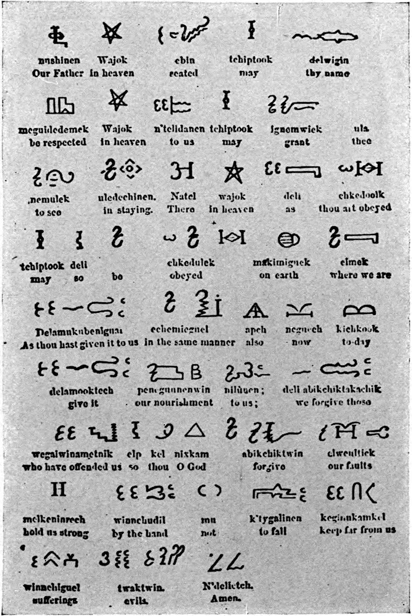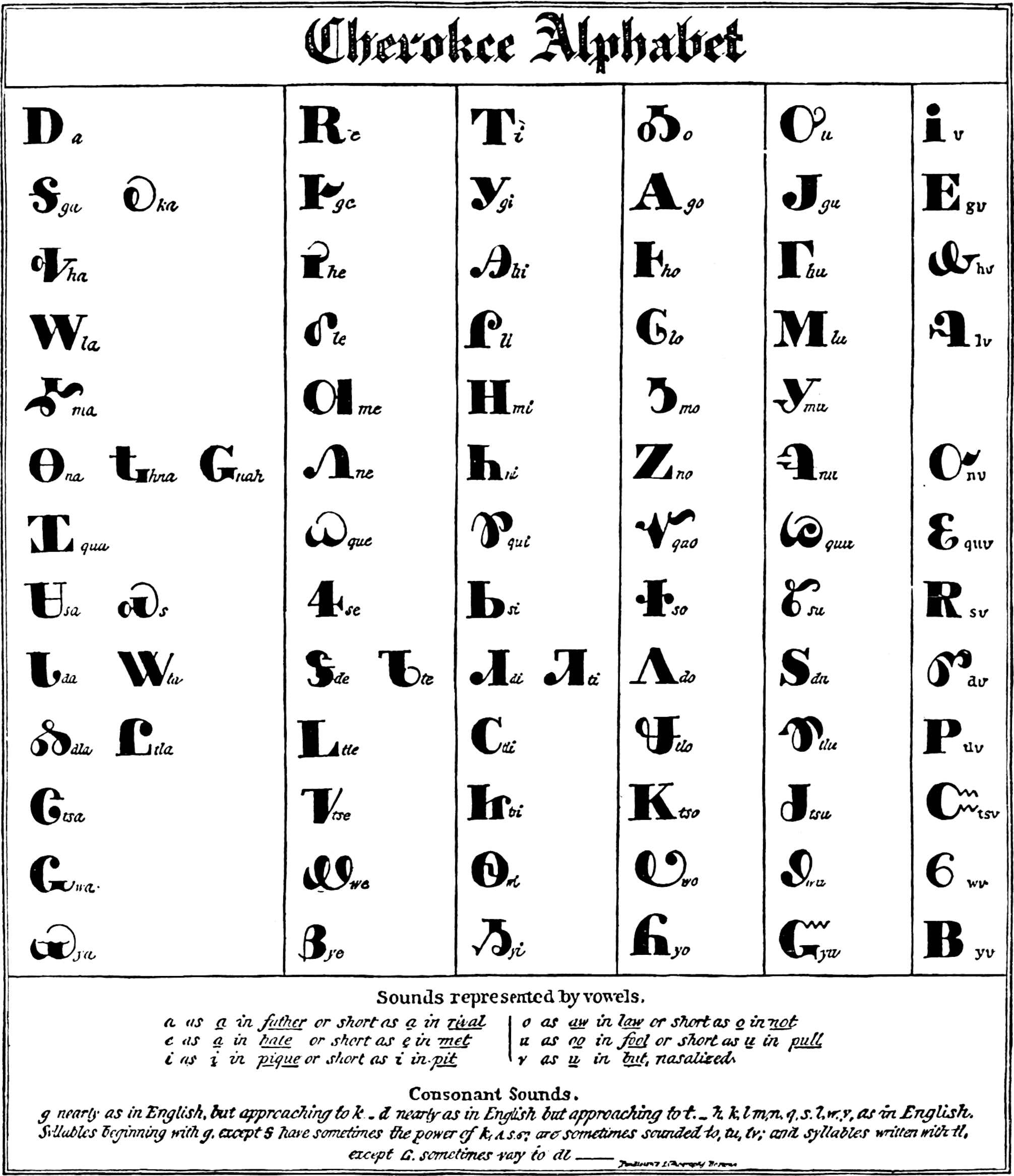 North of the Mexican country certain alphabets were invented by the European priests for the purpose of furthering the introduction 53of Christianity among the Amerinds. Of these the Micmac is a good example.[51] They were not drawn from pictographs, and were used only for teaching the Bible. In that field they did not serve to preserve Amerind history, traditions, and legends. After long contact with Europeans there was invented but one alphabet, and he who accomplished this was a half-breed. In 1821, George Gist (or Guess), whose native name was Sequoyah, a Cherokee, who spoke little if any English, but whose father was a Dutch peddler and whose mother was of mixed blood, produced an alphabet, or, more correctly speaking, a syllabary, which was immediately adopted by his tribe, and enabled them to record their traditions, sacred formulæ, prayers, etc., which to-day form a valuable portion of the information we possess of these Amerind people. Many of the symbols were adapted from our alphabet, an old spelling-book having found its way into Sequoyah’s hands, but it was the forms which were utilised, the sounds they represented being usually different. By means of this syllabary the members of the Cherokee tribe were able to learn in a few hours to write words, and the system is used to this day.