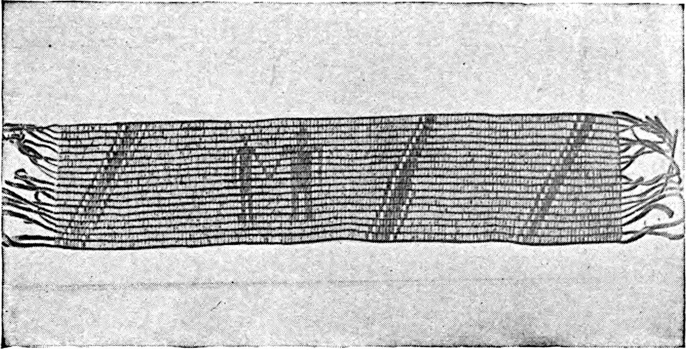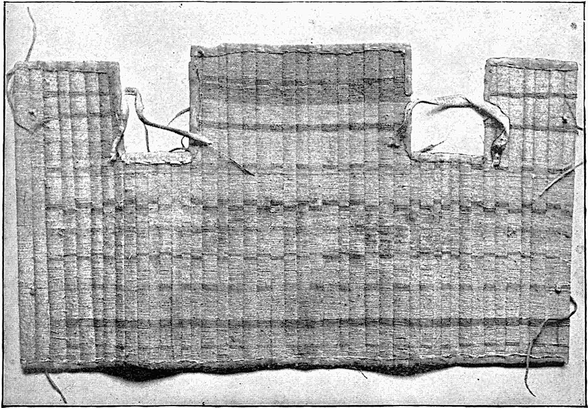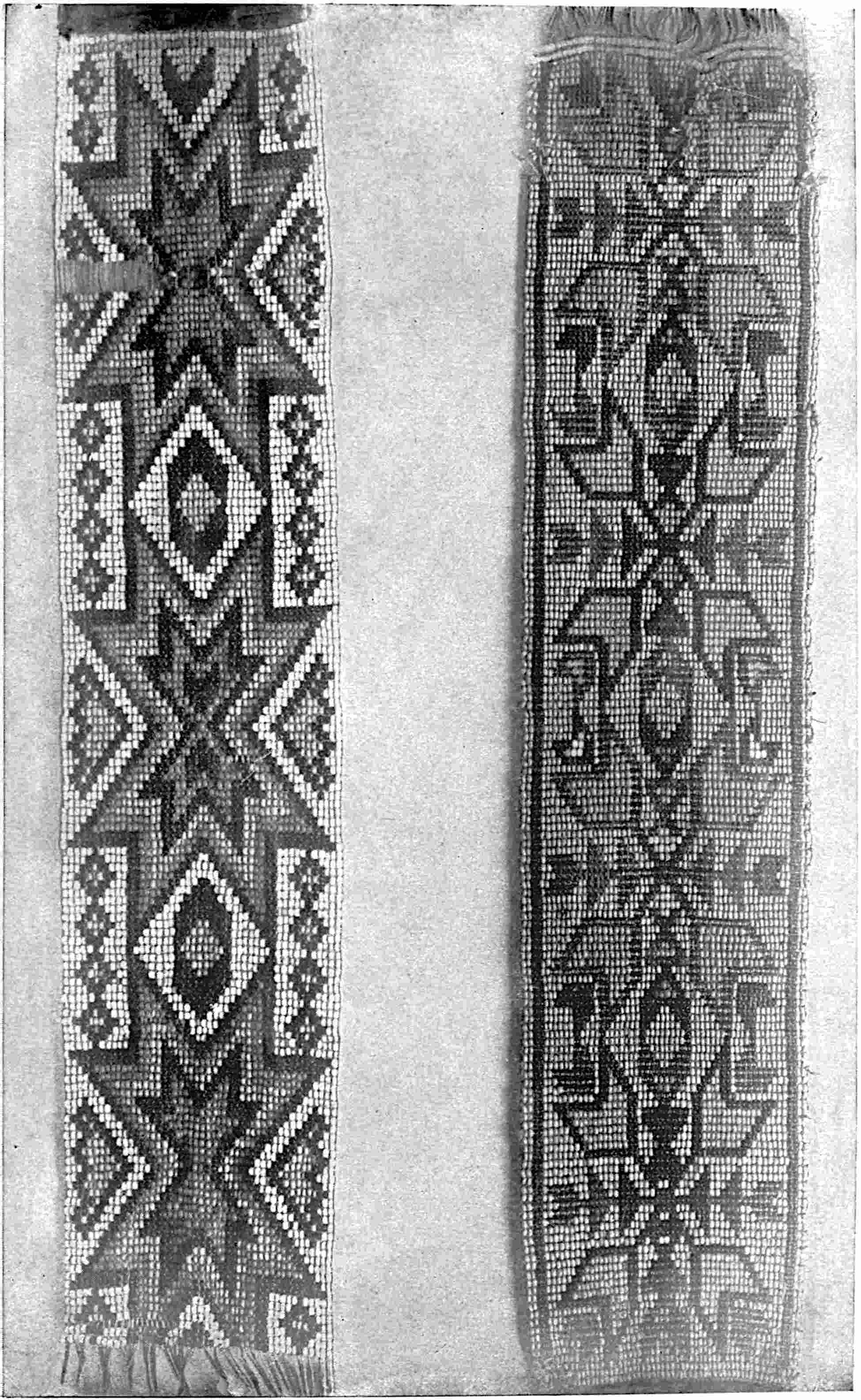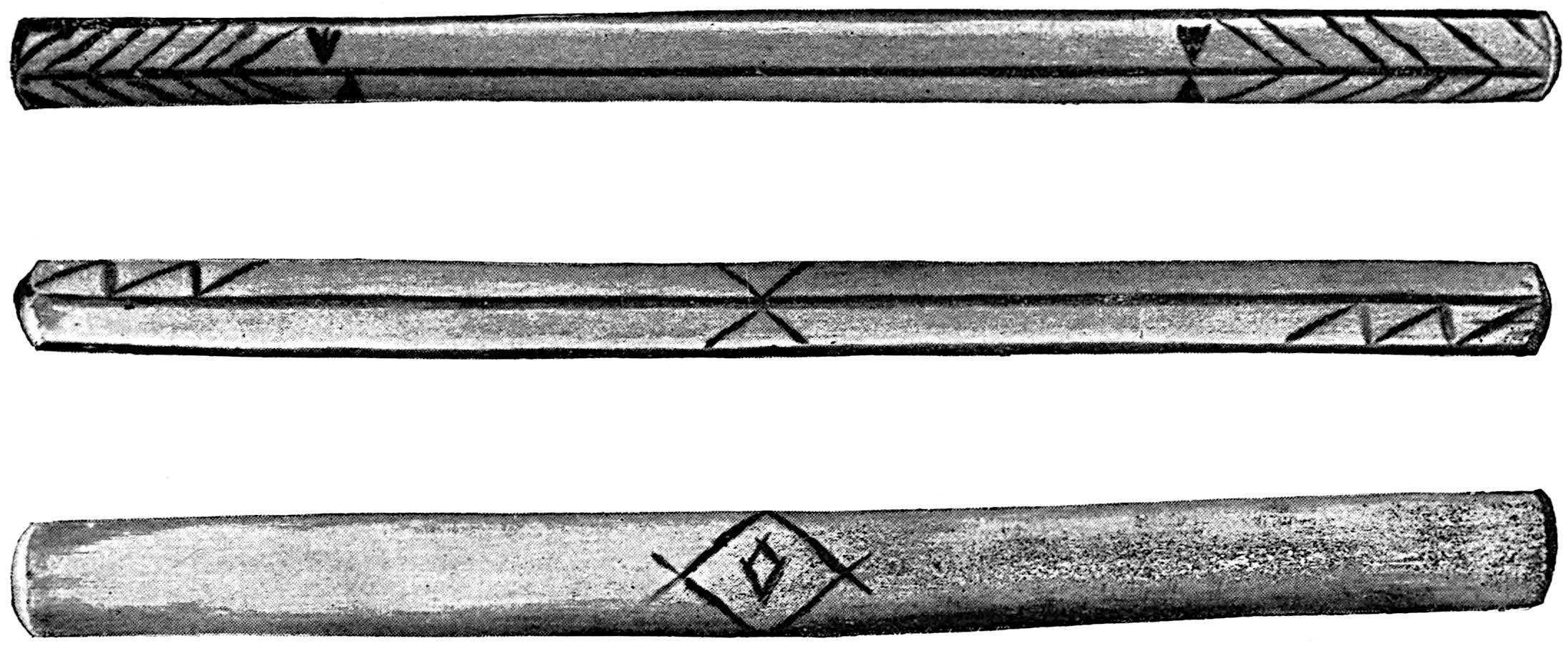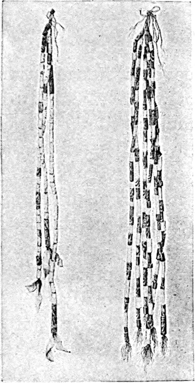 Another class of symbols was worked out in wampum. The popular idea of wampum seems to be that it was a kind of Amerind money, but the money function was only one of its uses. There was another, a mnemonic use, of more importance—that is, it was a means of recording and of communicating mnemonically among the tribes of the North-east. The Iroquois used it chiefly in the form of belts. The beads were generally white, and were used in strings as well as belts, other colours being mingled with the white, as purple and white, or black and white. These strings had important functions in summoning officers, in representing persons, and in conferring authority. But all wampum had a meaning only to those who remembered the particular association of particular forms of it, and the knowledge once entirely forgotten could never be regained. Consequently the ideas with which the belts, etc., were associated had to be regularly brought to mind. Once a year, therefore, they were exhibited in public, and the story connected with each carefully rehearsed so that it 56should not be lost through forgetfulness. This custom is still kept up among the remnants of the wampum-using tribes. In other tribes, formulæ and drawings were often preserved by certain orders who rehearsed them in the privacy of the kiva. The wampum beads were generally ⅛ inch by ¼ inch diameter—that is, flat discs of shell. They were sometimes also ¼ to ½ inch thick, with the same diameter. When the white men discovered the valuation the Amerinds placed on these beads an attempt was made to introduce some of European manufacture, but it met with only partial success.[53] The average width of a belt is three inches and the length three feet.