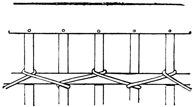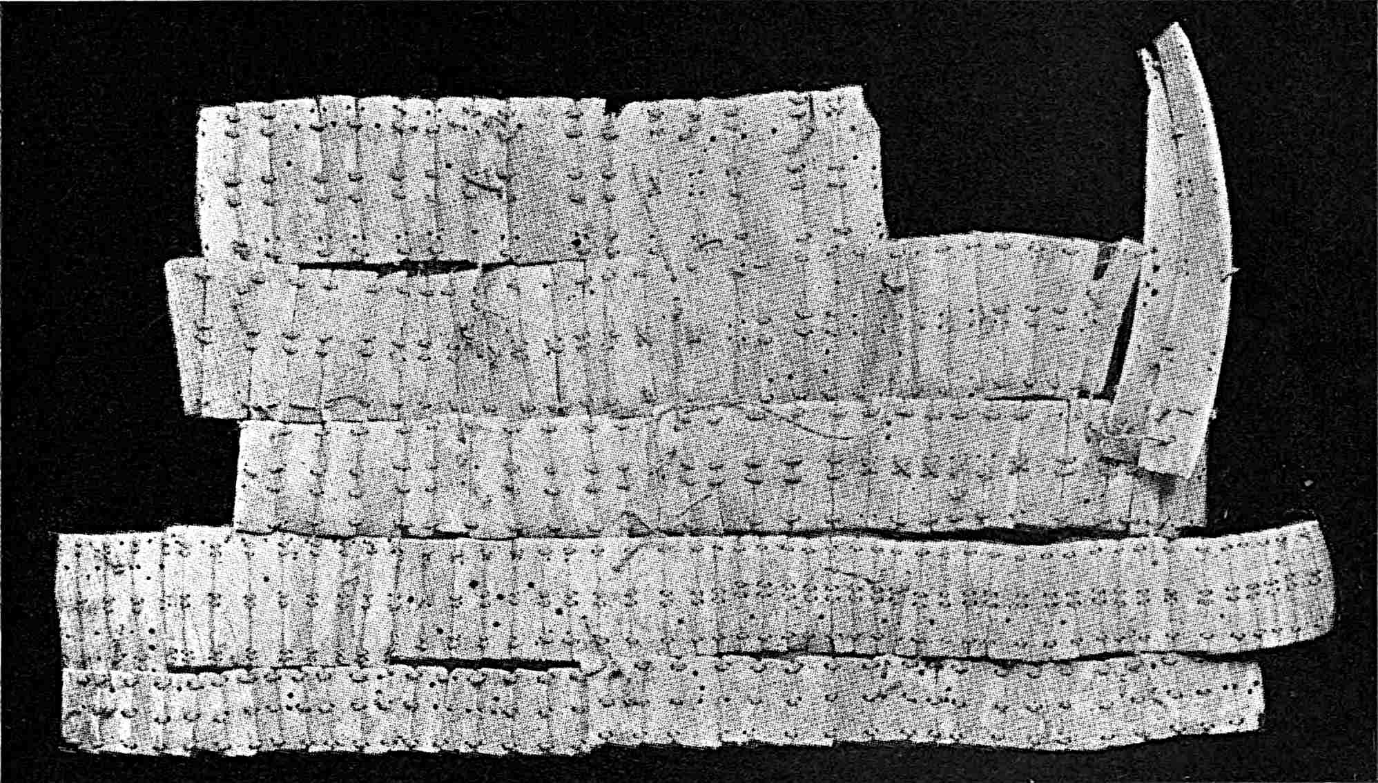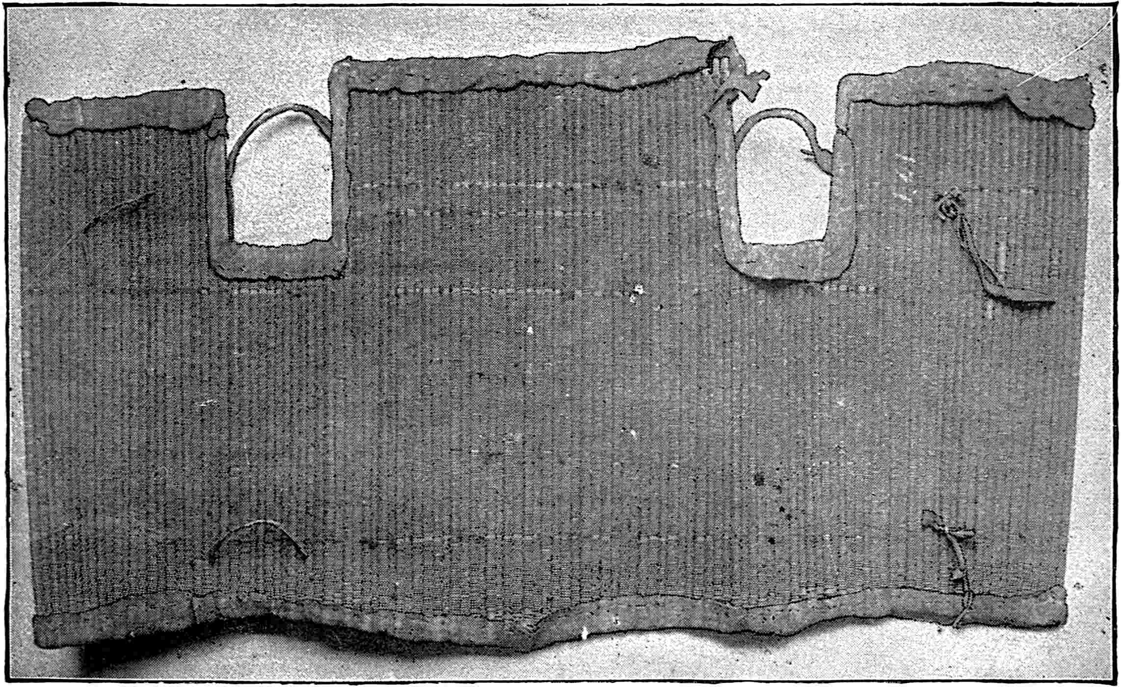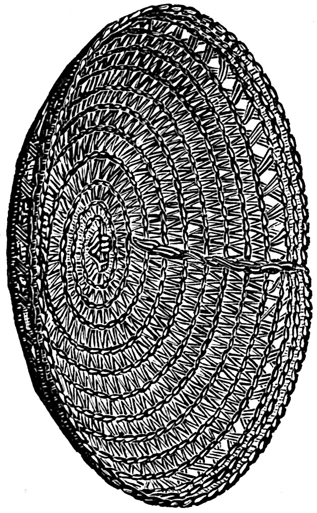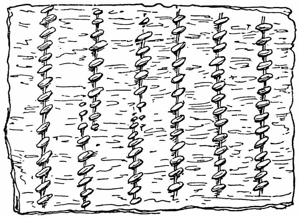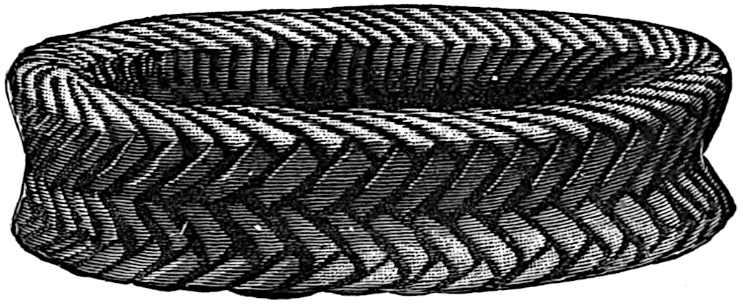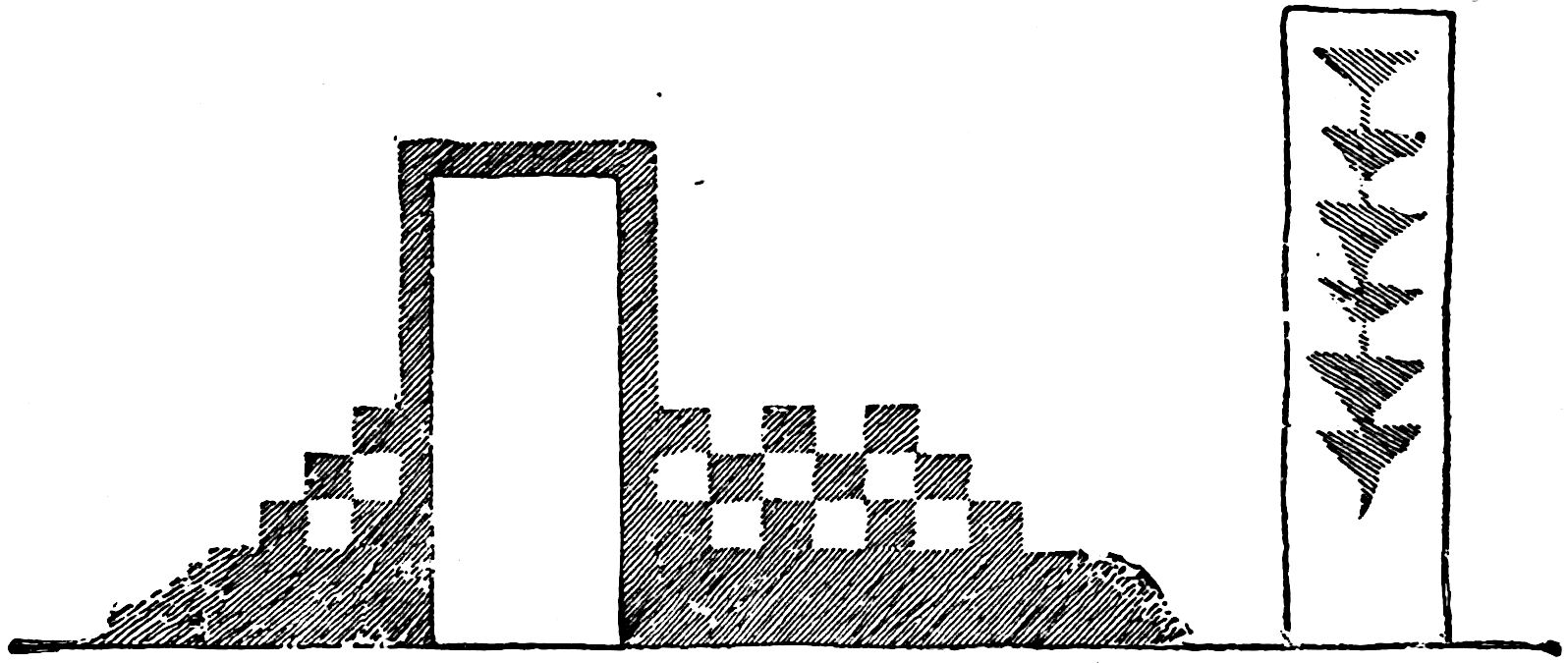 Another class of symbols was worked out in wampum. The popular idea of wampum seems to be that it was a kind of Amerind money, but the money function was only one of its uses. There was another, a mnemonic use, of more importance—that is, it was a means of recording and of communicating mnemonically among the tribes of the North-east. The Iroquois used it chiefly in the form of belts. The beads were generally white, and were used in strings as well as belts, other colours being mingled with the white, as purple and white, or black and white. These strings had important functions in summoning officers, in representing persons, and in conferring authority. But all wampum had a meaning only to those who remembered the particular association of particular forms of it, and the knowledge once entirely forgotten could never be regained. Consequently the ideas with which the belts, etc., were associated had to be regularly brought to mind. Once a year, therefore, they were exhibited in public, and the story connected with each carefully rehearsed so that it 56should not be lost through forgetfulness. This custom is still kept up among the remnants of the wampum-using tribes. In other tribes, formulæ and drawings were often preserved by certain orders who rehearsed them in the privacy of the kiva. The wampum beads were generally ⅛ inch by ¼ inch diameter—that is, flat discs of shell. They were sometimes also ¼ to ½ inch thick, with the same diameter. When the white men discovered the valuation the Amerinds placed on these beads an attempt was made to introduce some of European manufacture, but it met with only partial success.[53] The average width of a belt is three inches and the length three feet.