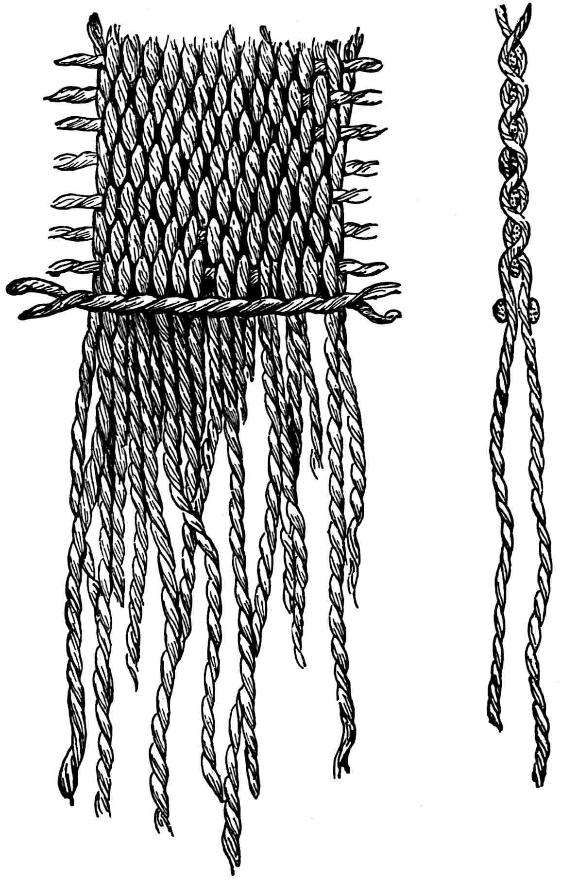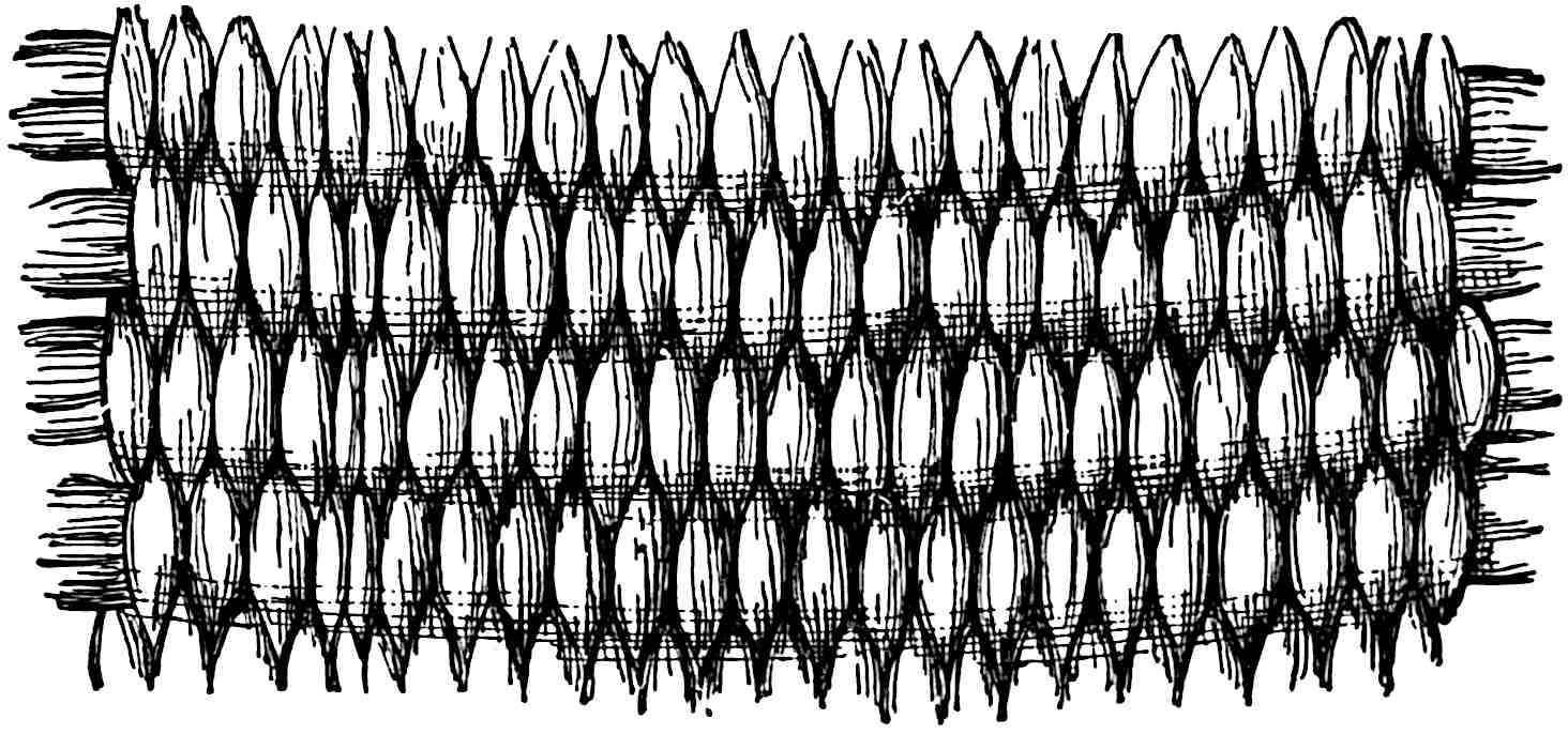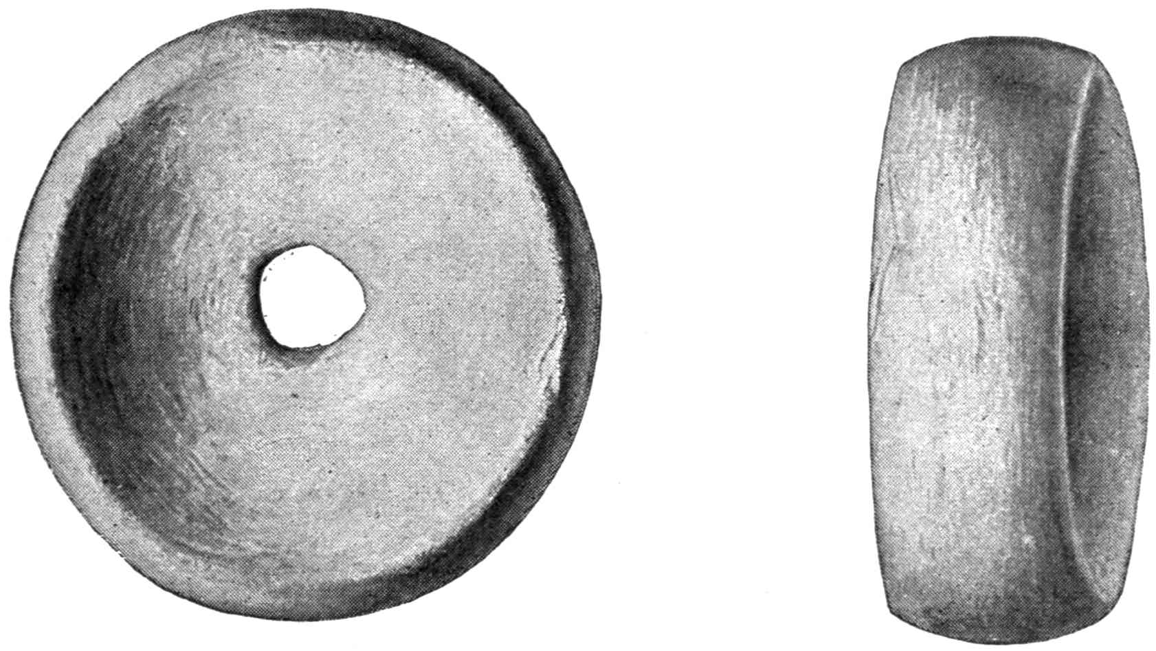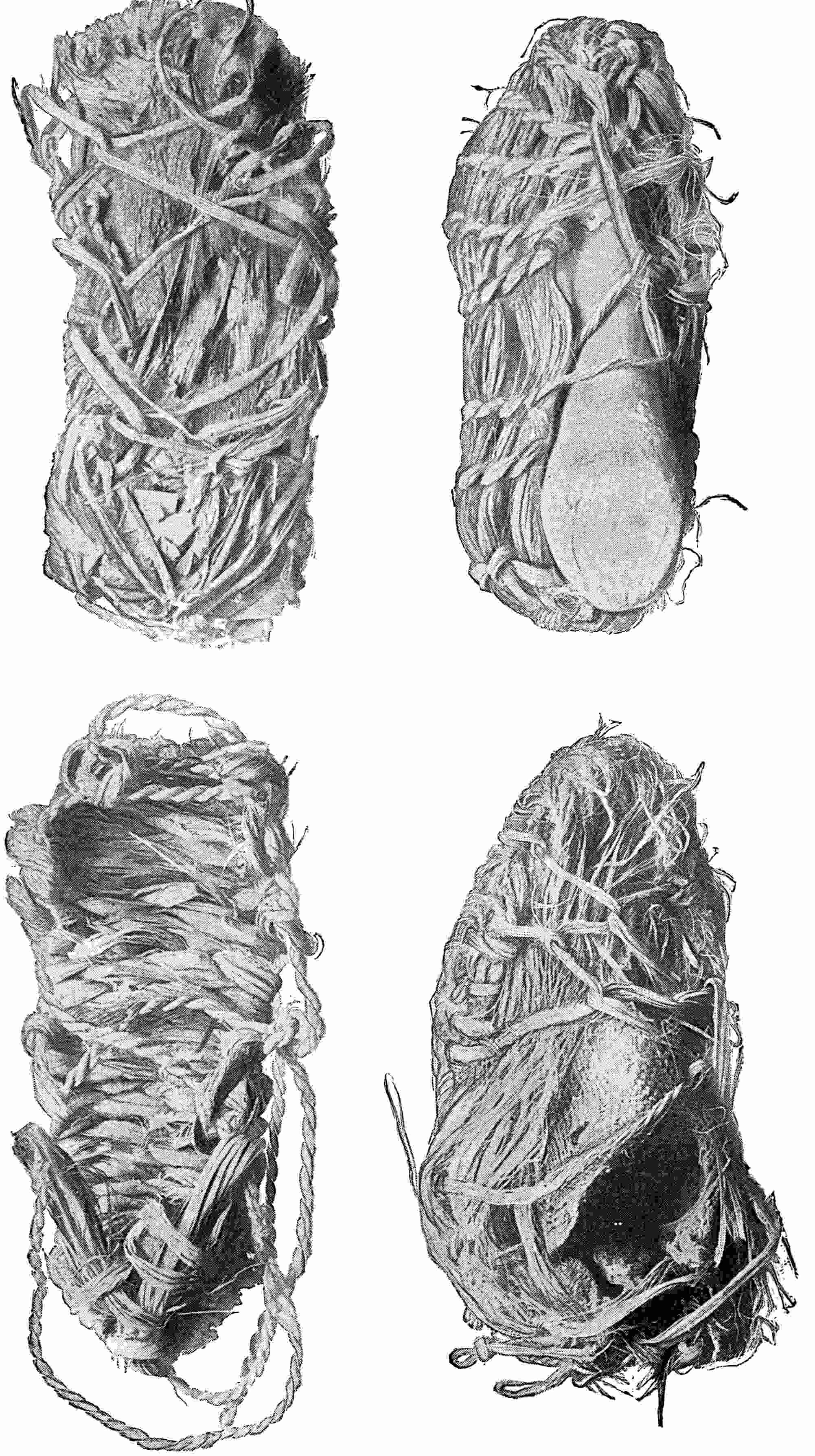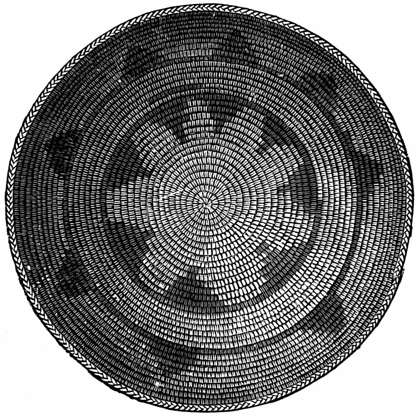 Another class of symbols was worked out in wampum. The popular idea of wampum seems to be that it was a kind of Amerind money, but the money function was only one of its uses. There was another, a mnemonic use, of more importance—that is, it was a means of recording and of communicating mnemonically among the tribes of the North-east. The Iroquois used it chiefly in the form of belts. The beads were generally white, and were used in strings as well as belts, other colours being mingled with the white, as purple and white, or black and white. These strings had important functions in summoning officers, in representing persons, and in conferring authority. But all wampum had a meaning only to those who remembered the particular association of particular forms of it, and the knowledge once entirely forgotten could never be regained. Consequently the ideas with which the belts, etc., were associated had to be regularly brought to mind. Once a year, therefore, they were exhibited in public, and the story connected with each carefully rehearsed so that it 56should not be lost through forgetfulness. This custom is still kept up among the remnants of the wampum-using tribes. In other tribes, formulæ and drawings were often preserved by certain orders who rehearsed them in the privacy of the kiva. The wampum beads were generally ⅛ inch by ¼ inch diameter—that is, flat discs of shell. They were sometimes also ¼ to ½ inch thick, with the same diameter. When the white men discovered the valuation the Amerinds placed on these beads an attempt was made to introduce some of European manufacture, but it met with only partial success.[53] The average width of a belt is three inches and the length three feet.