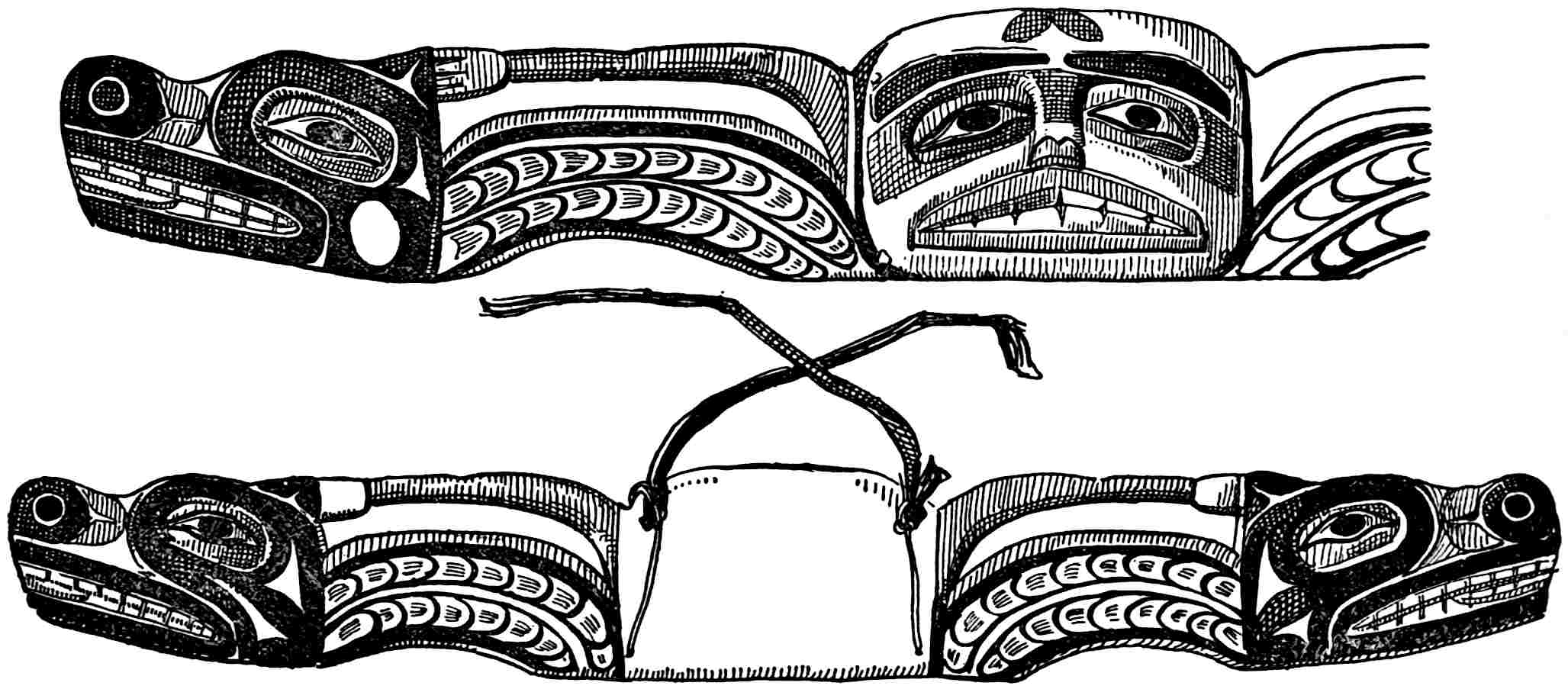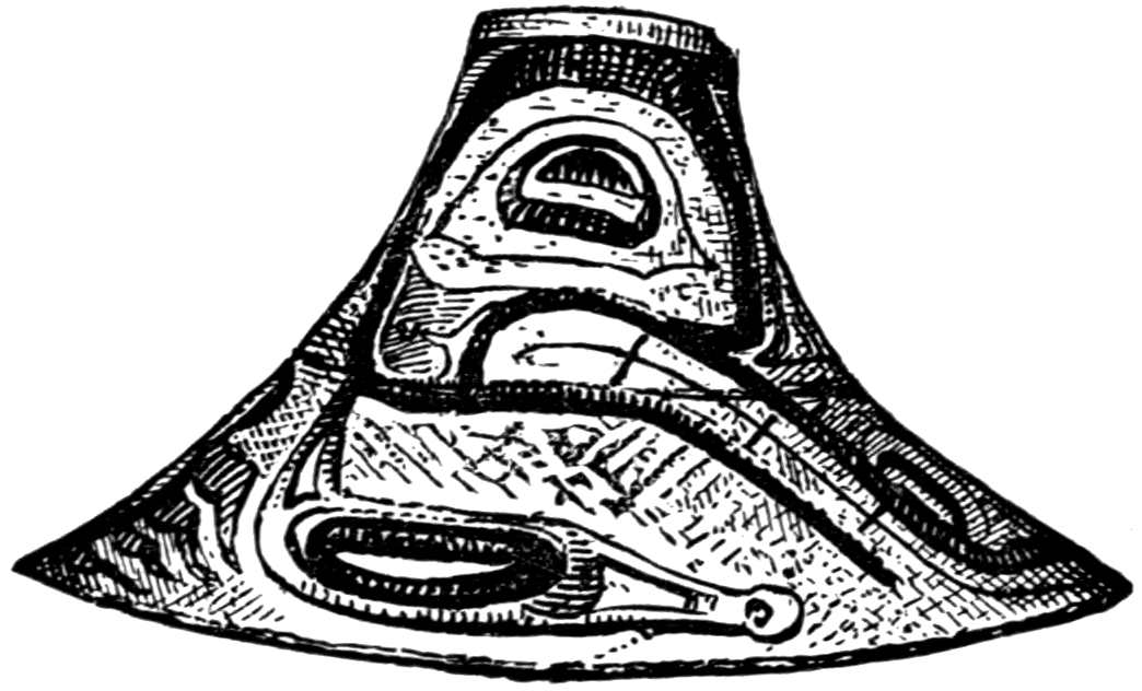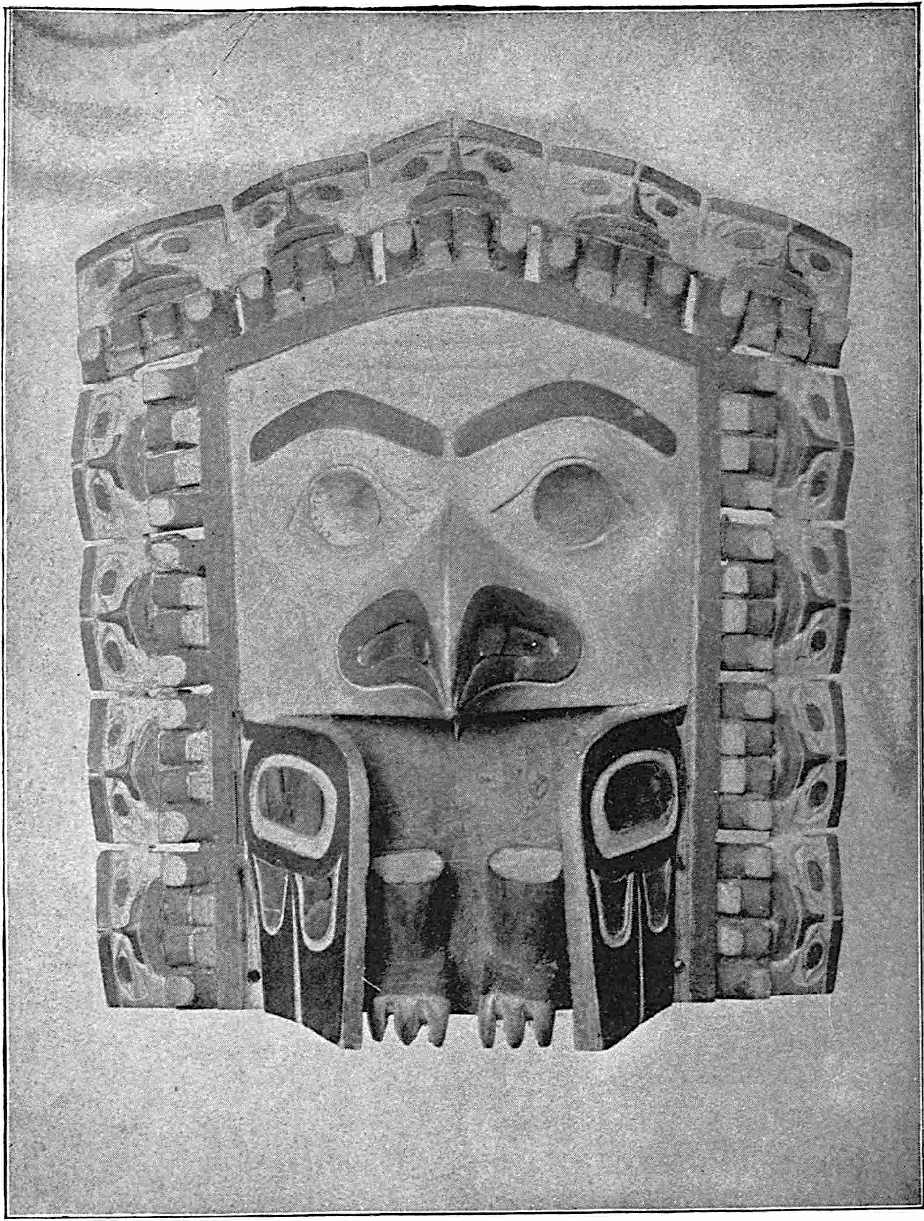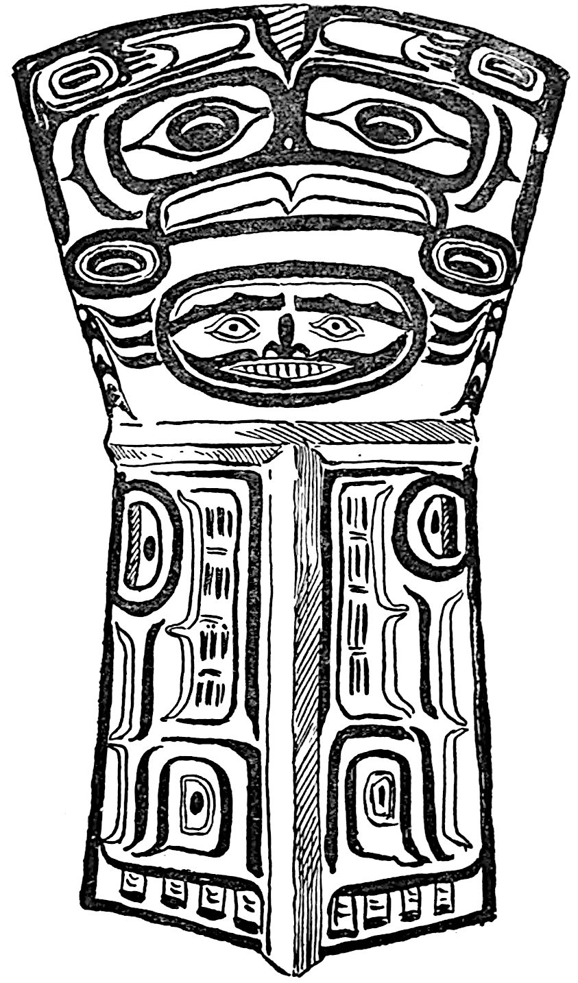 By some tribes the human body was also used as a surface for the display of pictographs. Among all primitive people the body has been often decorated to a greater or less extent by means of pigments or by tattooing, and even to-day the practice lingers among civilised races, in their sailors and soldiers especially. The primitive totem or tattoo marks are frequently highly elaborate, but the work is not all accomplished at one time. Years sometimes58 pass before the drawings are complete. The Haidas of the North-west coast are specially given to this form of decoration, and their bodies bear carefully prepared symbols. They are heraldic signs, or the family totem, of the clan to which the person belongs.