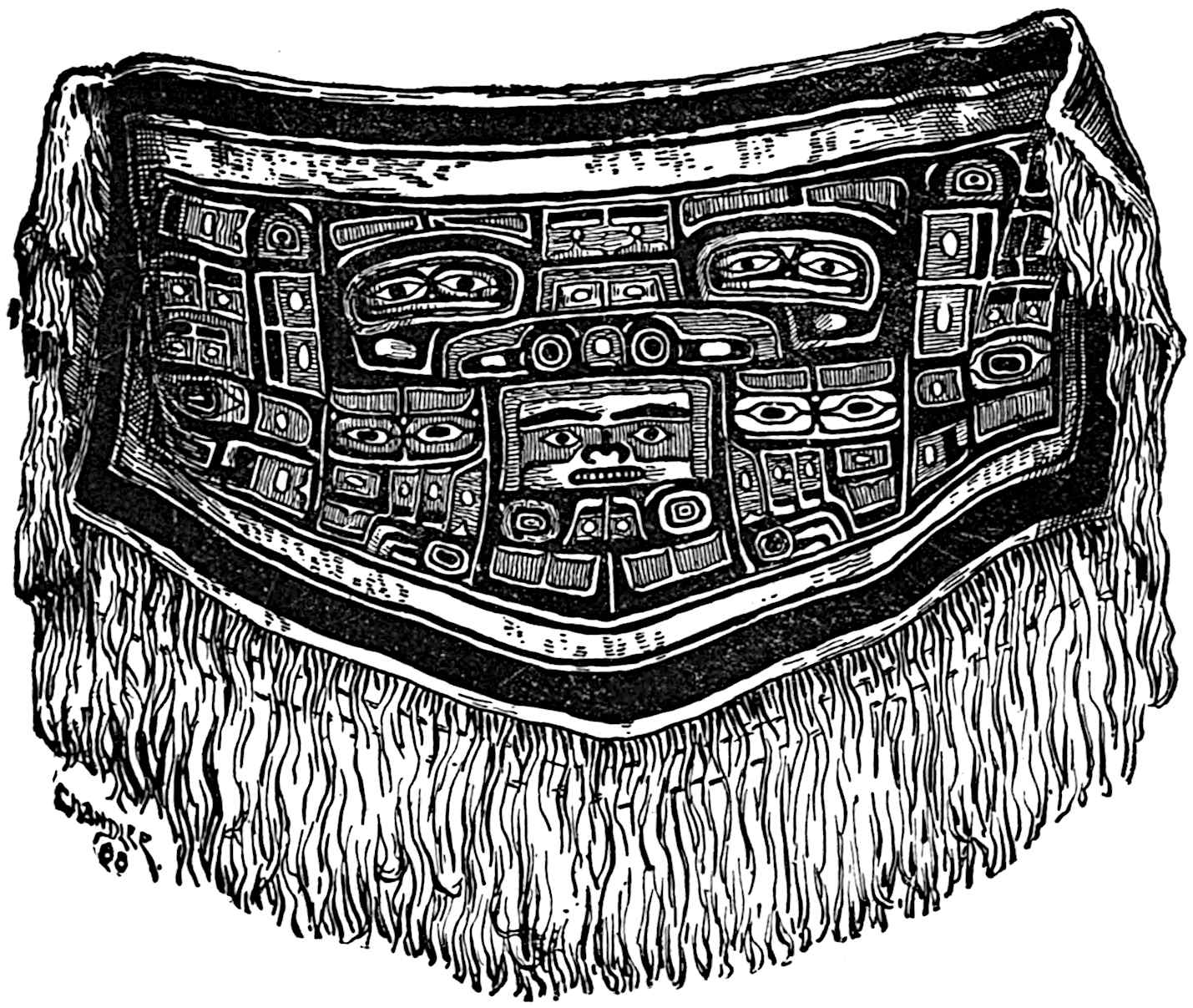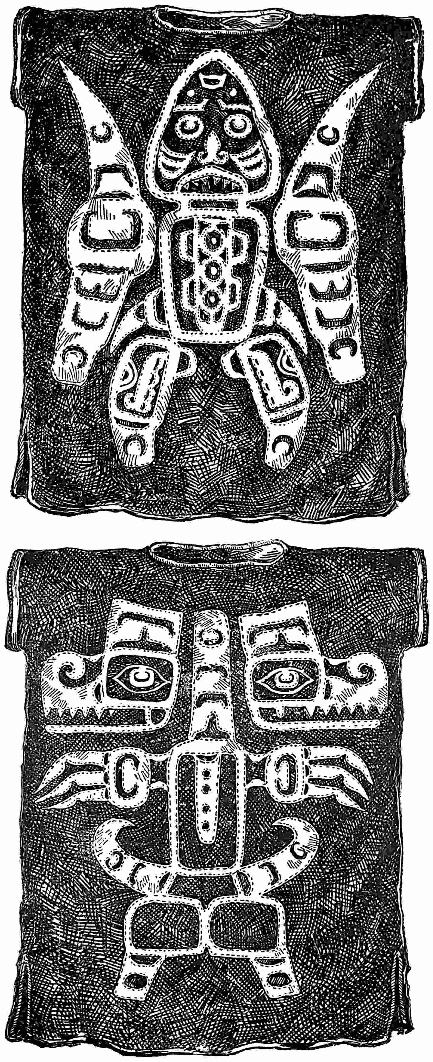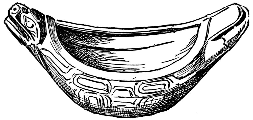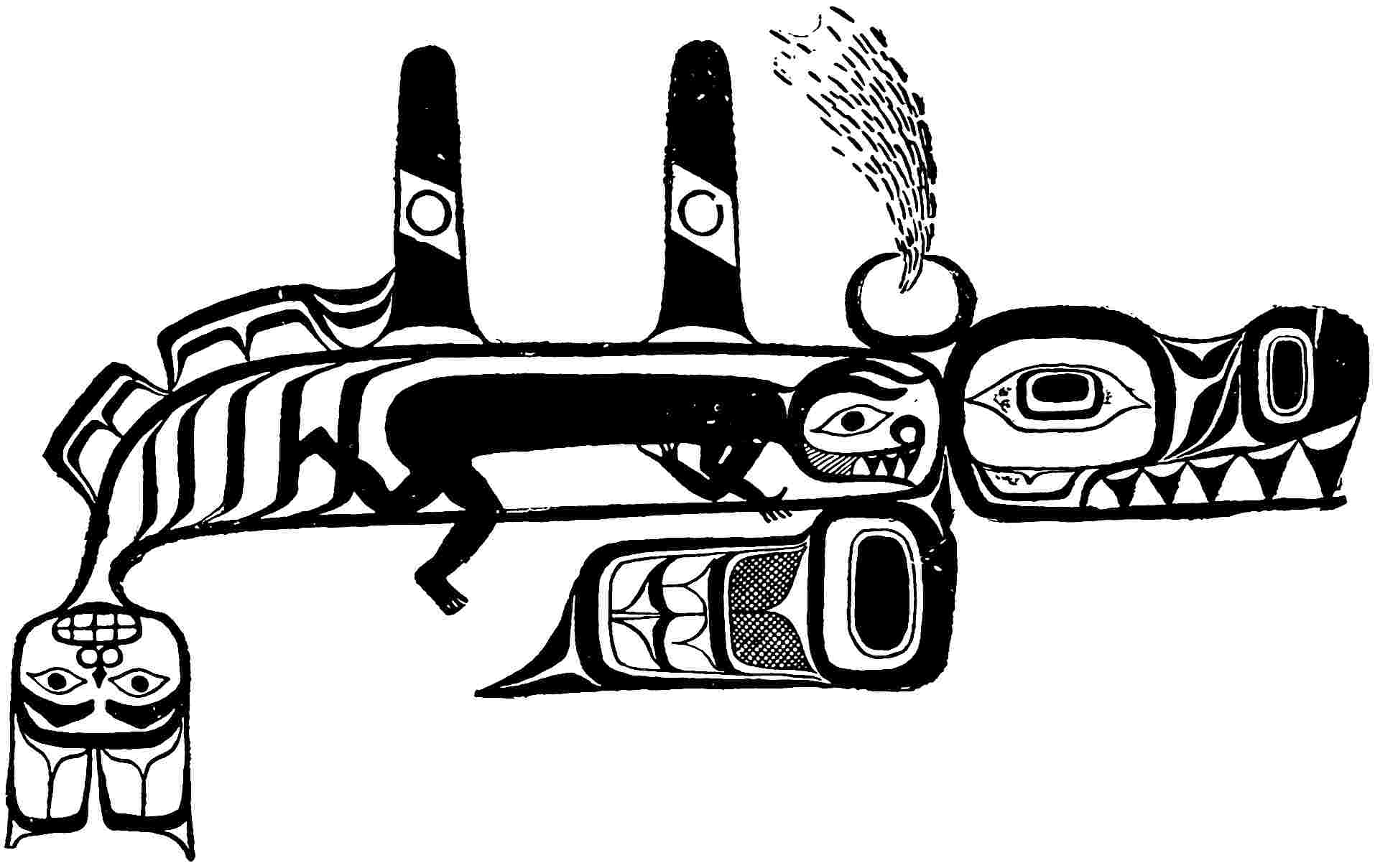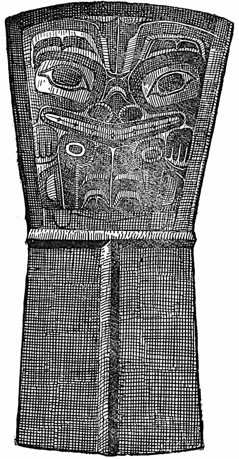 By some tribes the human body was also used as a surface for the display of pictographs. Among all primitive people the body has been often decorated to a greater or less extent by means of pigments or by tattooing, and even to-day the practice lingers among civilised races, in their sailors and soldiers especially. The primitive totem or tattoo marks are frequently highly elaborate, but the work is not all accomplished at one time. Years sometimes58 pass before the drawings are complete. The Haidas of the North-west coast are specially given to this form of decoration, and their bodies bear carefully prepared symbols. They are heraldic signs, or the family totem, of the clan to which the person belongs.