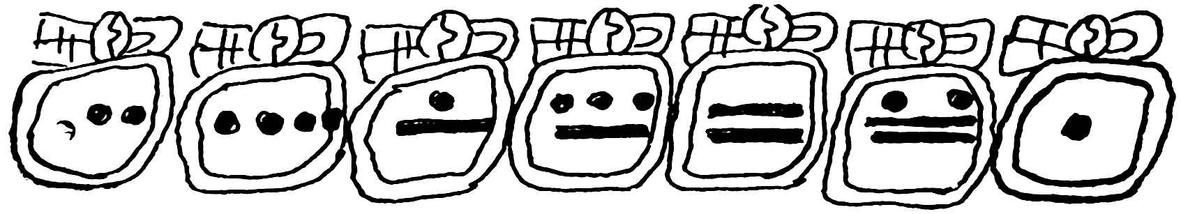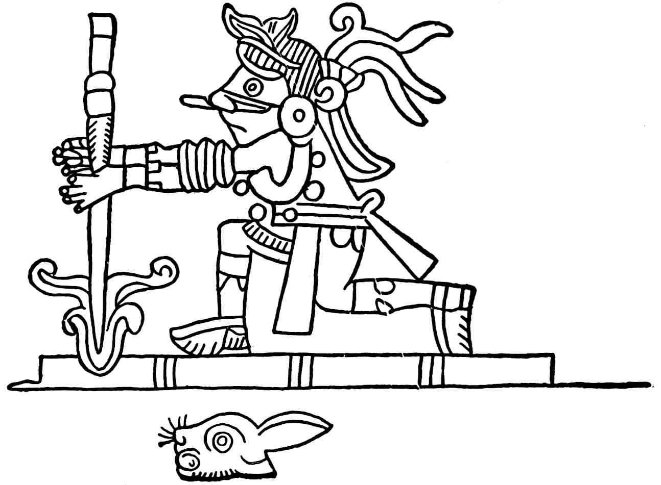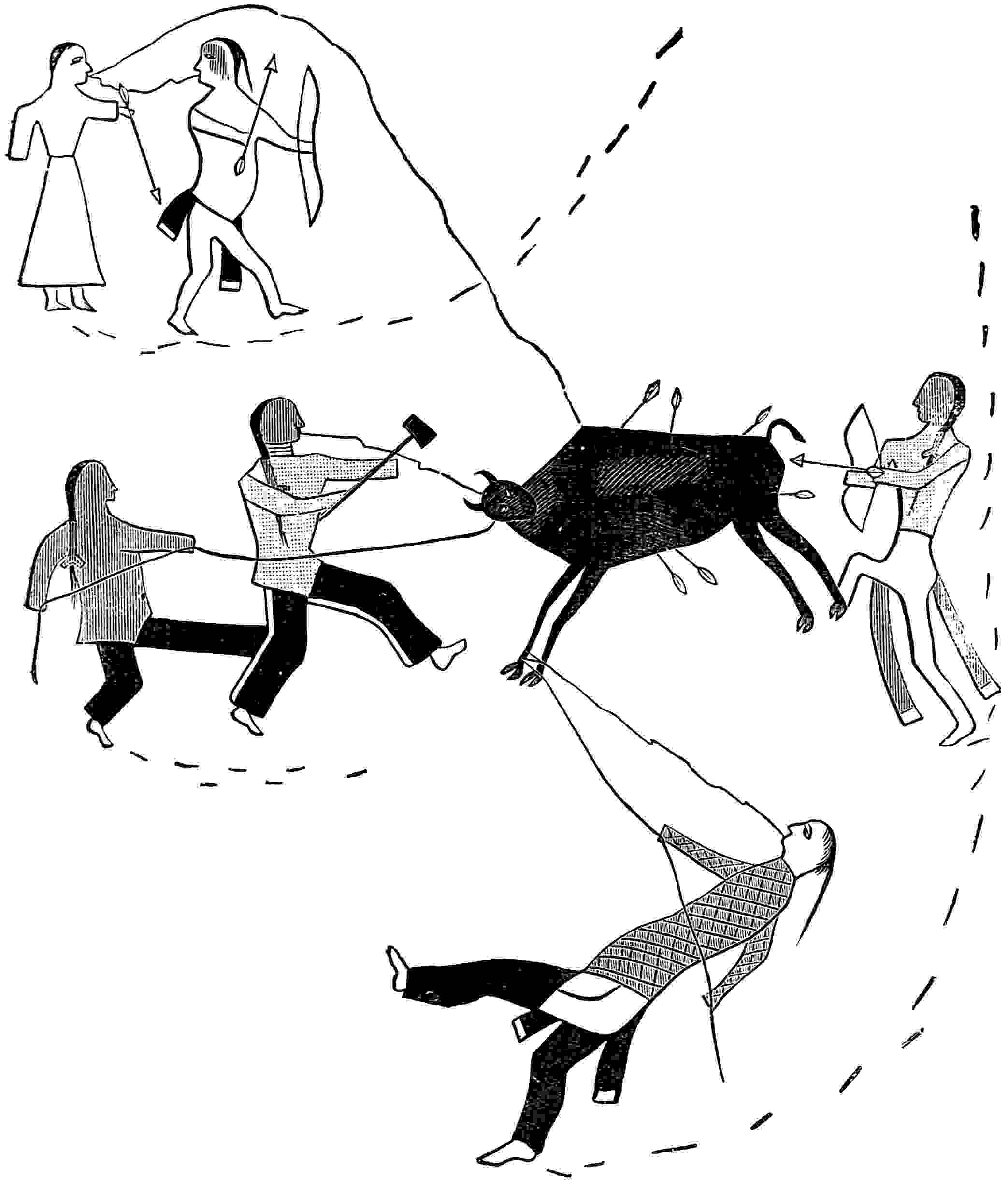 Some of the ordinary rock pictures may have been carved for simple amusement, but the majority were made with a purpose, and this was usually the communication or record of an idea. The Amerind records may be divided into two and perhaps three general classes: first, the mnemonic; second, the ideographic; and, third, the phonetic. Brinton suggests for the writings of the Aztecs, which were partly ideographic and partly phonetic, the term ikonomatic,[47] and used it in his own works. The ideographic class are those which represent an idea, as a man striking another, like the accompanying illustration from the autobiography of Running Antelope, who thus records his killing of two Arikarees. The mnemonic class do not represent an idea, but simply are memory helps, like a string tied around one’s finger, a good example being any numeral, say the figure “9.” The phonetic class represent sounds, like the letters of our alphabet, say the letter “e.” It 49is believed that the Maya writings were largely phonetic, but the phonetic quality is not well established.