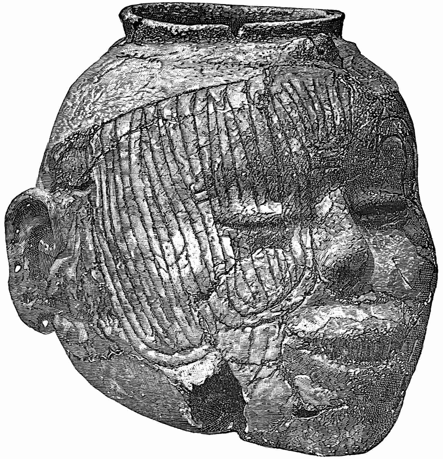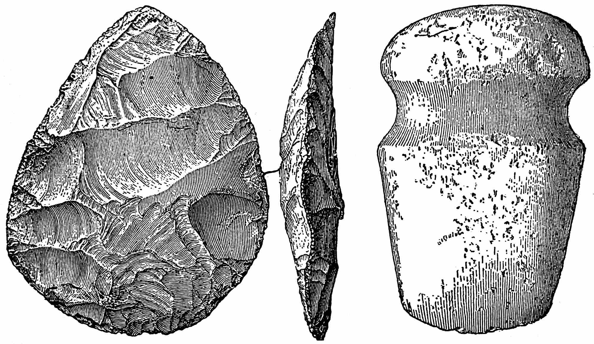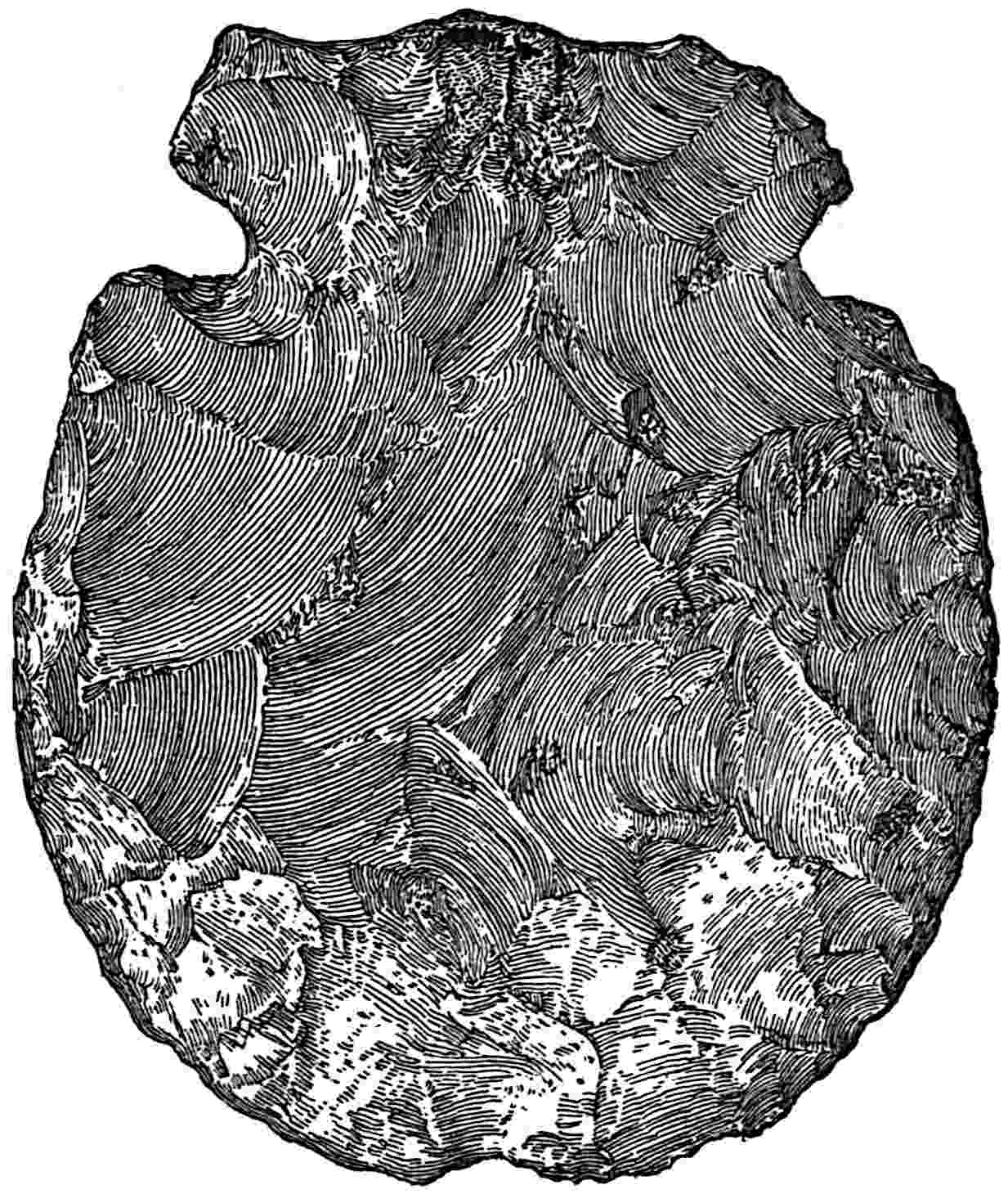 The material evidences concerning the antiquity of man in America are many, but few are entirely satisfactory. The Calaveras skull and other remains in the auriferous California gravels seem to place him here as early as the Tertiary, and this, says Holmes,[393] would make man older on this continent than anywhere else in the world according to present evidence. A rudely chipped arrow-head has also been found in another region under some elephant bones. A primitive hearth was discovered in well digging in an old beach of Lake Ontario which dates back to the glacial time. Many specimens of stone implements have been found throughout the land in deposits which appear to be of great age. There is always the question of modern introduction through burials, overturned trees, etc., but the number and varying positions seem to indicate that some of these tools have been found in their original places. I excavated a mound in southern Utah from the depths of which I brought out an exceedingly primitive grinding-stone, yet not a single stone implement of any 435other kind was found. The grinding-stone was twenty feet below the top of the mound and ten below the present general level of the surface. The mound was formed of many layers of earth interspersed with thin layers of charcoal and ashes. All around the site there were house ruins on the surface, but in the mound not a trace of a building stone was seen. I was told that in digging a well not far from this locality a small earthen jug of antique type was found about thirty feet below the present level. I did not see it nor even the man who found it, but the great abundance of such finds must indicate antiquity, for they could not all be fraudulent, nor all recent intrusions.