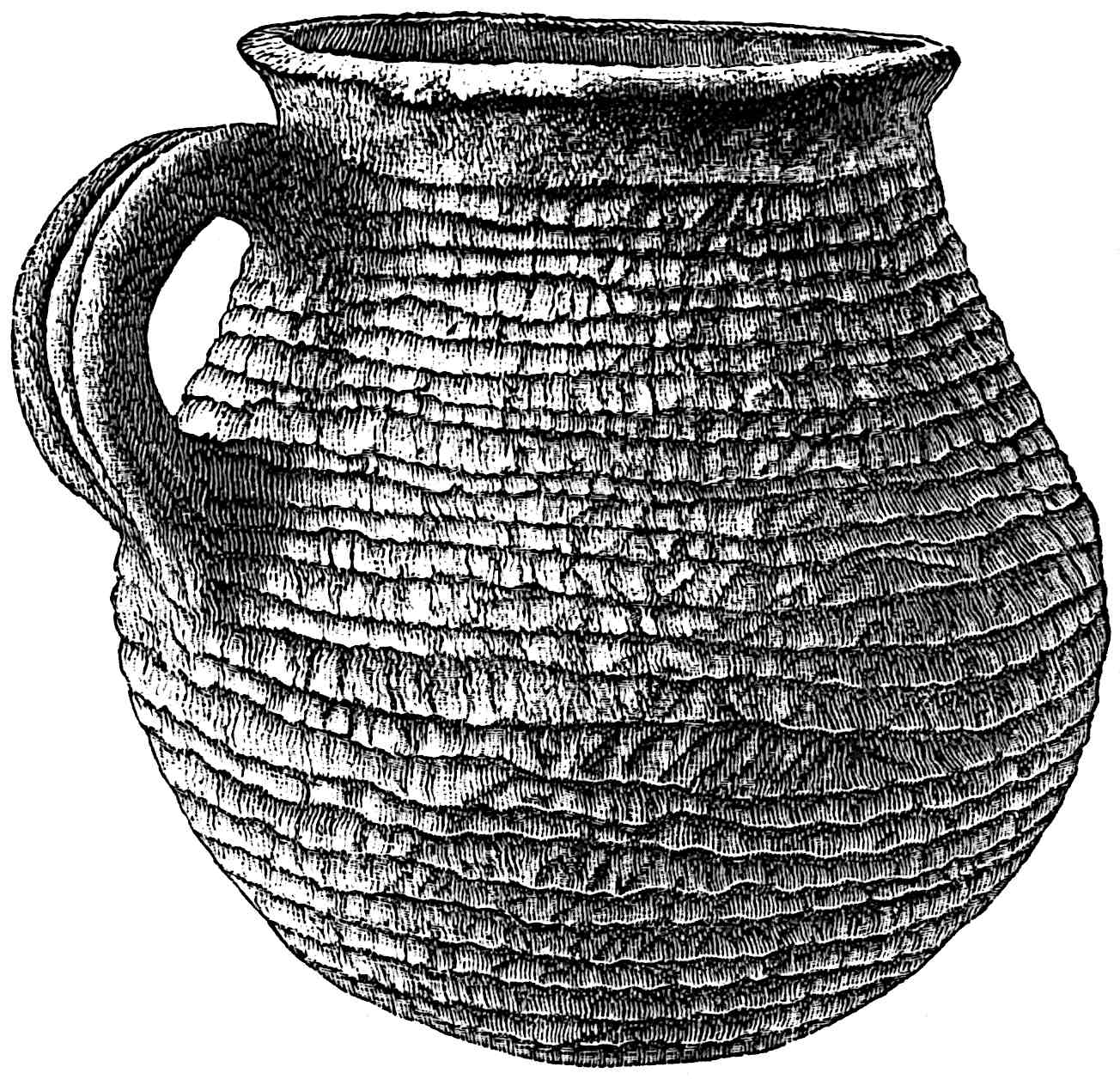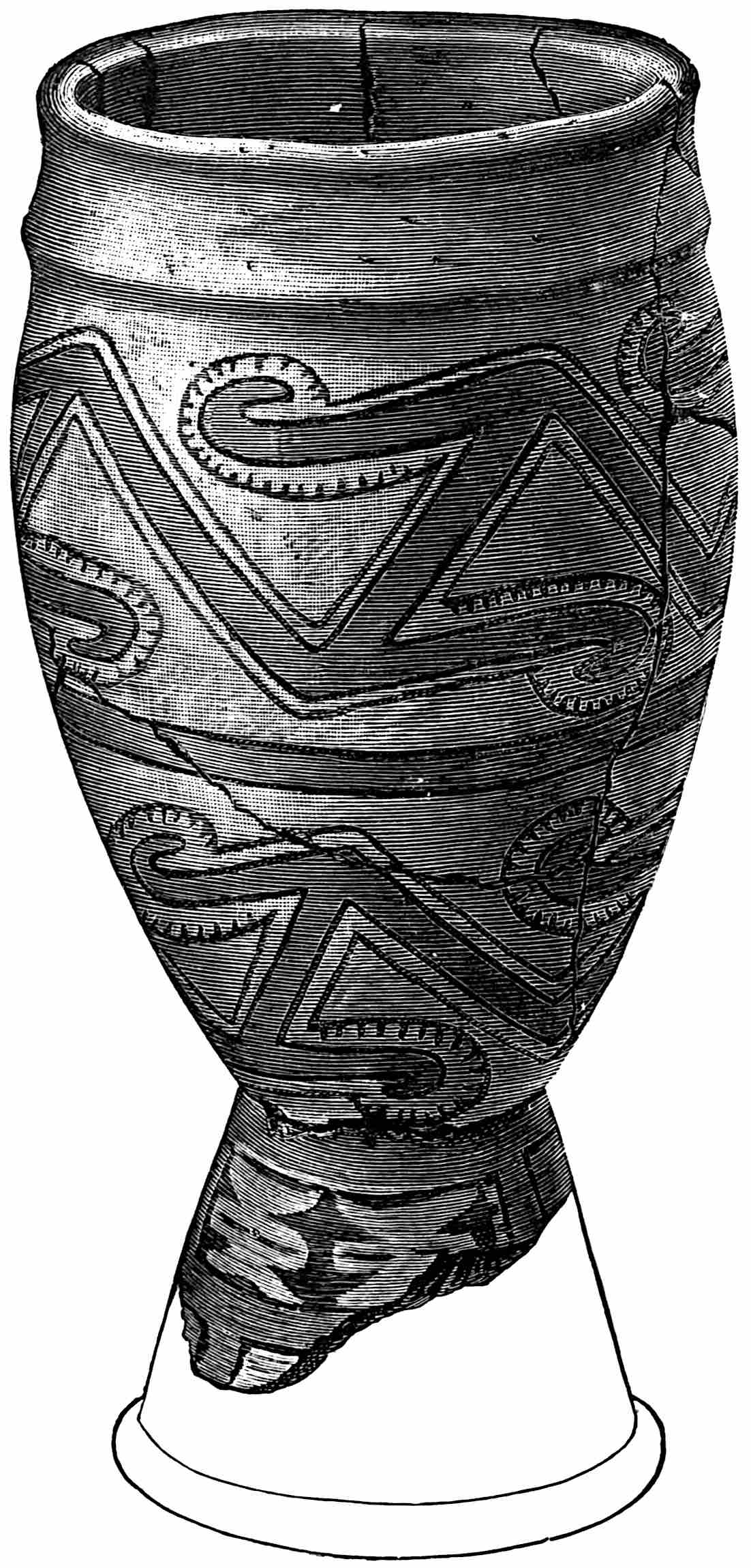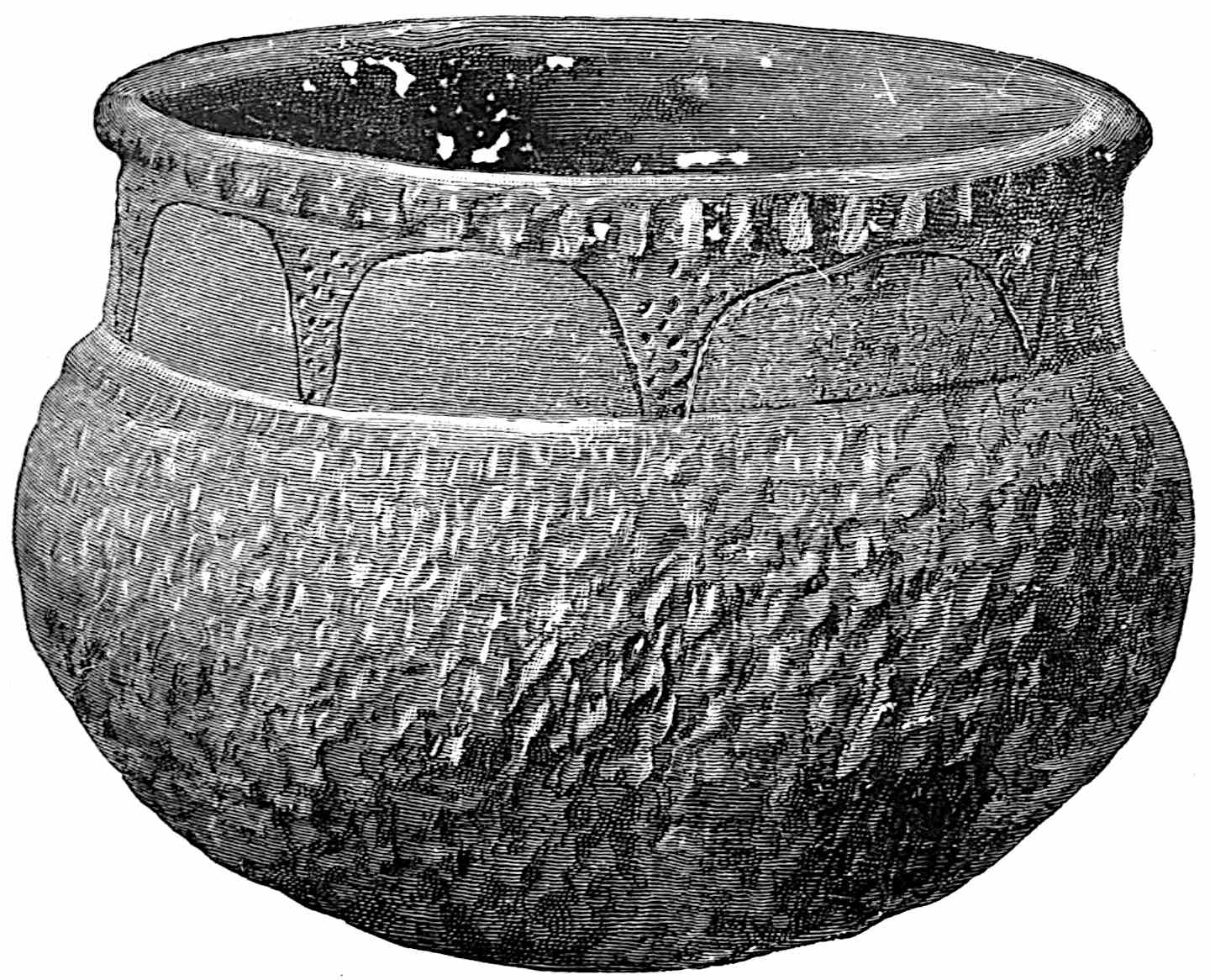 The material evidences concerning the antiquity of man in America are many, but few are entirely satisfactory. The Calaveras skull and other remains in the auriferous California gravels seem to place him here as early as the Tertiary, and this, says Holmes,[393] would make man older on this continent than anywhere else in the world according to present evidence. A rudely chipped arrow-head has also been found in another region under some elephant bones. A primitive hearth was discovered in well digging in an old beach of Lake Ontario which dates back to the glacial time. Many specimens of stone implements have been found throughout the land in deposits which appear to be of great age. There is always the question of modern introduction through burials, overturned trees, etc., but the number and varying positions seem to indicate that some of these tools have been found in their original places. I excavated a mound in southern Utah from the depths of which I brought out an exceedingly primitive grinding-stone, yet not a single stone implement of any 435other kind was found. The grinding-stone was twenty feet below the top of the mound and ten below the present general level of the surface. The mound was formed of many layers of earth interspersed with thin layers of charcoal and ashes. All around the site there were house ruins on the surface, but in the mound not a trace of a building stone was seen. I was told that in digging a well not far from this locality a small earthen jug of antique type was found about thirty feet below the present level. I did not see it nor even the man who found it, but the great abundance of such finds must indicate antiquity, for they could not all be fraudulent, nor all recent intrusions.