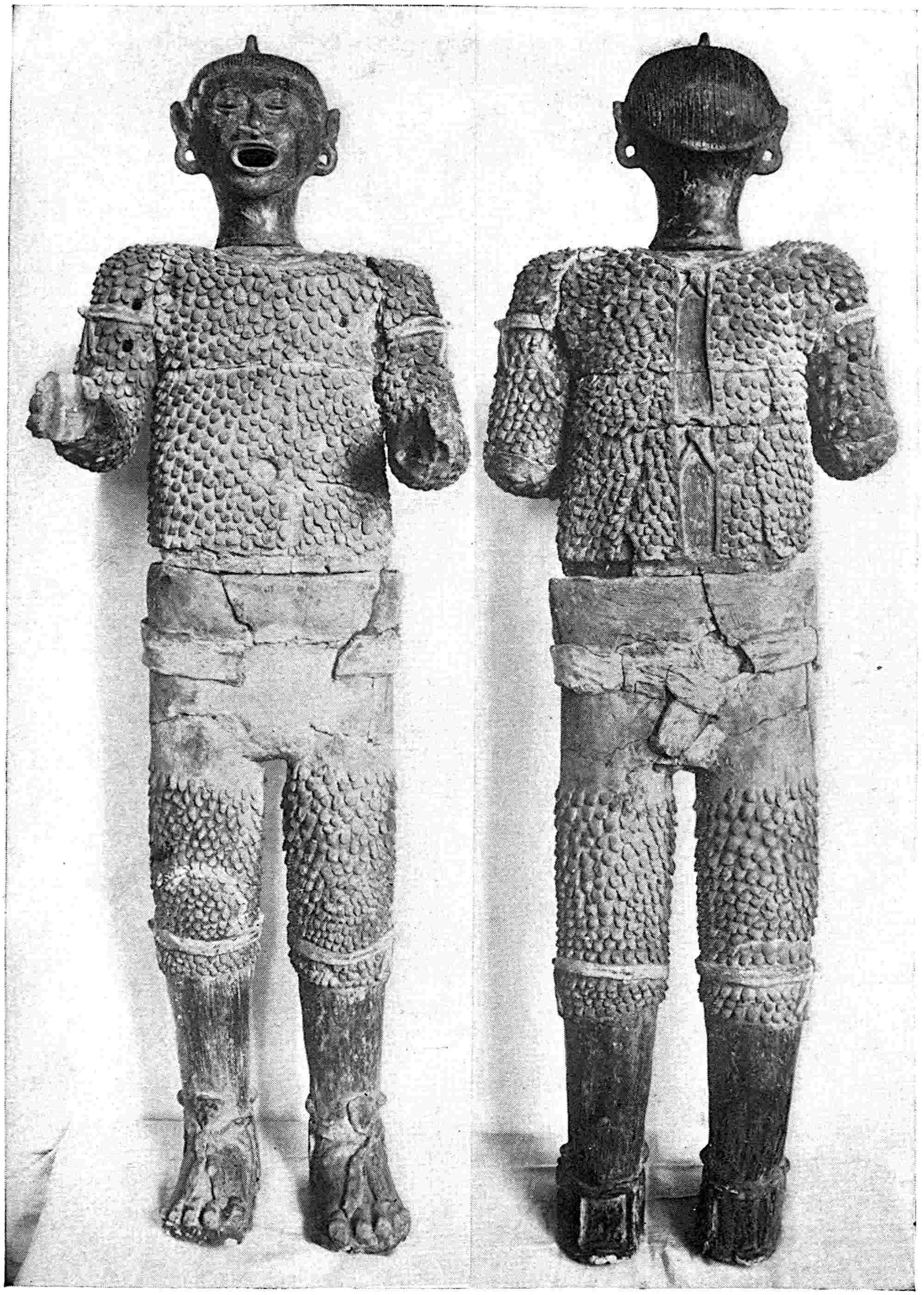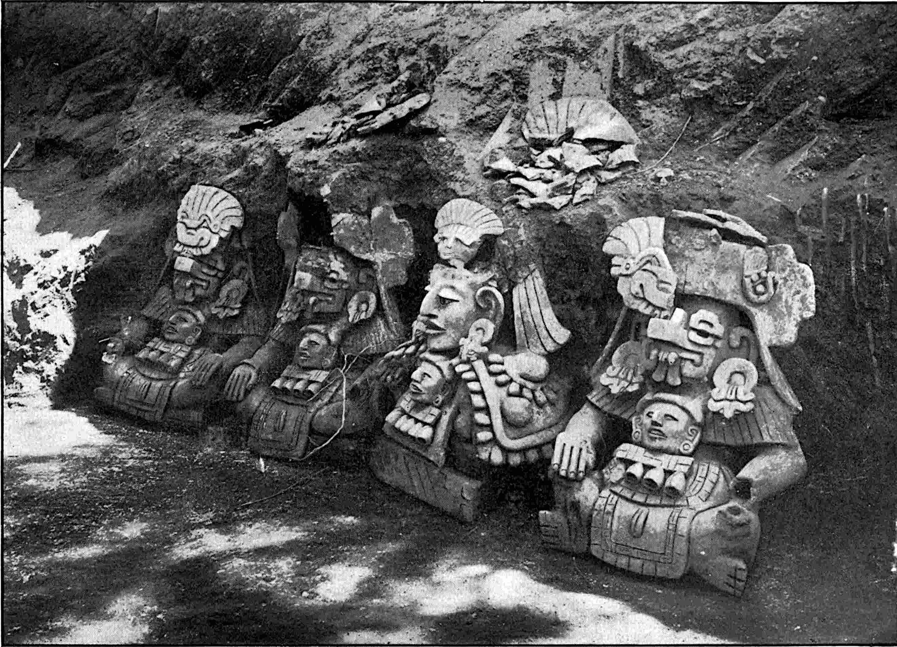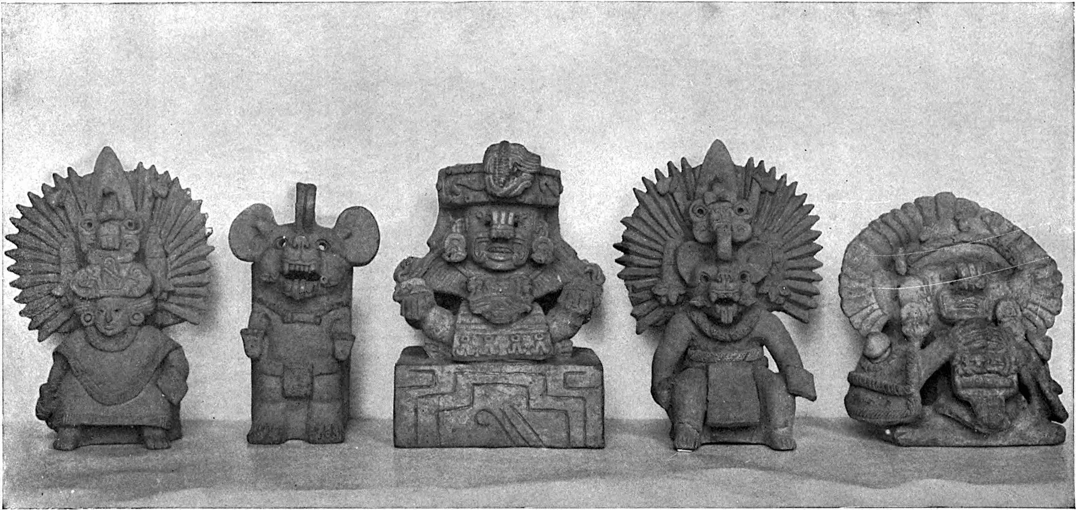 Average height, 15 inches. This is a complete series preserved in the order in which they were found. The usual number of these urns in a series was five. Nothing was put in them and they were not placed inside the burial chambers but in front of the door, on the roof, fastened into the façade, or in niches over the door. See Funeral Urns from Oaxaca, Marshall H. Saville, American Museum Journal, vol. iv. pp. 49–60, and Explorations in Zapotecan Tombs; same author, American Anthropologist, N. S., vol. i. April, 1899.