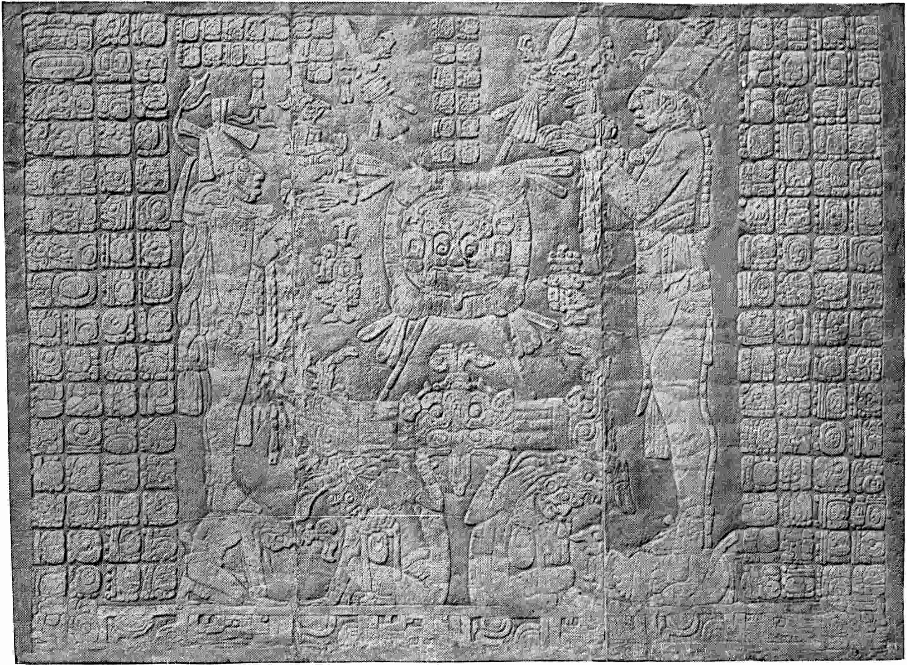 Discovered about 1750; 28 × 38 feet on the ground, about 25 feet high without the “roof-comb,” a feature of the Palenque buildings here particularly well preserved. Like all the structures of the group, this crowns a mound of considerable height. The construction is stone; ornamentation, stucco. Charnay calls attention to the resemblance to a Japanese temple. On pages 210, 235, and 237 constructive features are shown, on page 185 is a reproduction of a tablet from it, and on page 238, second figure, is the ground plan. Page 404 gives another of the group, and page 436 shows geographical location.