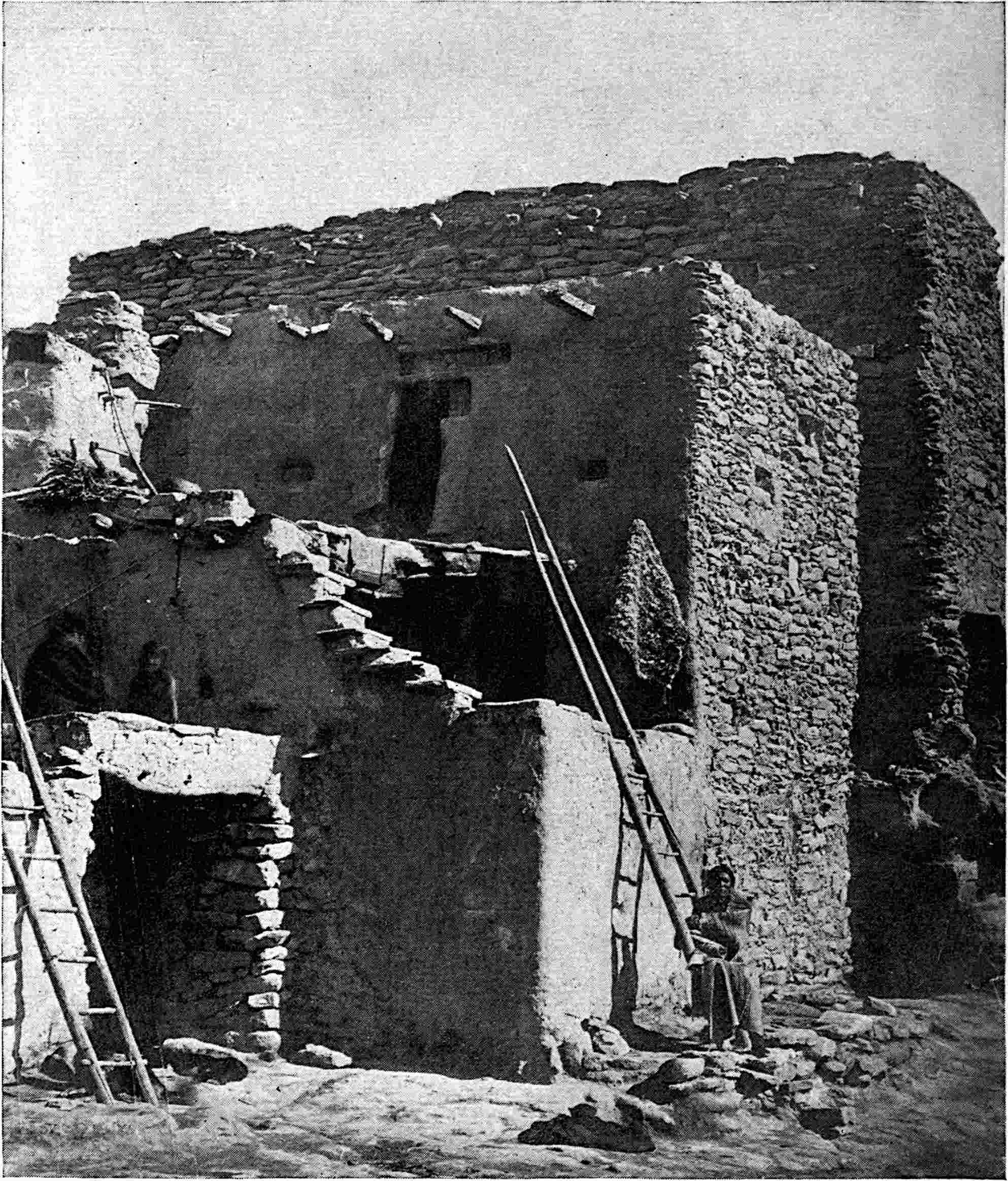 Scattered over the territory claimed or held by a tribe were the houses and villages of the tribe or the sub-tribes. Powell states that “every tribe lived in a village, and every village constituted a distinct tribe.” But the village was often spread over a wide region. Speaking of this, Adair says: “A stranger might be in the middle of one of their populous, extensive towns without seeing half a dozen houses in the direct course of his path.”[366] But this was only in the interior of the country of a tribe. Along the frontier the towns would be more compactly arranged, in order that the people might easily be called to defend them. The villages were usually permanent, though they were frequently, some annually, abandoned temporarily at certain seasons for the pursuit of game or for some other good reason, all the people coming together again as the cold weather approached. The Navajos often have a winter home in the lower, sheltered lands of their territory, while in summer they proceed to the higher levels where the winter snows are deep and the summer grass is high. Each Amerind village always had at least one assembly place for which they had their special names, but the general term that is now often used by ethnologists is that of kiva,[367] borrowed from the Mokis, because the Moki kiva is a representative of the general assembly hall and council-chamber, or lodge. The kiva, besides 414being used for social purposes, as a lounging-place and a working-place for the men, is also used for religious functions. Those structures, therefore, which crowned the mounds of the United States and Mexico, and are usually designated as “temples,” were possibly more of the nature of kivas, a temple in our usage being a structure devoted solely to worship, whereas many Amerind buildings of this class were used for various purposes. Often there were several, depending on the size of the tribe. The tribe was organised on the basis of the gens or the clan, and each gens or clan might have its own kiva. They might also belong to some of the secret orders, so that we may enumerate three kinds: the tribal, or chief kiva, the kiva belonging to the gens or clan, and the kiva belonging to the phratry, or secret society. The gens and the clan were groups of blood relations, or, as put by Powell, “an organised body of consanguineal kindred.”[368] The members of a gens often lived in one house or in a group of houses; for example, among the Iroquois in the long-house,[369] with its row of camp-fires, while in some other tribes each family might have its own house or tent, but they would then generally pitch or build it contiguous to the other habitations of their gens. It was this principle, in vogue in almost all the tribes of America, which directed the character of most of the Amerind structures. Everybody in a tribe belonged to a gens or clan, otherwise he could not be in the tribe. The complete organisation of the tribe then was: a group of families forming a gens or clan, two gentes being represented in each family; the “father must belong to one gens and the mother and her children to another,” descent being commonly in the female line, and marriage within a gens being forbidden; a group of gentes formed the phratry, and a group of phratries formed the tribe, while a group of tribes formed the confederacy, probably the highest form of government the Amerinds reached. The phratry as an organisation was often absent, and the tribe was then composed of the gentes without any further grouping. Powell seems to use “phratry” in a different sense from Morgan and some other writers. Morgan described a phratry as a group of gentes, whereas Powell defines it as simply a brotherhood or society. Each gens governed itself so far as its internal affairs were concerned; that is, it had home rule, just as 416we have it to-day in our towns, counties, etc. It sent delegates to the council of the tribe to represent it, and it elected its own officers. There was sometimes no tribal or head chief. I never could learn of any among the Navajos, and the Iroquois had none. When, as was frequent, there was a sachem, or tribal chief, he was chosen or elected by the chiefs of the various clans or gentes forming the council, but in some tribes he inherited the office, or at least the right to hold it. I understood this to be the case among the Kaivavits Utes of southern Utah. A gens had the right to take into its ranks any alien it chose to. Such a person was then a member of that gens and partook of all the benefits or disadvantages, as the case might be. He was a son or brother or husband, or the corresponding relationships if a woman, and on all occasions was treated as if he had been born into the gens or clan instead of adopted into it. He was therefore eligible for all offices in the tribe, and white men in this way sometimes became chiefs. Beckwourth,[370] who, however, was really supposed by a Crow woman to be her long-lost son, became head chief of the Crows, and held the office with distinction for a number of years. He began by being fifth councillor. “In the Crow nation there are six councillors, and by them the nation is ruled. There are also two head chiefs, who sit with the council whenever it is in session. The office of first councillor is the highest in the nation next to the head chiefs, whose authority is equal. If in any of these divisions, when a matter is brought to the vote, the suffrages are equal, one of the old pipemen is summoned before the council and the subject under discussion is stated to him, with the substance of the arguments advanced on both sides; after hearing this he gives his casting vote, and the question is finally settled.”[371]