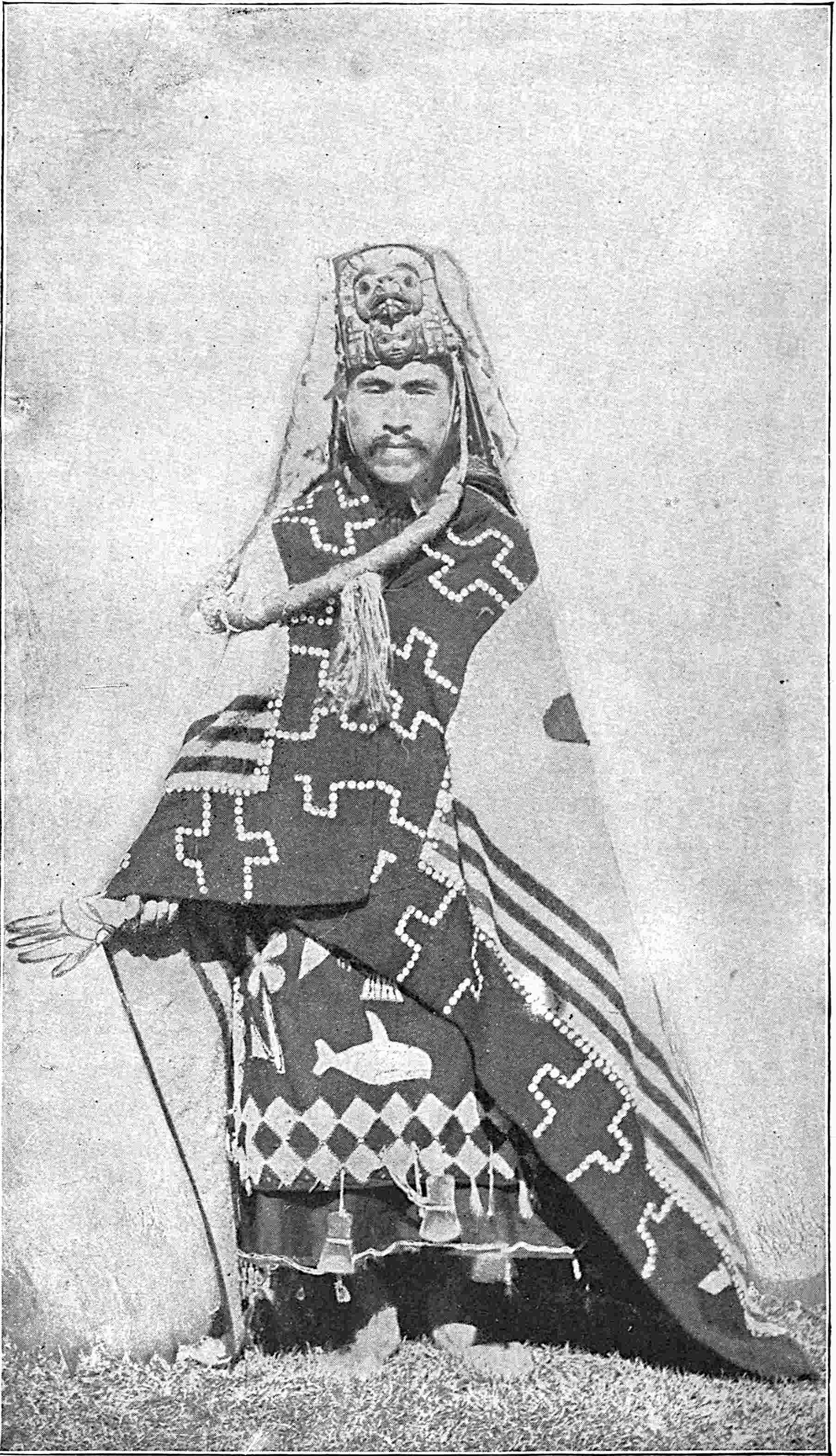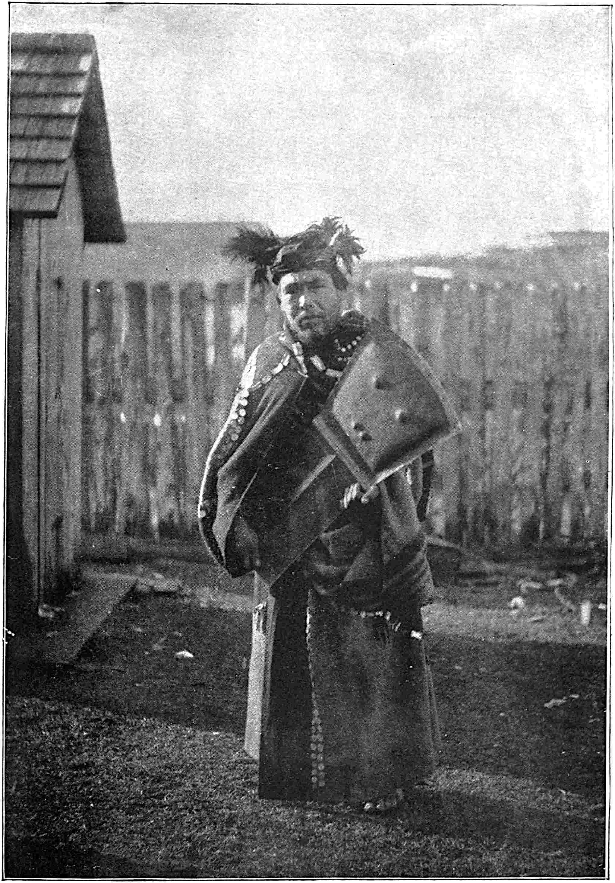 The Chilkat blanket which this man has over his shoulders “is so called because the best specimens come from the Chilkat country,” says Niblack. All the North-west coast tribes use it. The warp is cedar bark twine and the woof a yarn made of mountain-goat wool. See pages 128, 142.