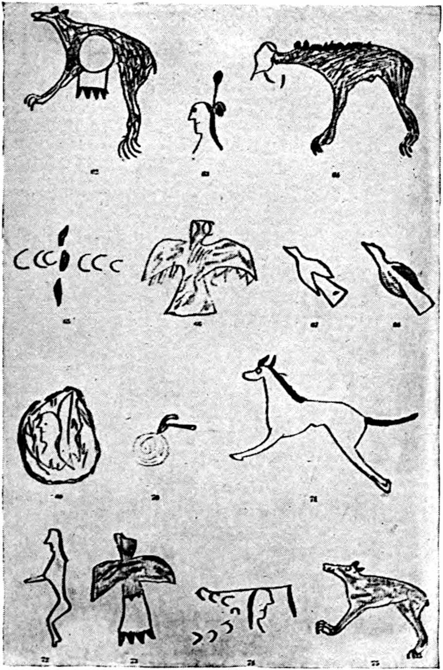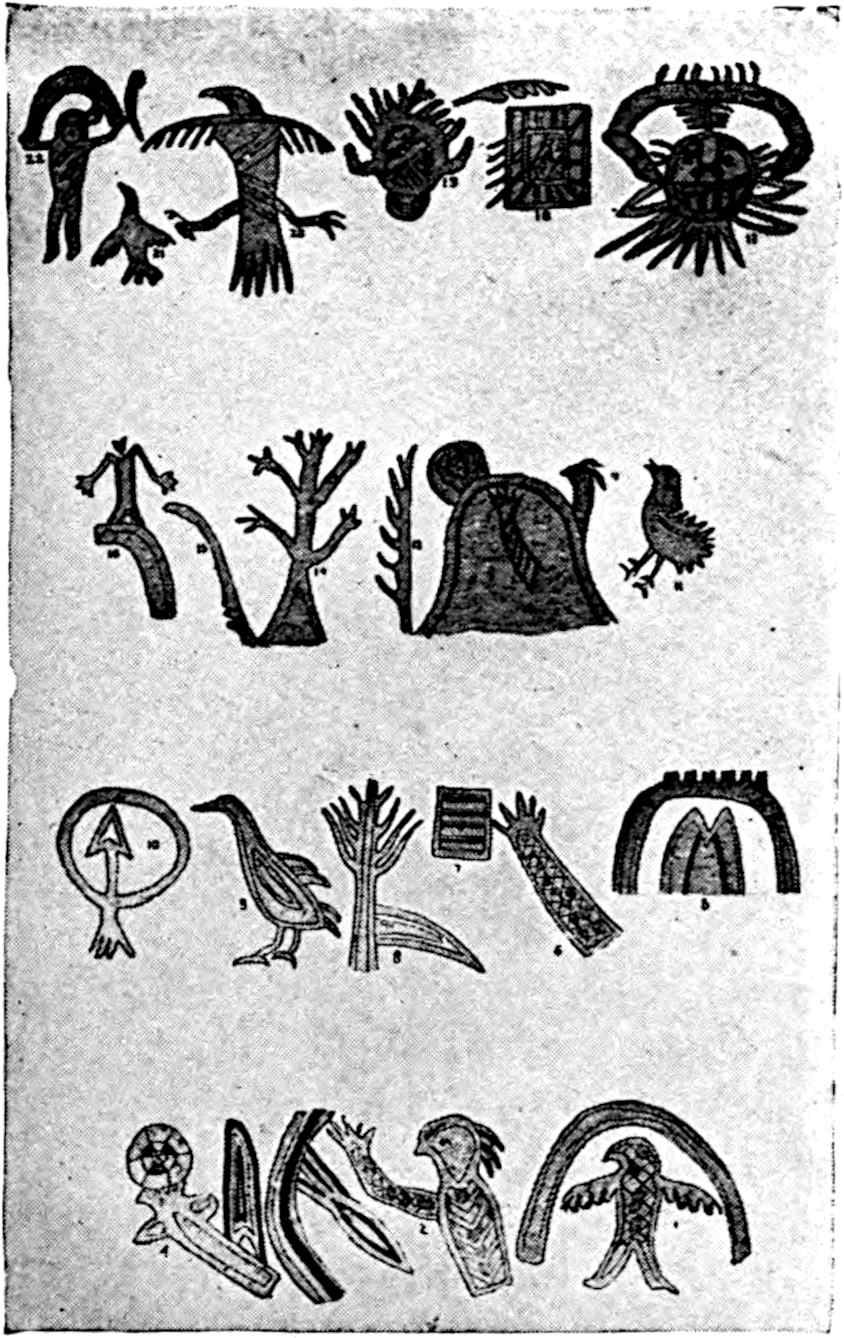 It is supposed that the mnemonic symbols originated in sign-language. One of the most striking examples of the universality of the sign-language is the case, cited by Mallery, of a professor in a deaf-mute college, who, visiting several wild tribes, was able to communicate freely with them though he knew nothing of their spoken languages. It was a natural thing that races should attempt to record these signs, and some early hieroglyphs in Egyptian can clearly be traced to them. These same efforts occurred amongst the Amerind stocks in varying degree. Picture-writing, the world over, as well as particularly in North America, probably grew out of sign-language, giving, as the first stage in the development, sign-language, second pictographs, third alphabet. These merge into each other, as there was not a series of jumps, but a slow and gradual progression. Many pictographs are merely representations of natural objects and had no special significance, others were guide marks to springs, others recorded visits to certain localities. Mallery states a particularly interesting fact, that within “each particular system ... every Indian draws in precisely the same manner.” Therefore, if a perfect understanding of each tribal system is obtained, the various rock markings and other pictographs can be classified. Sometimes frauds[48] have been attempted by white men, one well-known case being where an Illinois blacksmith copied on six copper plates designs from a Chinese tea-box, and then claimed that the plates had been found in a mound. Recently a most ingenious counterfeiter of stone implements was discovered in Dane County, Wis. He had been selling the spurious implements for years. They are usually of bizarre patterns.[49] Bandelier says that “it is certain that some of 50them [pictographs in Mexico] were manufactured after the Conquest, not with the intention of fraud, but with a view to a compromise between the new method of recording and the old one, which the new teachers were loath to comprehend and which they refused to adopt.” Powell classifies all the picture-writings as: (1) Mnemonic—songs, traditions, treaties, war, and time; (2) Notification—departure, direction, condition, warning, guidance, geographic features, claim or demand messages, and communications and record of expeditions; (3) Totemic—tribal, gentile, clan, and personal designations, insignia, tokens of authority, personal names, property marks, status of individuals, signs of particular achievements; (4) Religious—mythic personages, shamanism, dances, ceremonies, mortuary practices, grave-posts, charms, fetiches; (5) Customs, habits; (6) Tribal history; (7) Biographic.