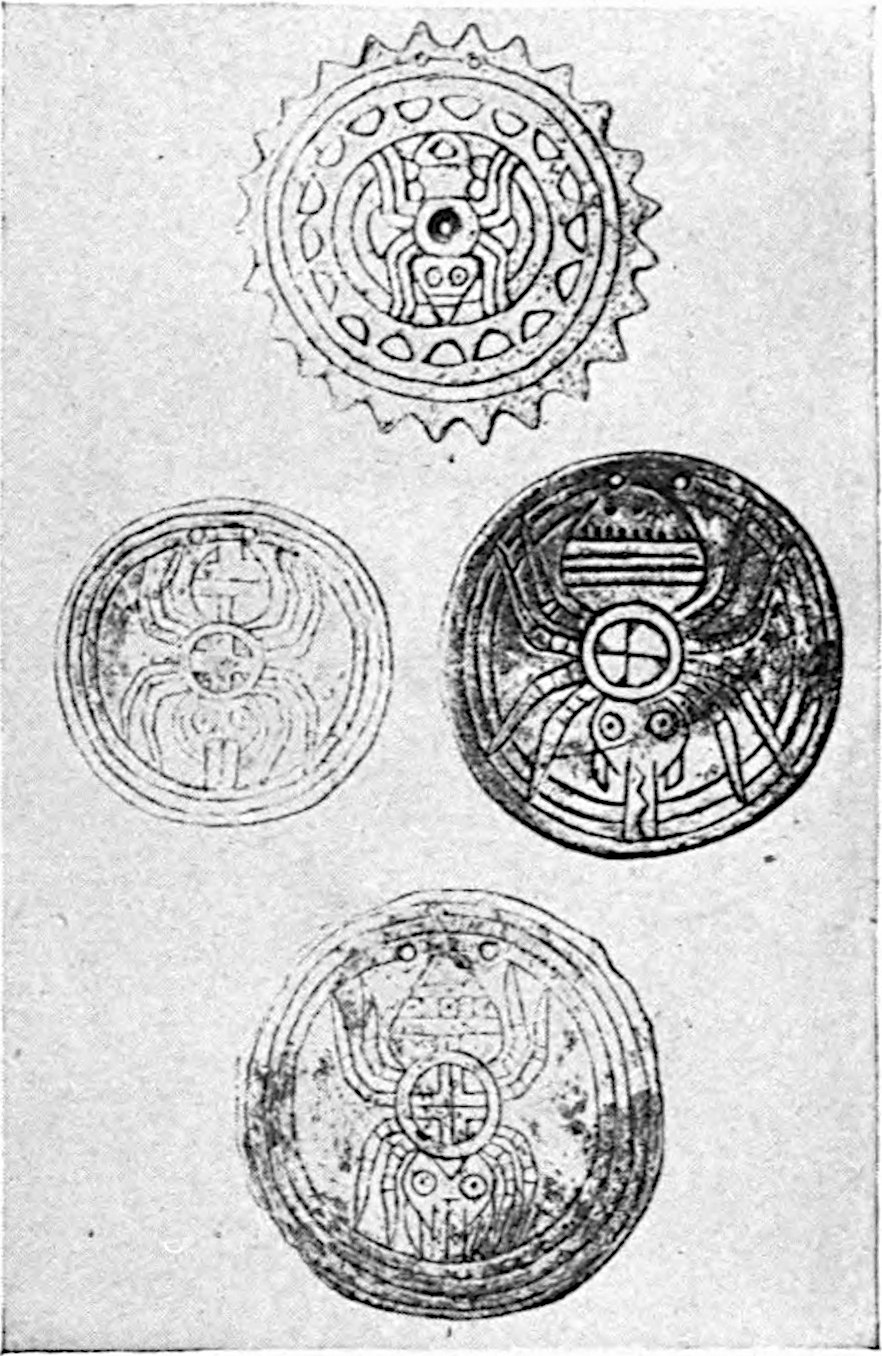 The writings of the Cherokees in the syllabary of Sequoyah 37are of sacred formulas. These were written out by the shamans and are thoroughly Amerind. “They are not disjointed fragments,” says Mooney, who made a careful study of the subject, “of a system long since extinct, but are the revelation of a living faith which still has its priests and devoted adherents.” The language used is full of archaic forms and figurative expressions, some of which even the shamans cannot now understand. Some of these are highly poetical, especially the prayers “used to win the love of a woman or to destroy the life of an enemy, in which we find such expressions as: ‘Now your soul fades away—your spirit shall grow less and dwindle away never to reappear.’ ‘Let her be completely veiled in loneliness,—O Black Spider, may you hold her soul in your web, so that it may never get through the meshes!’ ‘Your soul has come into the very centre of my soul, never to turn away.’”[35]