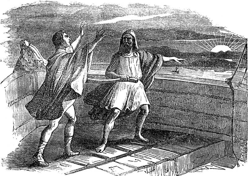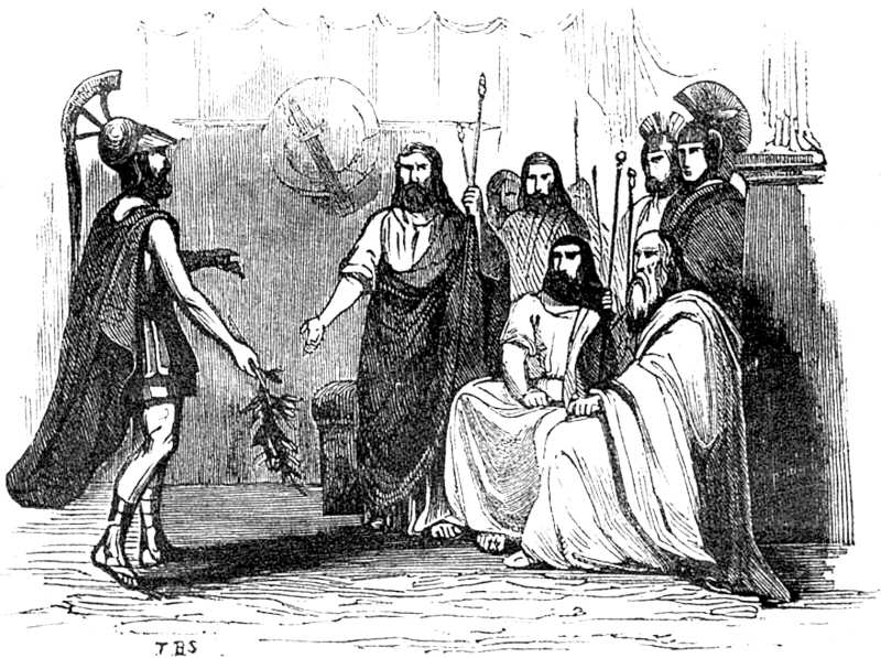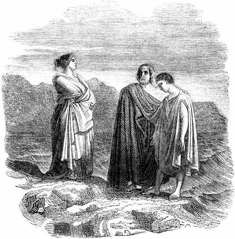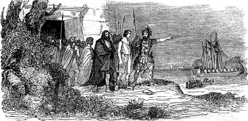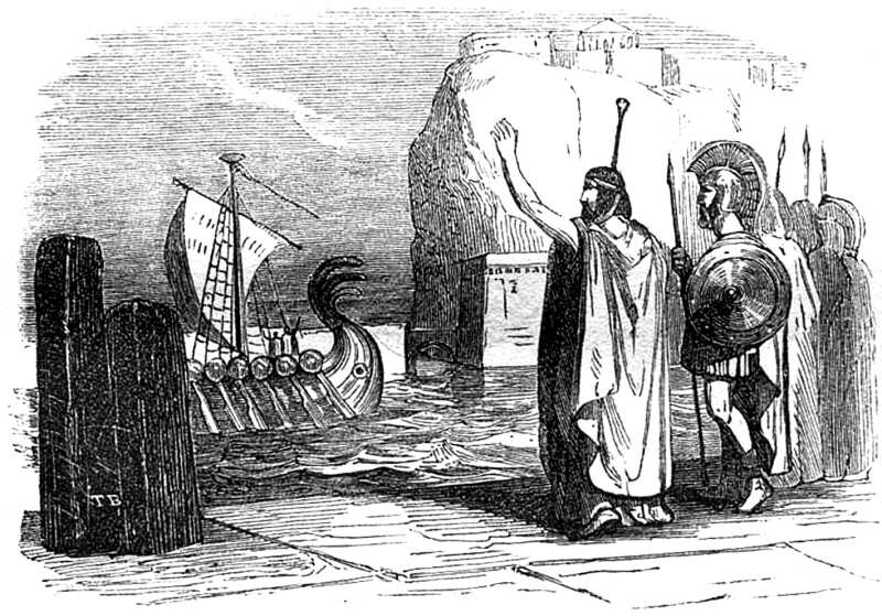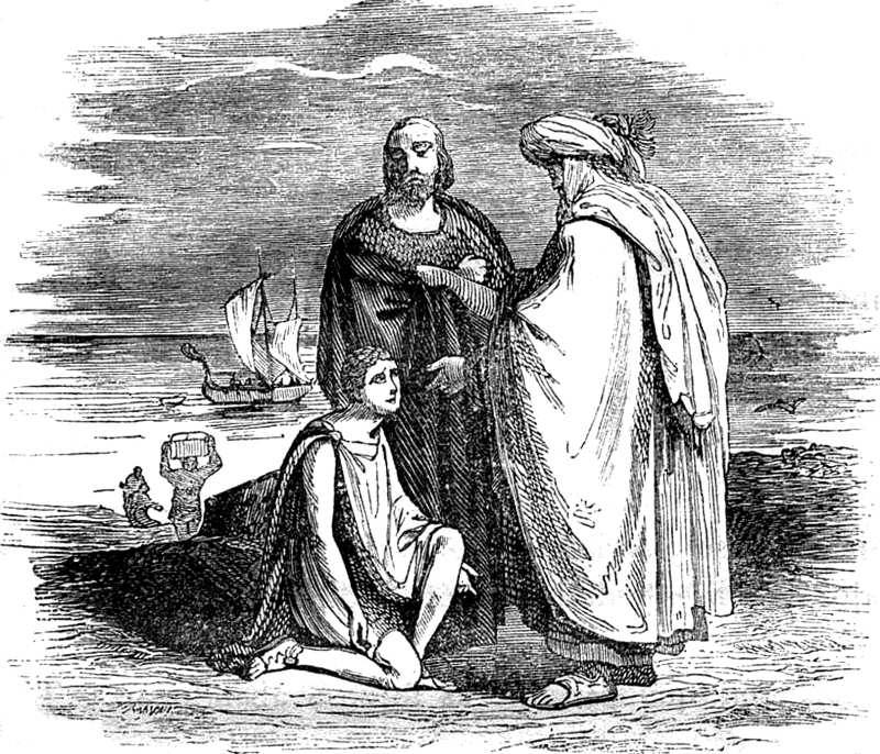 Apenas terminó su discurso Méntor, se acercó Telémaco presuroso hacia los feacios del bajel que se hallaba detenido en aquella costa; y dirigiéndose a un anciano, preguntole de dónde venían, a dónde se dirigía su navegación, y si habían visto a Ulises.