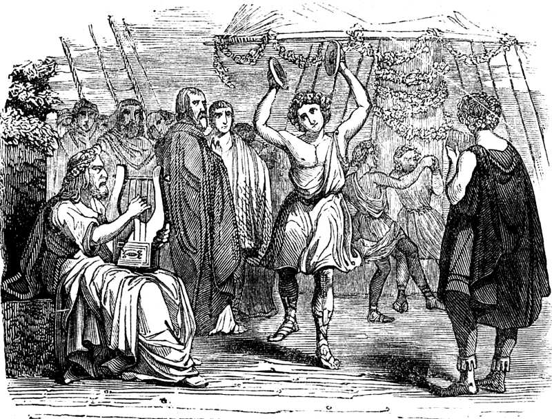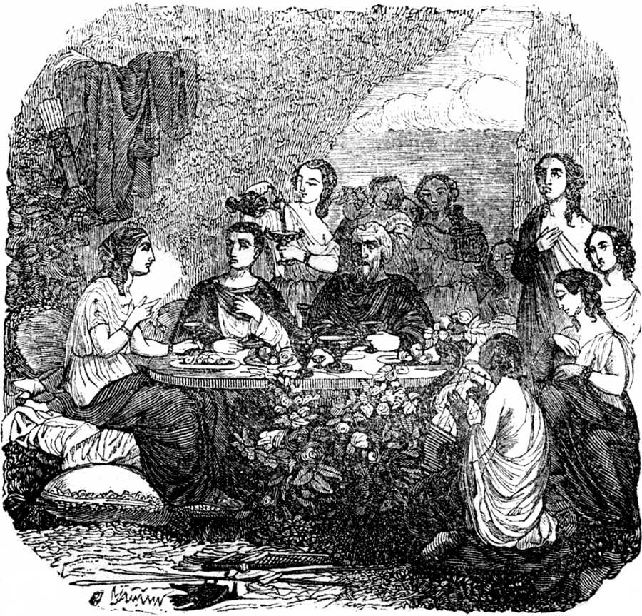 Volvieron en seguida adonde se hallaba Calipso, que los esperaba: sirvieron las ninfas, vestidas de blanco y con el cabello trenzado, una comida sencilla, pero exquisita por el gusto y aseo. No se veían otras viandas que las aves cogidas por aquellas en las redes, y los animales que habían traspasado con sus flechas en la caza: circulaba un vino más dulce que el néctar desde grandes vasijas de plata a tazas de oro coronadas de flores. Trajeron en canastillos todas las frutas que ofrece la primavera y que esparce el otoño sobre la tierra. Al mismo tiempo comenzaron a cantar cuatro ninfas, primero el combate de los dioses contra los gigantes, después los amores de p. 10Júpiter y de Semele, el nacimiento de Baco y su educación dirigida por el viejo Sileno, la carrera de Atalanta y de Hipómenes, vencedor con el auxilio de las manzanas de oro traídas del jardín de las Hespérides; y por último cantaron también la guerra de Troya, encumbrando hasta los cielos los combates y prudencia de Ulises, acompañando la primera de las ninfas, llamada Leucótoe, con la armonía de su lira la dulce voz de las demás.