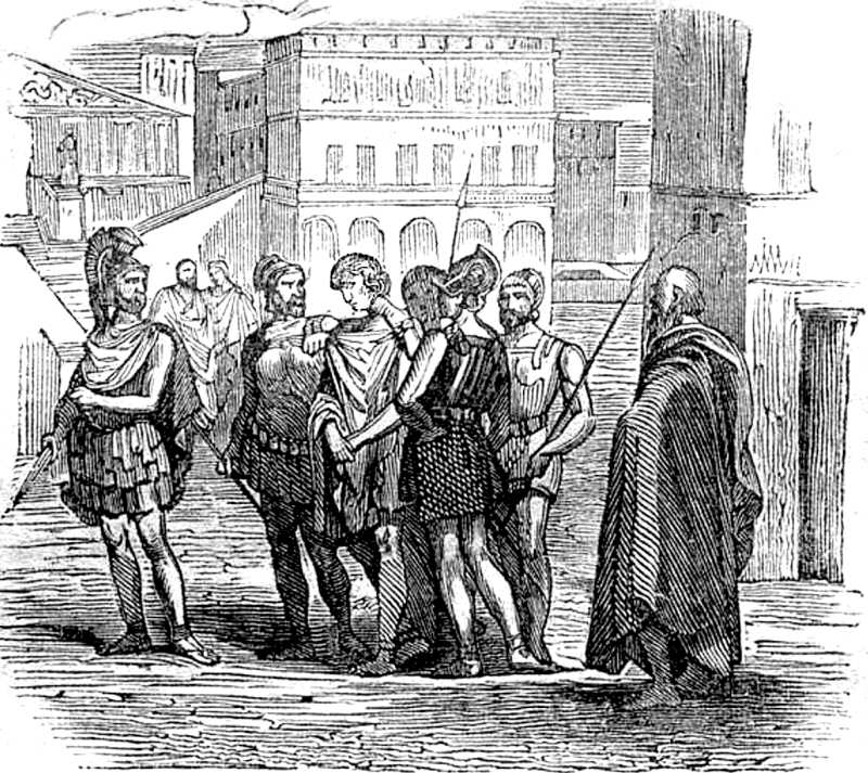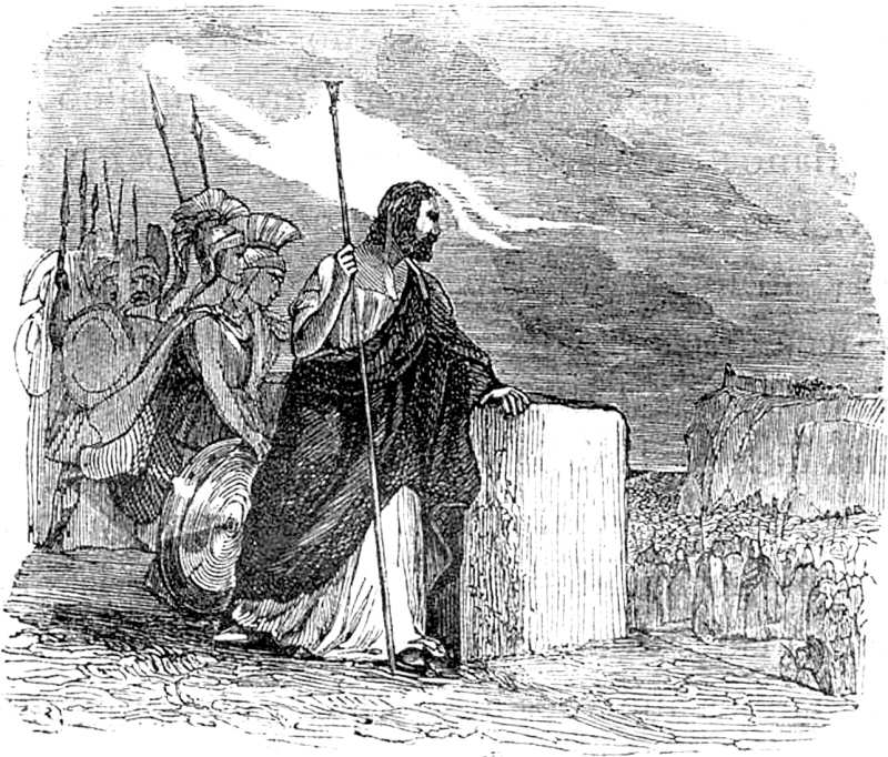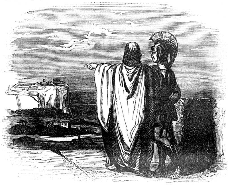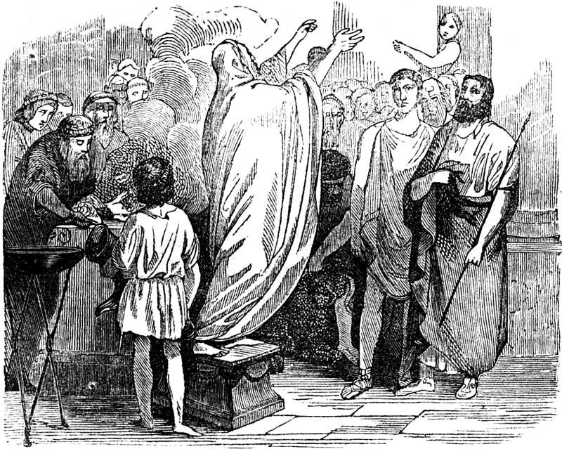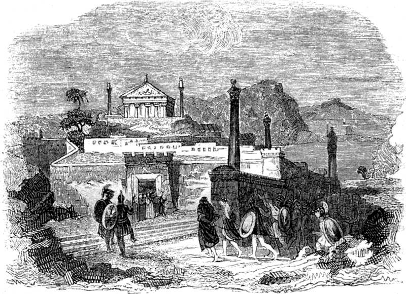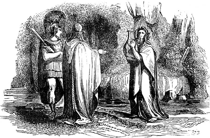 Gustoso acepto, contestó el anciano, lo que con tanta bondad y cortesía me ofreces; y plazca a los dioses remunerar tu piadosa protección a los extranjeros: vamos, pues, al templo, y mientras llegaban a él refiriole el motivo de su viaje.