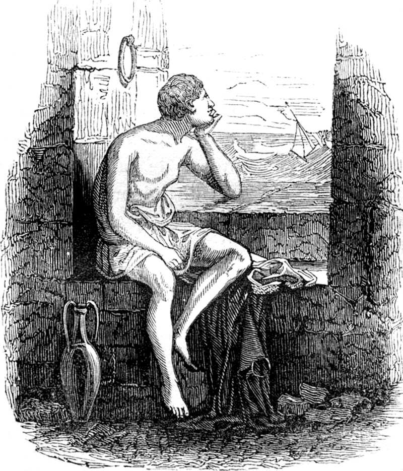 Sin consuelo vivía Calipso desde la partida de Ulises, y el exceso de su dolor hacía se considerase más infeliz aun, por ser inmortal. No resonaban ya en su gruta los armoniosos acentos de su dulce voz, ni las ninfas que la acompañaban se atrevían a turbar su melancólico silencio. Paseábase muchas veces por las floridas praderas que esmaltaban la isla, encantando la vista con las gracias de una perpetua primavera; mas lejos de templar su amargura la amenidad de tan deliciosos sitios, traían a su memoria el triste recuerdo de Ulises, a quien había visto complacida tantas veces a su lado. Quedábase inmóvil en la playa, y bañándola con sus lágrimas volvía sin cesar el rostro hacia el sitio por donde, rompiendo las olas, había desaparecido a sus ojos el navío de Ulises.