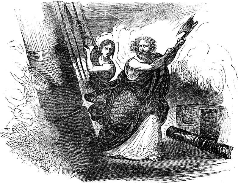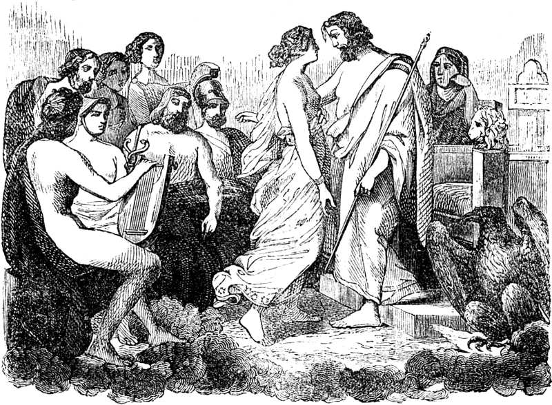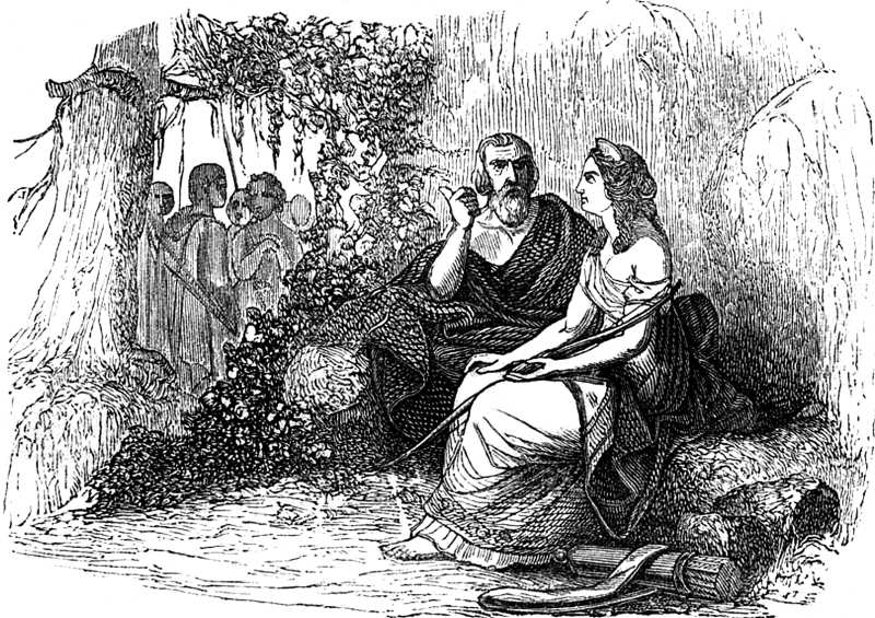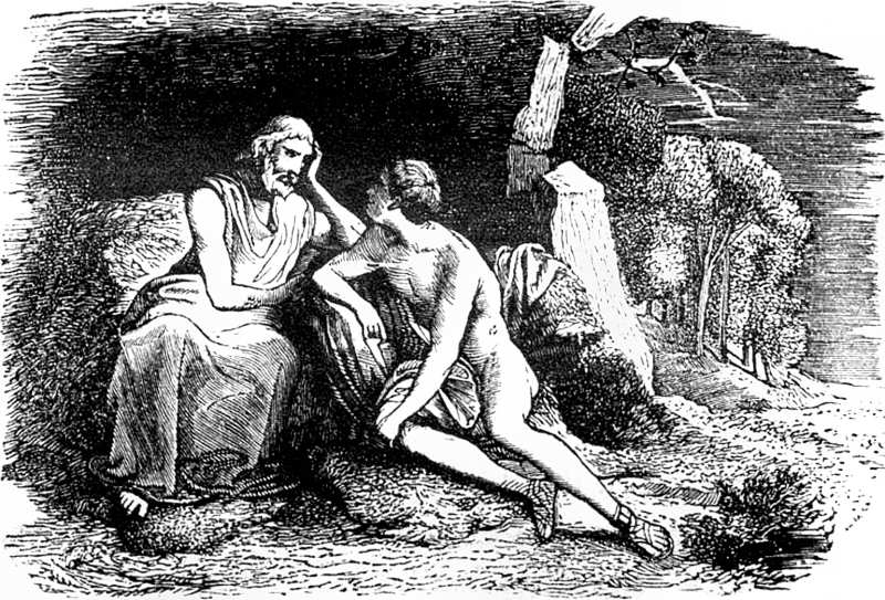 Añadió a estas palabras la diosa largos razonamientos para demostrar cuán feliz había sido Ulises a su lado: refirió las aventuras de este en la caverna del cíclope Polifemo y en casa de Antífates, rey de los lestrigones, sin olvidar cuanto le ocurrió en la isla de Circe, hija del Sol, ni los peligros que corrió entre Escila y Caribdis, y la última tempestad excitada por Neptuno cuando se separó de ella, procurando dar a entender había perecido en aquel naufragio, y omitiendo su arribo a la isla de los feacios.