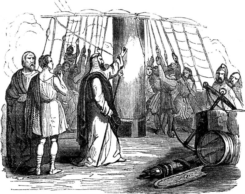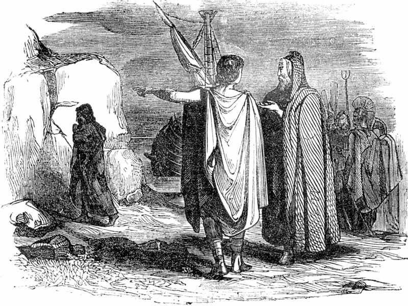 Todavía quiso Méntor poner a prueba el sufrimiento de Telémaco de un modo más fuerte. Cuando corría a estrechar a los marineros para que apresurasen la partida, le detuvo Méntor para que ofreciese a Minerva un sacrificio; y con la mayor docilidad lo ejecutó. Prepararon p. 532dos altares de césped, ardió el incienso y corrió la sangre de las víctimas. Dirigió Telémaco al cielo fervorosas súplicas, y reconoció la poderosa protección de la diosa.
