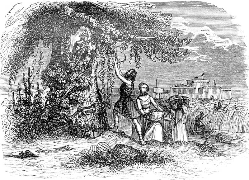 Mas no bastaba esto para satisfacer el generoso corazón de Aristonoo; adornó toda la casa de muebles nuevos, aunque sencillos y modestos, aseados y agradables; llenó los graneros de los ricos presentes de Ceres, y la bodega de vino de Quíos digno de ser servido en la mesa del gran Júpiter por la mano de Hebe o de Ganimedes, añadiendo alguna porción de vino parmeniano y provisión abundante de miel de Himeto y de Hibla, y de aceite de Ática, casi tan dulce como la misma miel; y por último, innumerables vellones de lana muy fina y tan blanca como la nieve, rico despojo de las tiernas ovejas que se alimentaban en las montañas de la Arcadia y en las grandes praderas de la Sicilia; en cuyo estado entregó la casa a Sofrónimo con cincuenta talentos euboicos, reservando para sus parientes los bienes que poseía en la península de Clazómenas, en las inmediaciones de Esmirna, de Lébedos y de Colofón, que eran de mucho valor, y en seguida se embarcó Aristonoo para regresar a la Jonia.