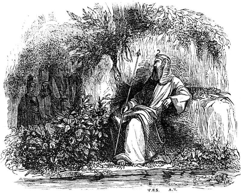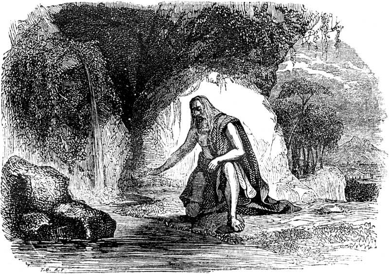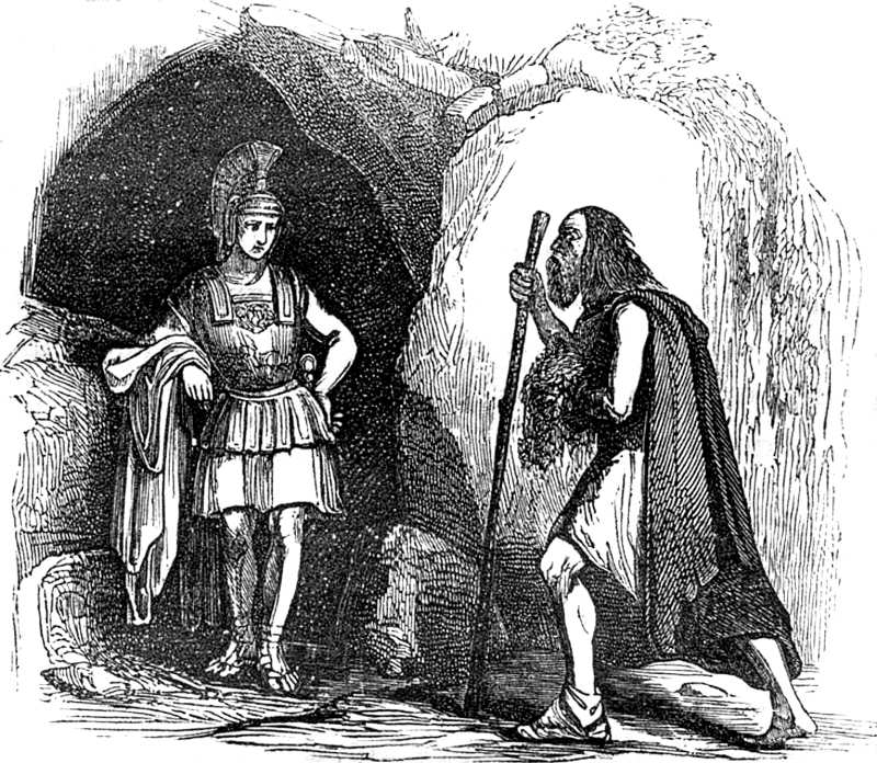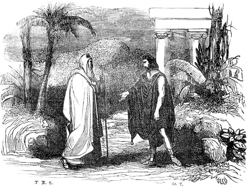 En tanto que vivía feliz en su retiro, sin haberes, vio cierto día a la orilla del mar un venerable anciano que le era desconocido. Era un extranjero que acababa de p. 540llegar a la isla, y admiraba los bordes del mar en que sabía haber flotado en otro tiempo la isla entera; contemplaba la costa sobre cuyos arenales y rocas se alzaban vistosas colinas que perpetuaban el verdor y las flores, y las cristalinas aguas de los ríos y fuentes que regaban tan delicioso país; y al acercarse a los bosques sagrados que circuían el templo, maravillábale su permanente verdura que los más violentos aquilones no osaron nunca marchitar. Examinaba con asombro la bella arquitectura del templo edificado en mármol de Paros, blanco cual la nieve y adornado de altas columnas de jaspe; y entretanto no ocupaba menos la atención de Sofrónimo el aspecto del extranjero. Caíale sobre el pecho la blanca barba: surcado el rostro de arrugas, pero sin deformidad, se conservaba aún exento de las injurias de la edad senil. Era su estatura alta y majestuosa, aunque algo encorvado su cuerpo, y apoyábase en un bastón de marfil. ¡Oh extranjero!, le dijo Sofrónimo. ¿Qué buscas en esta isla que parece te es desconocida? Si es el templo de la divinidad que la protege, hele allí: me ofrezco a encaminarte a él; pues respeto a los dioses, y sé lo que ordena Júpiter en cuanto a los socorros que deben prestarse a los extranjeros.