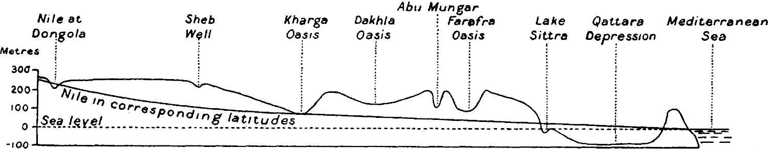 Profile from the Nile at Dongola through the depressions of Kharga, Dakhla, Abu Mungar, Farafra, and Qattara to the Mediterranean. Vertical scale 500 times the horizontal. Total length of section about 1700 kilometres; for more than half this distance the ground-level is seen to be above a line drawn through the levels of the Nile in corresponding latitudes.