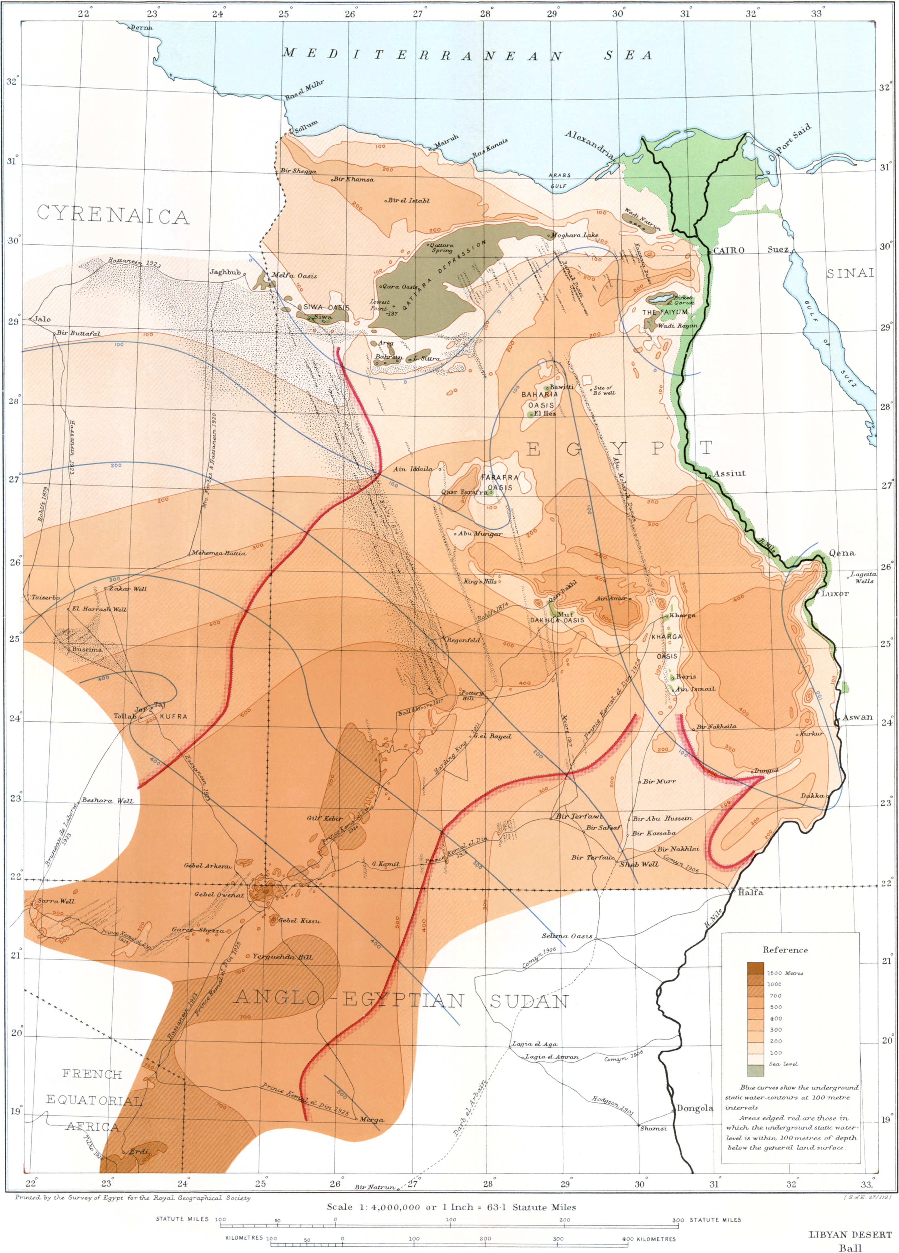 Some fifteen years ago I essayed the construction of a contoured map of the Libyan Desert, in connection with the International “Million” map of the world. But I had to give up the task, finding that there were vast areas without a single observation for altitude, while such altitude-data as did exist were open to errors of a magnitude intolerable for even a preliminary contouring of the areas with which they were concerned. The attempt however was not without its value, because it[23] drew attention to the great lack of reliable levels in the Libyan Desert, and to the necessity of remedying this defect before even an approximately true picture of the general relief could be obtained.