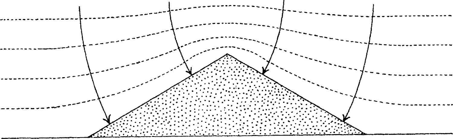But while it was thus impracticable to prepare maps showing everywhere the depth at which underground water actually exists, I conceived that it might be quite possible to prepare maps showing static water-levels; that is, the levels to which the water would anywhere rise hydrostatically when once it was tapped by borings. For the slope of the static water-surface between known points will be largely independent of the underground structure of the intervening country. Apart from any physical changes which may still be going on in the underground rocks themselves through geological agencies—changes which, if taking place at all, must be so slow as to be negligible except in the course of centuries—the only factors which can affect the slope of the static water-surface, once it has been established, are variations either in the rate of supply of water to the beds, or in the rate at which it is removed from them. As regards variations in the rate of supply, it is obvious that variations in the annual rainfall of the Erdi and Ennedi region must cause very considerable variations from year to year in the amount of water received by the underground beds. But the resistance of friction to the flow of water through the pores of the sandstones is so great, that the annual oscillations of pressure must be rapidly damped out as the distance from the place of influx increases; consequently the levels of the water in the wells of the Egyptian oases (and even, so far as is known, that of the lake at Merga) show little or no annual variation. And with regard to variations in the rate of removal of water from the beds (by outflow to the Nile, or to the sea, or into lakes wherein it evaporates, or by the exploitation of wells and springs for irrigation purposes), these changes, though possibly in some cases they may be progressive, and in restricted localities very sensible, can exercise but little influence from year to year on the general distribution of water-pressure within the underground strata. We may therefore conclude that the gradient of the static water-surface will everywhere have assumed practically a steady state. Unlike the actual water bearing beds themselves, which may be much folded, the static water-surface will in general have simple gentle slopes everywhere in the open desert. In the oases, of course, where numbers of wells yielding large outputs have been bored in proximity to each other, the static water surface will be wrinkled; but over the vast bulk of the desert the[108] contours may be expected to be smooth curves. The diagrammatic section below will, I think, make clear this point about the general non-dependence of the shape of the static water-surface on the geological structure: