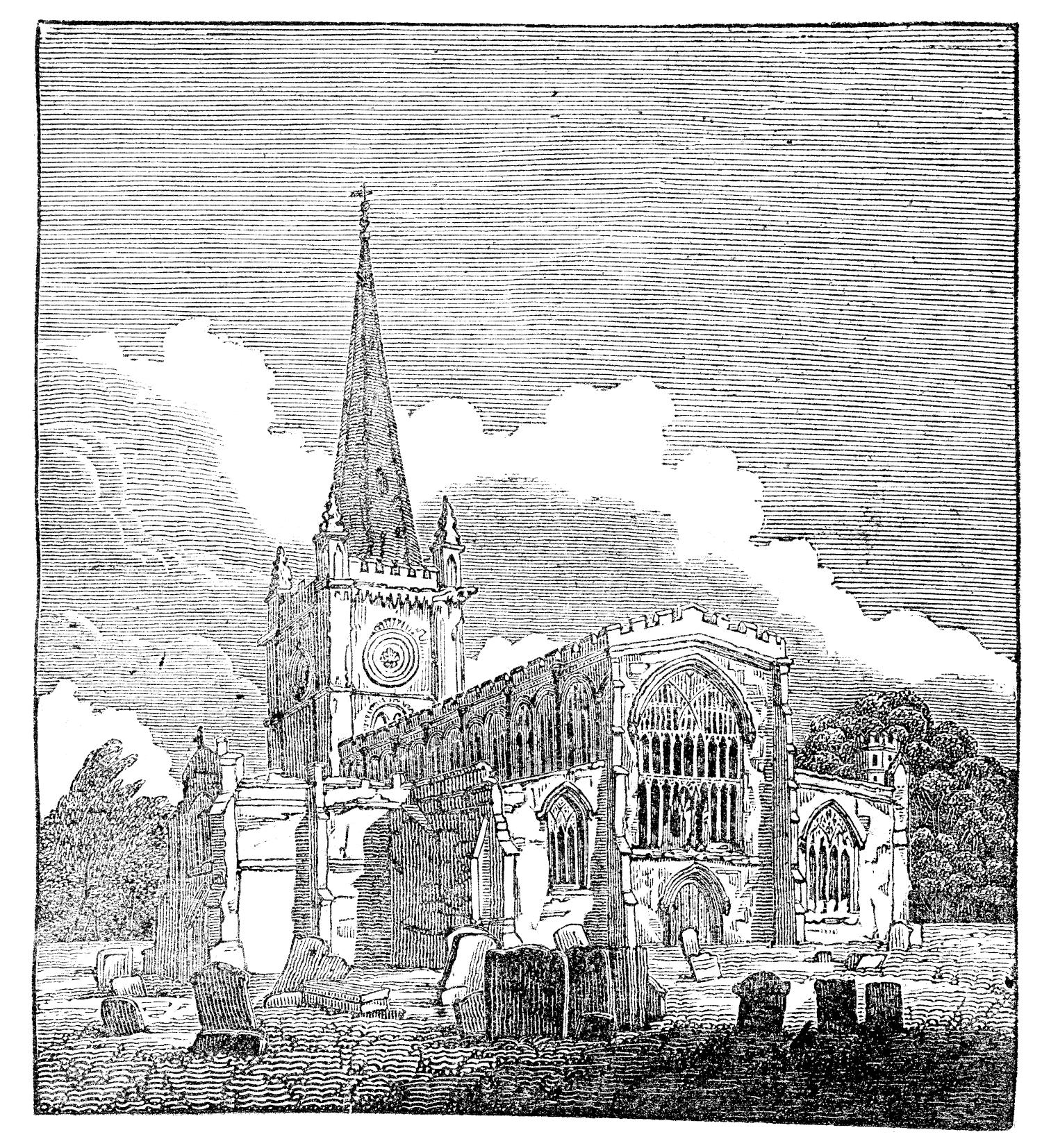 “From the birth-place of Shakspeare a few paces brought me to his grave. He lies buried in the chancel of the parish church, a large and venerable pile, mouldering with age, but richly ornamented. It stands on the banks of the Avon, on an embowered point, and separated by adjoining gardens from the suburbs of the town. Its situation is quiet and retired: the river runs murmuring at the foot of the church-yard, and the elms which grow upon its banks droop their branches into its clear bosom. An avenue of limes, the boughs of which are curiously interlaced, so as to form in summer an arched way of foliage, leads up from the gate of the yard to the church-porch. The graves are overgrown with grass; the grey tomb-stones, some of them nearly sunk into the earth, are half covered with moss, which has likewise tinted the reverend old building. Small birds have built their nests among the cornices and fissures of the walls, and keep up a continual flutter and chirping; and rooks are sailing and cawing about its lofty grey spire.