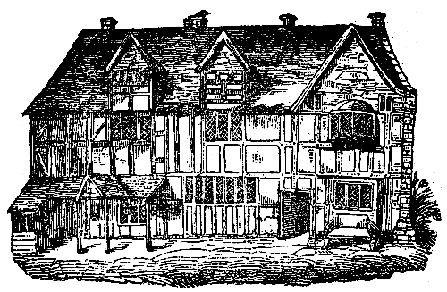 Since the visit of Mr. Irving to Stratford, the inscriptions on the walls of Shakspeare’s house have been obliterated. We can no longer hunt out the hand-writing of Garrick or Byron amidst the crowd of Smiths and Whites whom curiosity had brought hither. The ancient tenant of the house, the keeper of the Shaksperian relics described above, being ejected from the premises which she had so long occupied with profit, in a fit of wrath had the sacred walls smeared over with whitewash the night before she quitted them. The old lady had moved with her heap of relics to a house on the opposite side of the way when we visited Stratford about seven years ago. But the knowledge of her malicious outrage prevented us looking upon her trumpery with any patience. We had ceased to have any faith in these matters. We refused to sit in her Shakspeare’s chair, affirming, to her great mortification, that the real chair had been sold to the Empress of Russia; and, worst of all, we refused to purchase her own play of the Battle of Waterloo. Poor woman! she claimed to be a lineal descendant from the poet, and to prove her claim to the inheritance of his genius, wrote the most execrable verses that folly ever produced. We could have forgiven her bad verses, had some of Shakspeare’s good humour and kindness of heart descended to her. But she whitewashed out all the names, noble and ignoble, of the sacred chamber to spite her successor! Her play and her plaster doubly destroyed all belief in her pedigree! We should add, that the exterior of Shakspeare’s house has been much altered within the last forty years. The following cut exhibits it as it appeared in 1788.