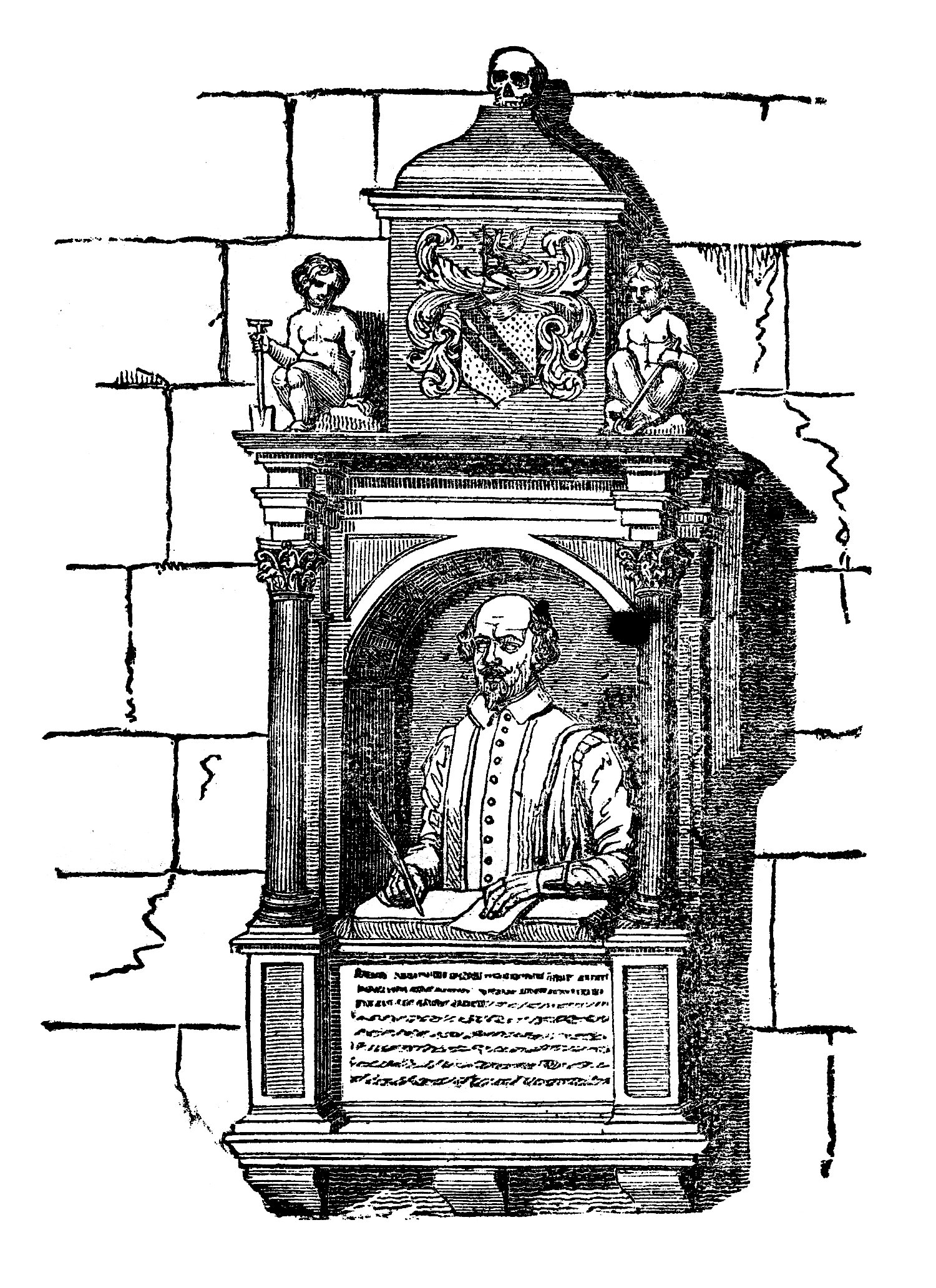 “Just over the grave, in a niche of the wall, is a bust of Shakspeare, put up shortly after his death, and considered as a resemblance. The aspect is pleasant and serene, with a finely arched forehead; and I thought I could read in it clear indications of that cheerful, social disposition, by which he was as much characterized among his contemporaries as by the vastness of his genius. The inscription mentions his age at the time of his decease—fifty-three years; an untimely death for the world: for what fruit might not have been expected from the golden autumn of such a mind, sheltered as it was from the stormy vicissitudes of life, and flourishing in the sunshine of popular and royal favour.