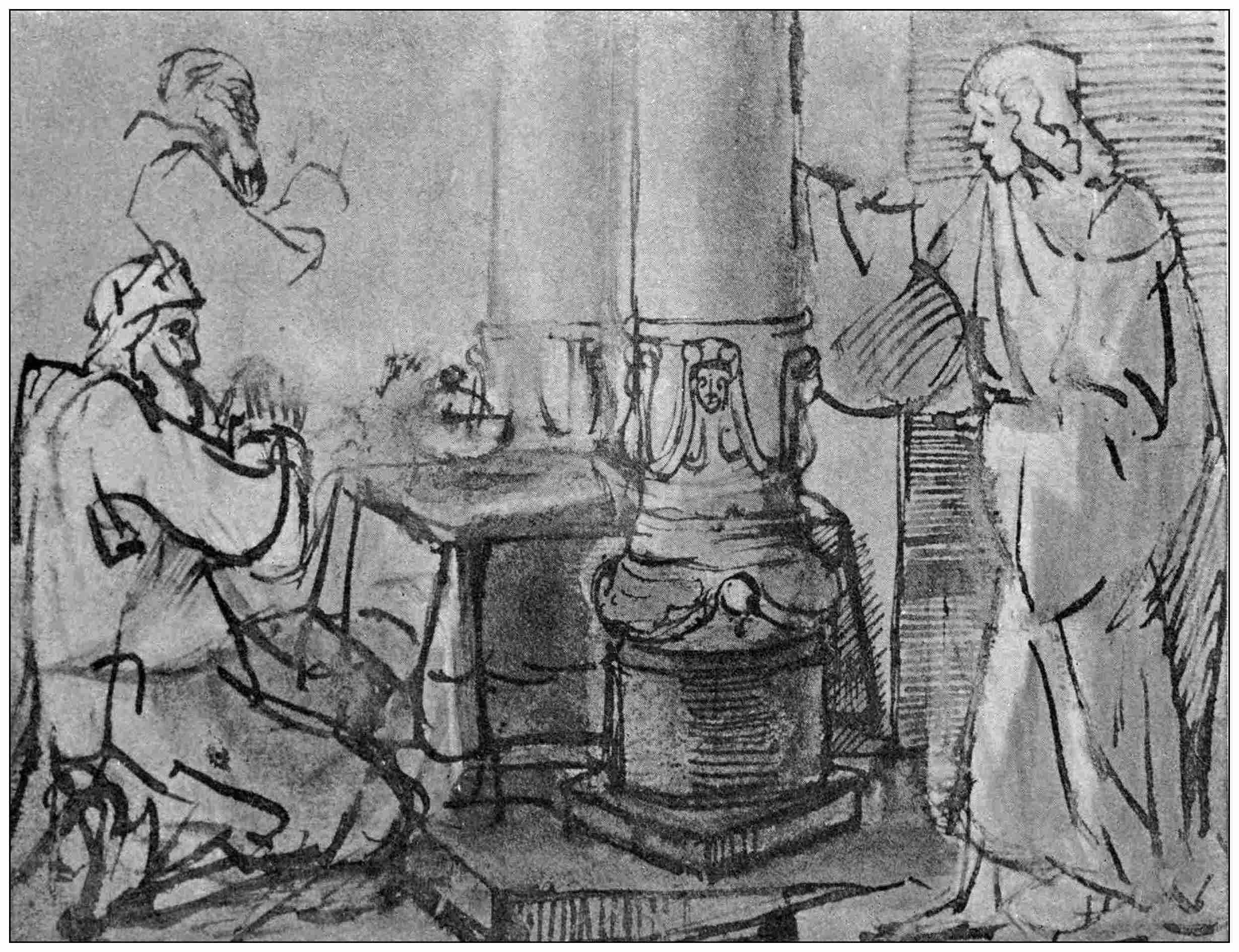 Two drawings are reproduced here from the British Museum Collection. These drawings of his, made on the impulse of the moment, with expression as the one aim, show the richness of his imagination and his mastery more clearly than do his paintings, where other aims and problems enter, and sometimes confuse or obscure the thought. They are most wonderful in directness and expressiveness; in a happy instinctive rightness of arrangement, which seems inevitable. Every essential thing is given with the slightest of means—with the greatest economy of line; yet they are not slight sketches, but full and complete expressions.