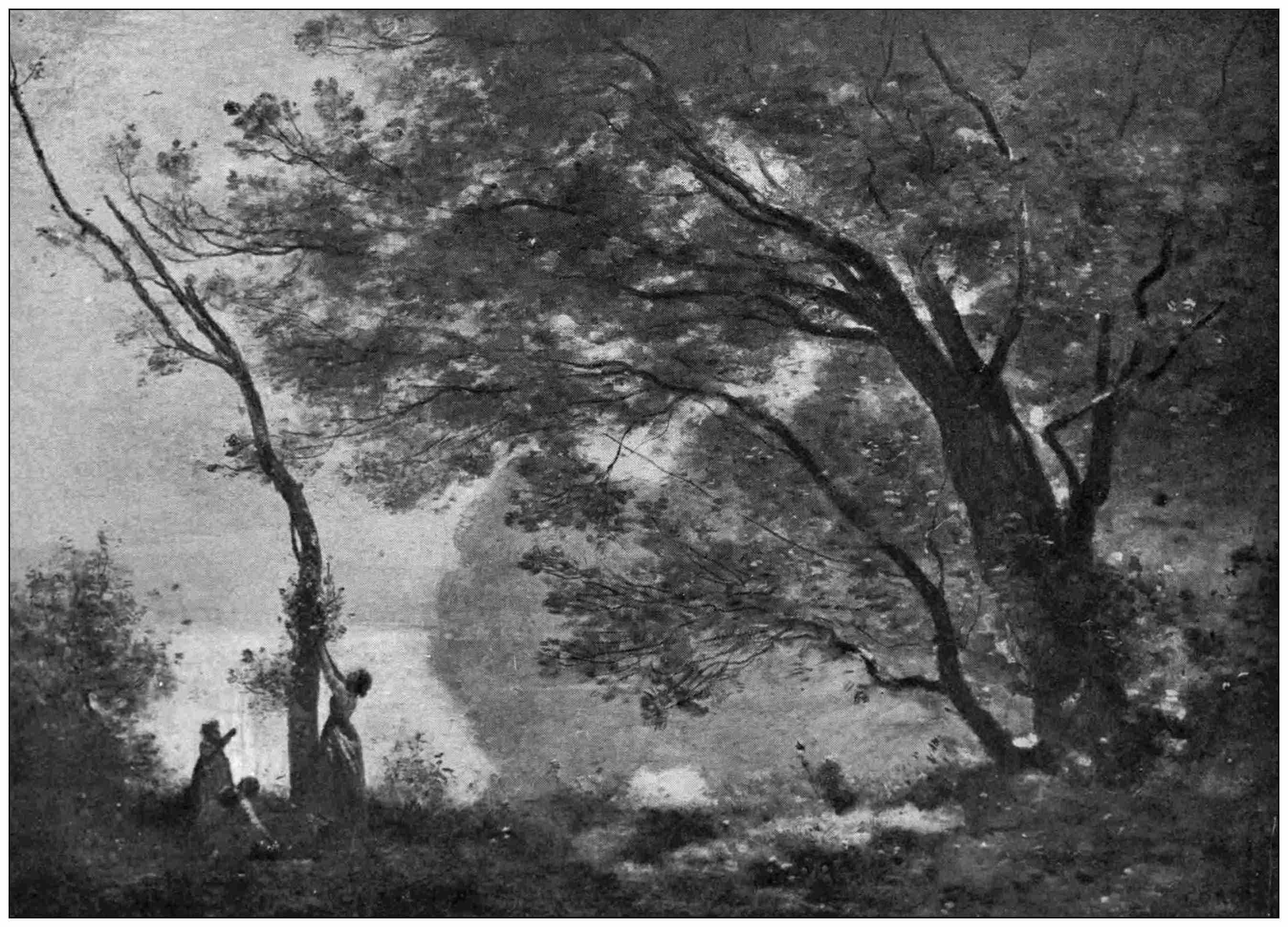 One of the most delightful of landscape painters is Corot, whose work has a lightness of touch, and a kind of happiness in its delicate sentiment, which are altogether his own. He is another painter who arrived at ease of execution through beginning carefully and hardly. There are some of his early pictures of Rome in the Louvre, very beautiful, and, at the same time, very hard and[103] precise; and I have seen drawings—life studies—of his, all elaborately worked with the hard pencil-point. He was able to paint, or to suggest a tree, in the most delicate way. Constable, Rousseau, and Lawson preferred the sterner and stronger trees—the elm or the oak—but Corot loved the delicate trees, especially the willow, and effects of twilight or dawn; and he rendered the mystery produced by tiny interlacing leaves, which look sometimes like a mist against the sky, in a very beautiful way, which was, I think, his own. But this is only an incidental beauty of his work, which is remarkable in its expression of the clearness and fresh beauty of nature; although, as compared with Turner, his range is very limited, and we feel his mannerisms when comparing him with Rousseau.
