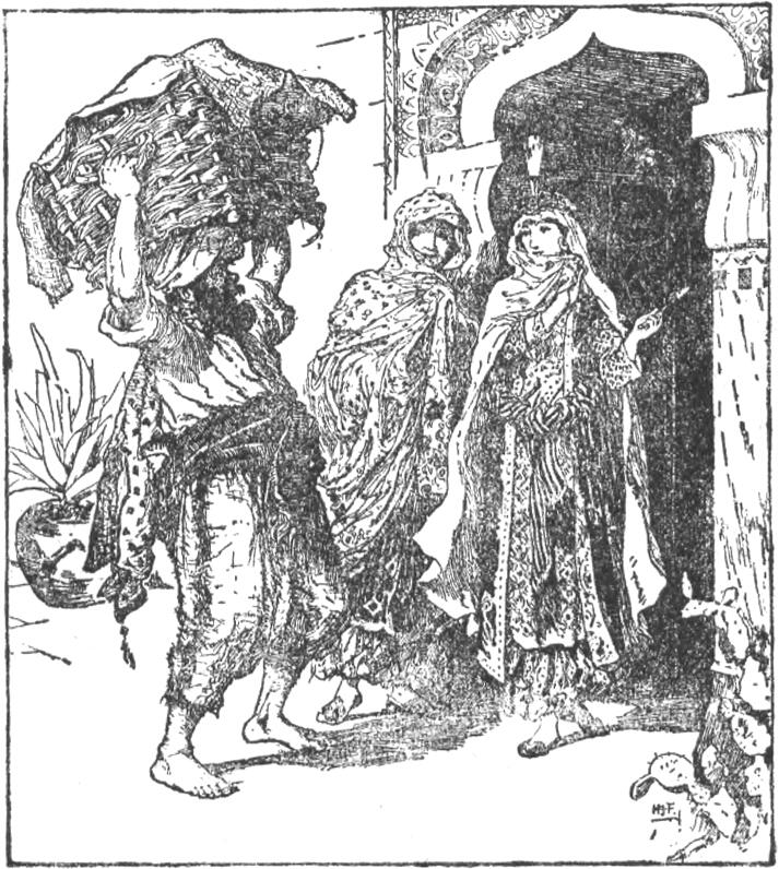 Amina és Szafia megfogták a kosarat, segített Szobeida is, s letették a földre. Aztán a kosár kiürítéséhez láttak s mikor ezzel elkészültek, Amina gazdagon megajándékozta a hordárt. Meg volt elégedve a hordár a pénzzel, akart is távozni, de csak állott, állott egy helyben s gyönyörködött a három leány szépségében. De nemcsak gyönyörködött, hanem csudálkozott is. Azon csodálkozott, hogy az egész házban egy férfi nem sok, annyit sem látott. Pedig az a sok minden jó, amit ide cipelt, arra vallott, hogy valami nagy dínom-dánomra készülnek itt.