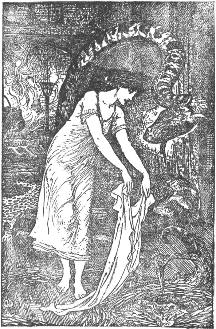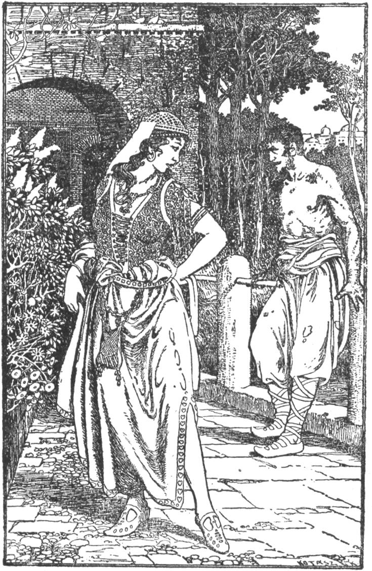 – Nagyságos asszonyom, – felelt a hordár, – ezek az urak azt szeretnék tudni, hogy ha már megkorbácsoltad a két kis kutyát, miért sírtál velök és miért csókoltad meg? És elájult nővérednek miért van teste sebekkel borítva? Im, ez az, amire megkértek, hogy nevökben kérdezzem meg tőled.