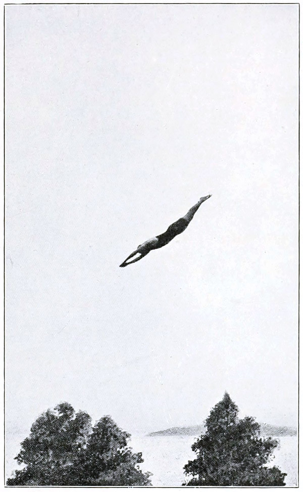 Perhaps it may be interesting to mention the difference between a plain English dive and a plain Swedish dive. As regards the positions—the English dive is taken with the hands pointed straight up above the head, from the tips of the fingers to the end of the toes the body ought to be in a straight line. The Swedish plain dive is the swallow dive, so called from the position of the hands and arms out from the shoulders at almost right angles. During the flight [Pg 67]through the air the back is hollowed as much as possible. A man doing a high running swallow dive greatly resembles a bird swooping down, and the beauty of line that the best divers manage to get into it is remarkable.