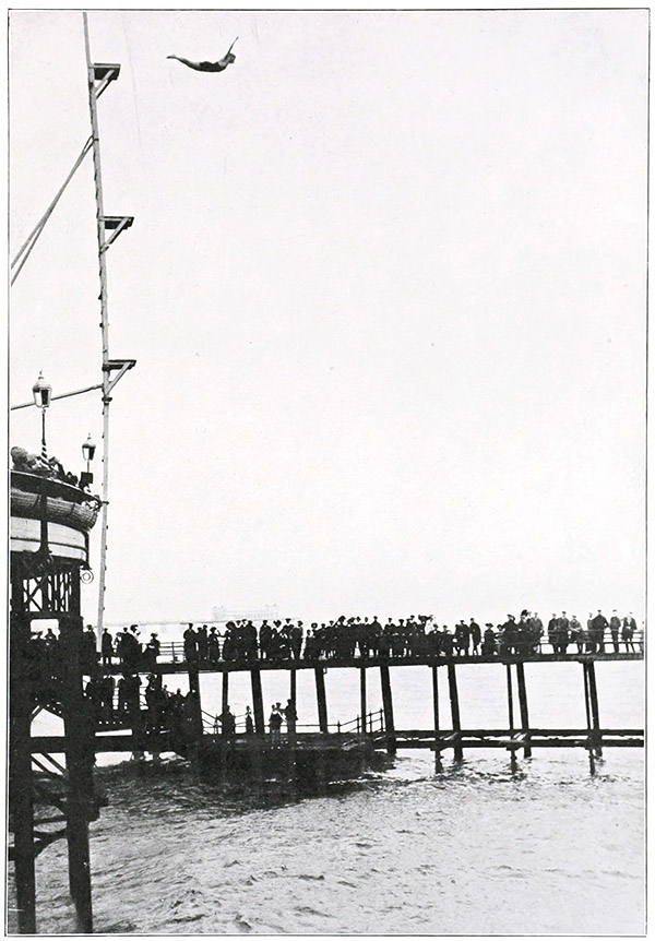 I think that the beauty in the art of diving is greatly under-valued, and gracefulness not nearly enough insisted on in the teaching of it; like all other physical exercises unless fitness and beauty of the body are the aim of the exerciser, they ought to be left alone, little good will certainly be gathered from any form of exercise if it is entered into merely in the spirit of competition, and not with the wish to improve the body and the mind. Most exercises of a vigorous kind will help a person mentally: [Pg 68]for instance, the mind would have to be a seething mass of corruption if it was past being helped by the contact and feel of cold water after a rush through the air from a height; unclean and impure thoughts that crowd gaily and with little shame under the electric lights in a crowded restaurant would not venture to show themselves when the body is tingling and the mind rioting with joy from a swift rush through the sunlit air into a still pool in a river, or even into the green depths of a swimming-bath. No; exercise aided by cold clean water and fresh air do not walk hand in hand with uncleanliness of spirit, and if only this was more understood and realised by parents, how much unhappiness and peril might be saved their children. As to the teaching of children—swimming ought to be taught to all and taught in the right spirit—not regarded as a means to clutch a gold medal from some less fortunate brother or sister, but a glorious means of helping themselves mentally and physically, and an [Pg 69]exercise that ought to be put within the reach of rich and poor; and, I feel most strongly, taught, as all physical exercises should be taught, to man and woman, as a weapon to combat through life temptations and sorrows which come to all on life’s journey. It is only necessary to watch small children splash about in pool or bath to understand what great joy can be given them and in a very easy manner. Taught and helped they make marvellous progress and even the quite small ones will strive to perfect themselves in stroke or dive—also love of the water seems to breed good temper and good fellowship, therefore surely that love is to be encouraged. As to the harm that can be got from swimming I think it is the same that can be found in any exercise that is practised in a harmful manner. Overstrain is particularly liable in children who are allowed and encouraged to race each other until their hearts are bumping, which also leads to bad swimming. I am sure no serious racing ought to be [Pg 70]allowed to the young until the strokes are sure and perfect.