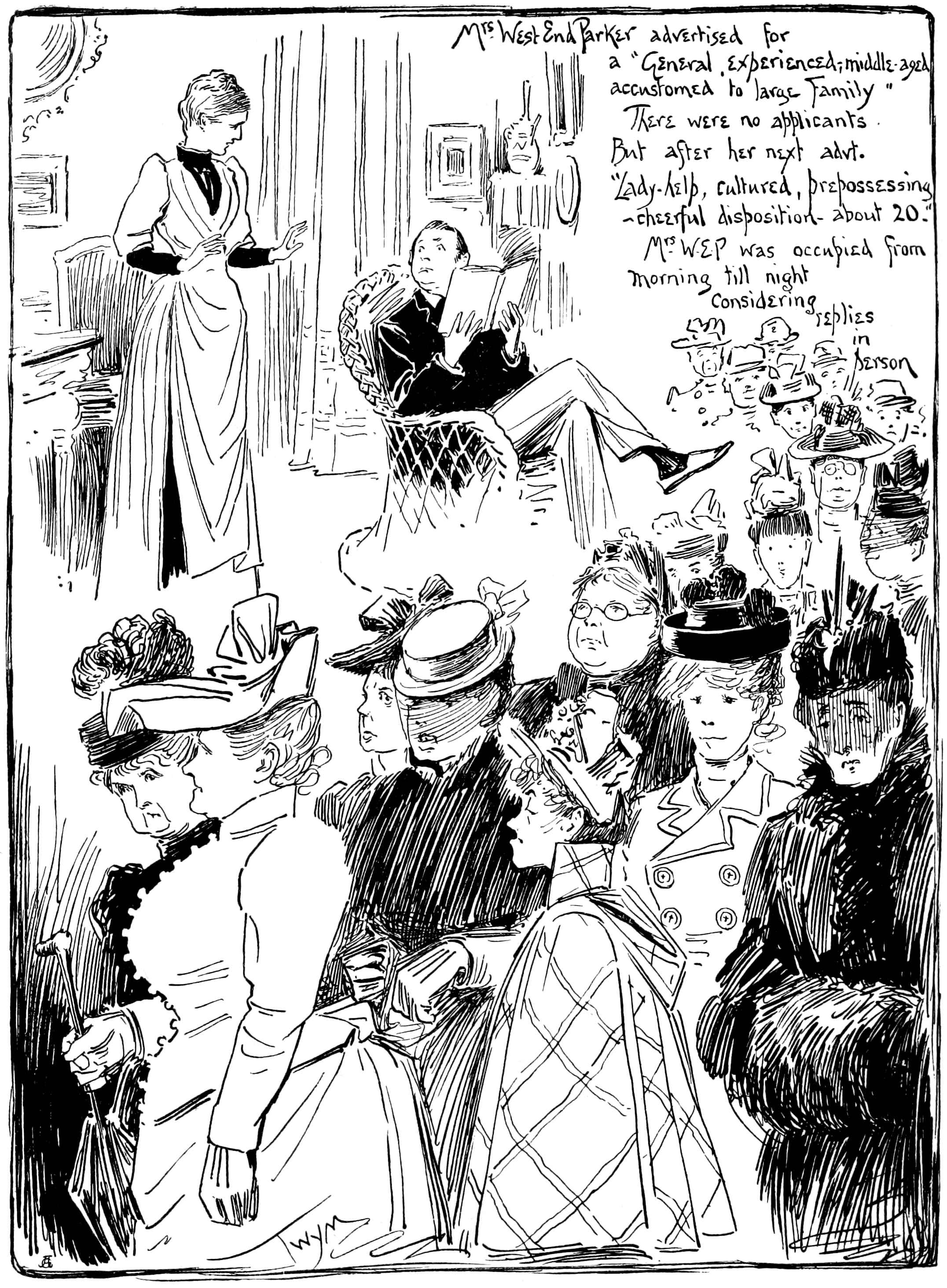 Mrs. West End Parker advertised for a “General, experienced, middle-aged accustomed to large Family” There were no applicants. But after her next advt. “Lady-help, cultured, prepossessing—cheerful disposition—about 20.” Mrs. W. E. P. was occupied from morning till night considering replies in person