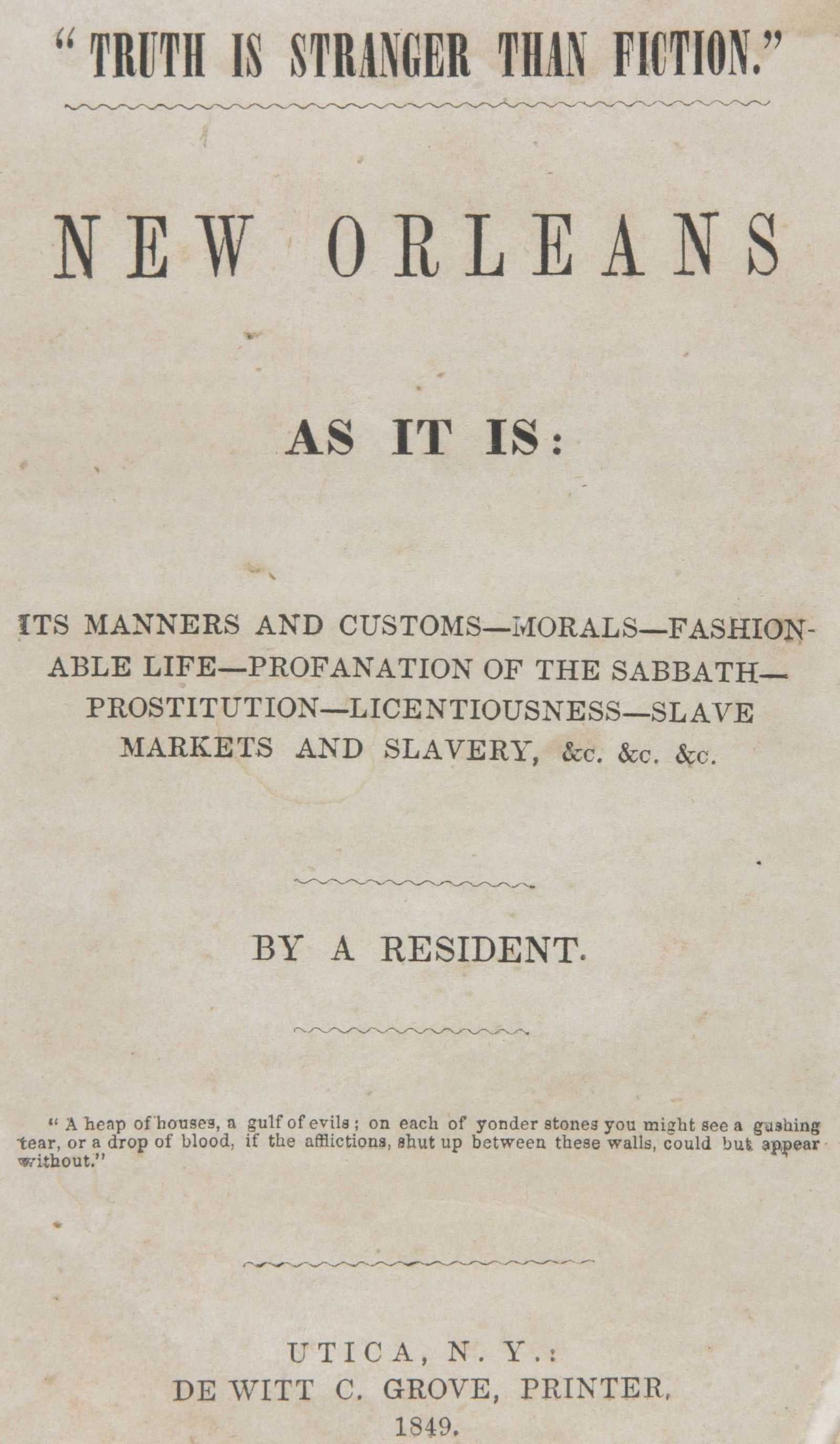 A portrait of the city of New Orleans is a living picture of the world, and in this particular, it differs from every other city; for here the world is concentrated, in a living spectacle of almost every nation, kindred, and tongue, and from whom are poured out the baser passions that dictate the actions of men, in all the variety of shade and color, that can come up from the dark recesses of the human soul. And it is here we find the great mass of human beings, moved upon by impulses as strange and mysterious and incomprehensible, as is their own future destiny.