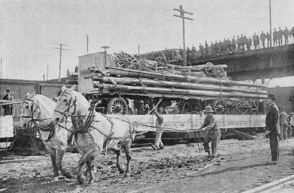 The poles had held. Six men had gambled with death and won. Ten minutes later, it all was forgotten in a new struggle, as the spool wagons came forward and workmen strove to make them cope with loads which tripled in size and weight their usual capacity.