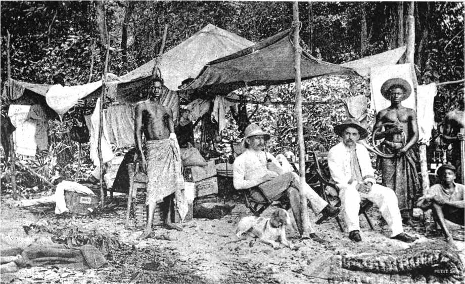 L’étape, sous les averses répétées, avait été très dure, le terrain coupé de marigots et de fondrières, la broussaille impitoyable. Les deux tiers de nos porteurs étaient restés en route, y compris, cela va sans dire, les individus chargés des provisions de bouche, des hardes et de la literie. Je nous vois encore défaits, boueux, ne possédant pour tous effets de rechange que nos pèlerines en caoutchouc, prêts à passer la nuit dans ce déshabillé, sous un abri de palmes, après une collation de venaison boucanée et d’ignames cuites sous la cendre.