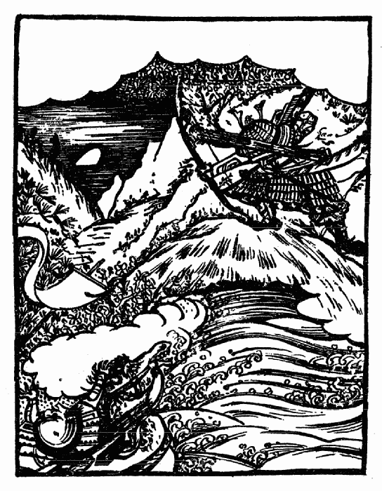 Extraits d’eux-mêmes, transportés, leur être transi pénétré de chaleur et de fraîcheur à la fois, ils regardèrent au-dessus de l’Arbre vénérable et là, plus haute que lui, debout sur le promontoire de la caverne céleste, dominant le bloc énorme, ils virent s’avancer vêtue d’une robe de lumière, Ameno-Kamato. Ses mains aux doigts recourbés dans leurs ongliers d’argent couraient le long d’un instrument inconnu, formé de cordes tendues les unes à côté des autres, jaunes sous ses gestes pâles. Et ils reconnurent qu’il était fait de grands arcs de shoguns allongés aussi les uns à côté des autres, croisés par deux, liés ensemble.