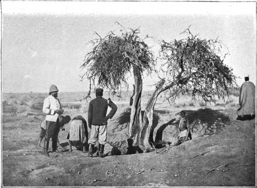 « Peu de temps après, un Bérabich, Brahim Ould Omar Ould Salah, des Ouled Sliman, passant par là, vit auprès de l’arbre athilé des membres humains, que des oiseaux becquetaient. Il les enterra. Un jour, bien long-temps après, cet homme entendit raconter l’histoire de l’Anglais ; il se souvint d’avoir enterré des ossements et dit alors : « C’est moi qui les ait enterrés, pensant que c’étaient les restes d’un Musulman ; si j’avais su, je les aurais bien laissés là ». Ces souvenirs étaient toujours restés dans ma mémoire, et il y a quelques années, en revenant de Tombouctou en compagnie de Feradji et d’Himmid, fils de Labeida, je demandai à Feradji de passer par l’arbre athilé. Nous étions à ce moment dans une vallée entre Tombouctou et Laouessi. C’est ici-même,[51] me dit Feradji, que l’Anglais a été tué, et il me montra un arbre assez voisin. Himmid demanda à voir l’endroit même, et on s’y rendit. Je demandai alors à Feradji : « Avait-il beaucoup de caisses ? Deux ou trois, me fut-il répondu, et environ dix à quinze pièces d’or ; mais nous avons mis les caisses dans un trou avec du feu, car il venait pour empoisonner le pays et nous nous sommes bouché le nez en les brûlant ».