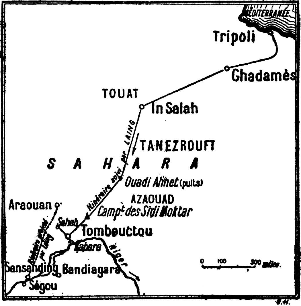 Enfin Laing allait être payé d’une partie de ses peines par un premier succès. Le 18 avril 1826, treize mois après son départ de Tripoli, il voyait enfin, sur leurs dunes de sable, se dresser les hautes maisons et les minarets de la ville mystérieuse qu’il était le premier Européen à contempler.