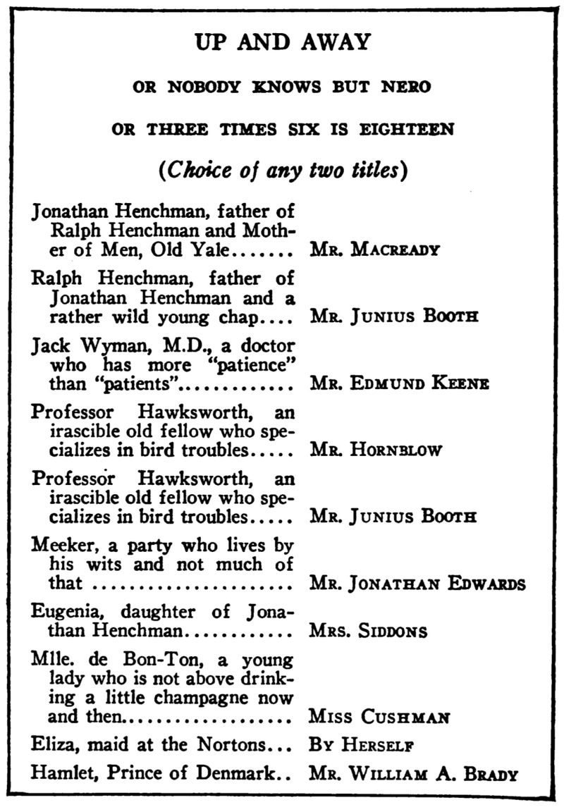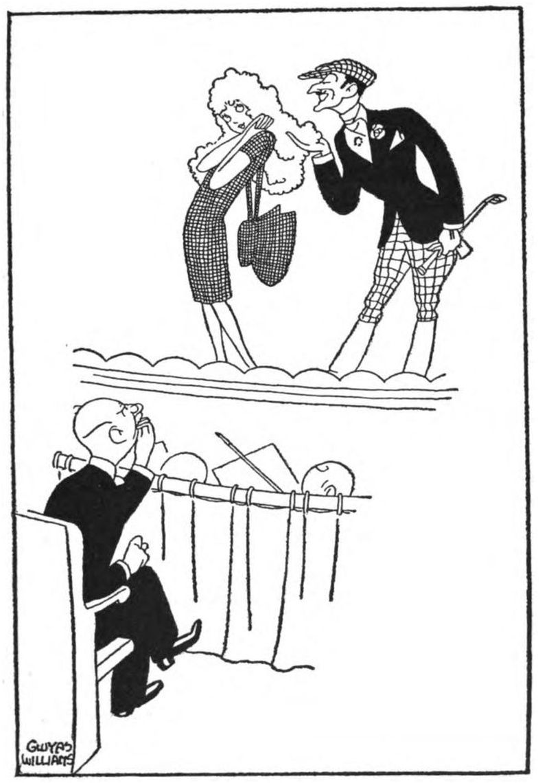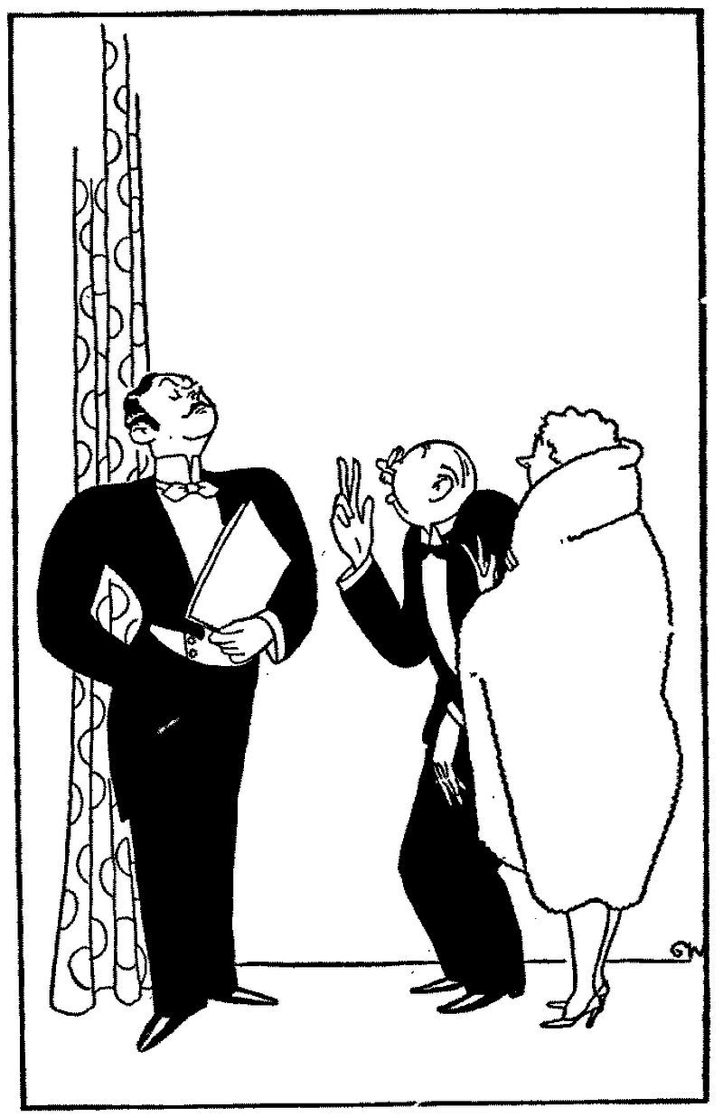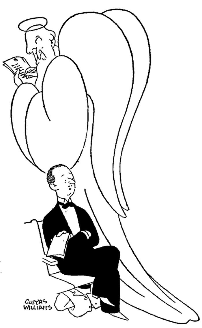 Now, in my case, the prospects are even more depressing, because the job from which I eke out barely enough money to buy gin for my children makes it necessary that I attend the opening performances[Pg 253] of all these wrath-provoking shows. I don’t like them. I would never go to see them if it were not for the fact that it is my life-work. Often I sit [Pg 254]through them with my eyes shut. But I am unquestionably on record in the office of the Snooping Angel as sitting in D-113 at the Winter Garden. And when they are making out their lists for culprits to be hit on the head by falling walls or swirled up into the skies on a fiery horse with nine heads, my name probably is right there among the “B’s” as a constant and incorrigible attendant at these festivals of sin. The angel probably doesn’t do more than take a look over the audience. You can’t expect him to go to the box-office and see who paid to get in or find out why they are there.
