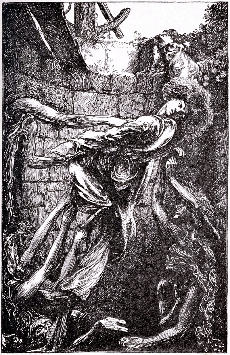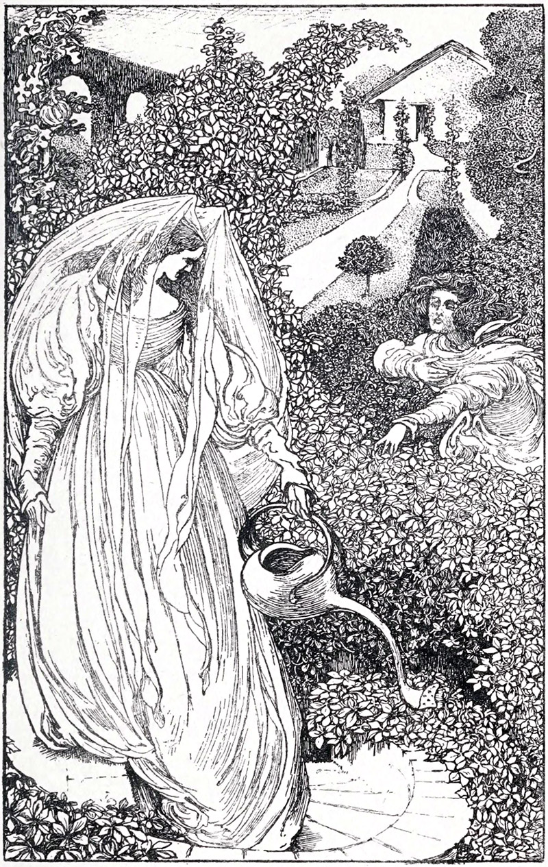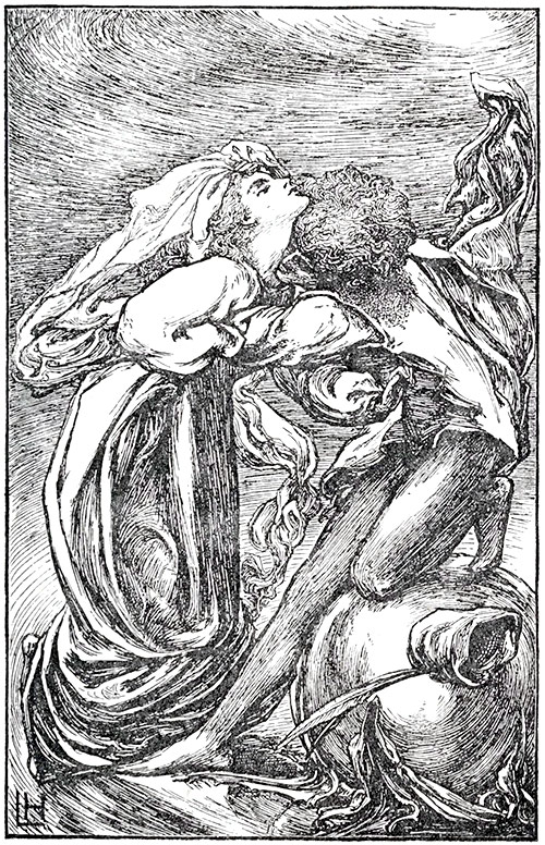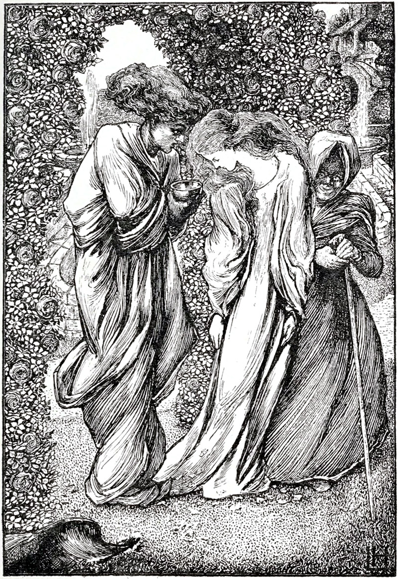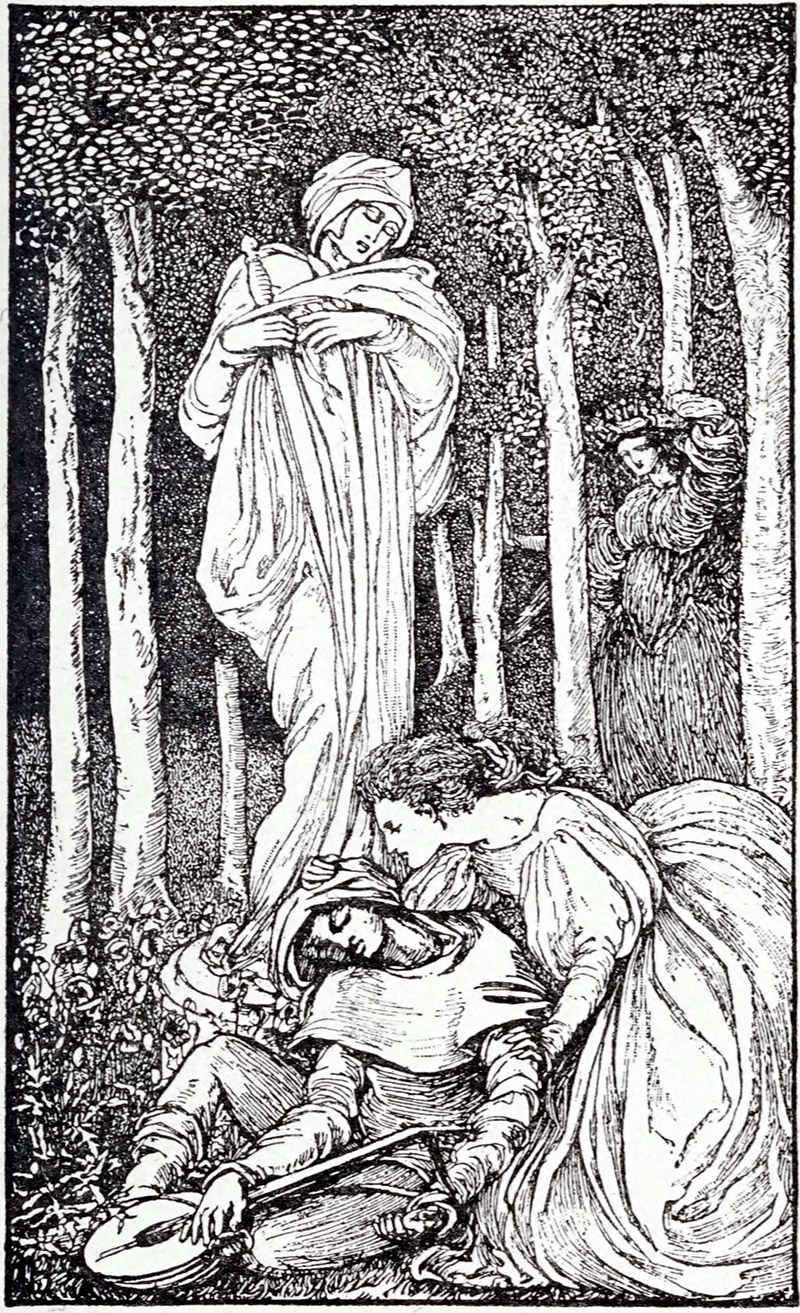 The odd man drew out his sword and laughed; on the end of it was a tiny drop of blood. The poor little queen ran up, and bent down to look in her lover’s face, to know if he were really hurt. And then a terrible thing happened.