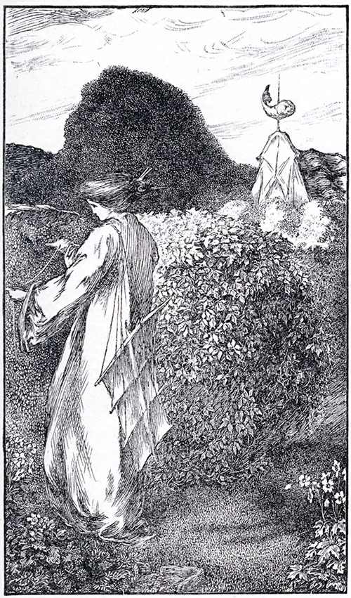 Then Knoonie, casting his eyes all round for anything to help, saw a new sight. All down the broad avenues of the park a movement was taking place from the earth upwards: it came nearer and nearer: it was like a green army on the march: it waved long prickly spears and many-pointed crests, and sent green things like lizards swarming into the high trees that stood in its way. Up and up, closer and higher to the very gates of the palace it came—a wall of thistles, magic in strength and stature, over-ranked by beetling heads of hemlock, and under-run by long snakey loops of bramble, that writhed in and out of the earth like huge worms.